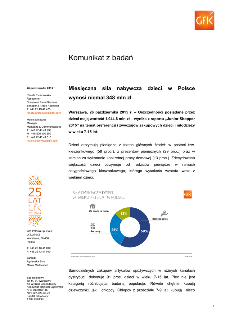 Komunikat z badań 26 października 2015 r. Renata Twardowska Researcher Consumer Panel Services Shopper & Trade Research T: +48 22 43 41 475 [email protected] Maciej Siejewicz Manager Marketing & Communications T : +48 22 43 41 239 M : +48 500 100 500 F : +48 22 43 41 010 [email protected] Miesięczna siła nabywcza dzieci w Polsce wynosi niemal 348 mln zł Warszawa, 26 października 2015 r. – Oszczędności posiadane przez dzieci mają wartość 1.044,6 mln zł – wynika z raportu „Junior Shopper 2015” na temat preferencji i zwyczajów zakupowych dzieci i młodzieży w wieku 7-15 lat. Dzieci otrzymują pieniądze z trzech głównych źródeł: w postaci tzw. kieszonkowego (58 proc.), z prezentów pieniężnych (29 proc.) oraz w zamian za wykonanie konkretnej pracy domowej (13 proc.). Zdecydowana większość dzieci otrzymuje od rodziców pieniądze w ramach cotygodniowego kieszonkowego, którego wysokość wzrasta wraz z wiekiem dzieci. GfK Polonia Sp. z o.o. ul. Ludna 2 Warszawa, 00-406 Polska T: +48 22 43 41 000 F: +48 22 43 41 010 Zarząd: Agnieszka Sora Marek Markiewicz Samodzielnych zakupów artykułów spożywczych w różnych kanałach Sąd Rejonowy dla M. St. Warszawy XII Wydział Gospodarczy Krajowego Rejestru Sądowego KRS 0000163116 NIP: 527-020-35-72 Kapitał zakładowy: 1 500 000 PLN dystrybucji dokonuje 91 proc. dzieci w wieku 7-15 lat. Płeć nie jest kategorią różnicującą badaną populację. Równie chętnie dziewczynki, jak i chłopcy. Chłopcy z przedziału 7-9 lat. kupują kupują nieco 1 rzadziej (75 proc. deklaracji) niż dziewczynki (91 proc. deklaracji), natomiast wysoki poziom obydwu odsetków świadczy o i tak dużej aktywności zakupowej dzieci. Najczęściej kupowane przez dzieci artykuły spożywcze to słodycze (82 proc.), napoje (80 proc.) oraz przekąski (79 proc.). Dwa najczęściej odwiedzane przez dzieci miejsca, w których zaopatrują się w artykuły spożywcze to tradycyjny sklep spożywczy i sklepik szkolny. W tym pierwszym bywa nieco więcej osób, natomiast ten drugi odwiedzają częściej. Bezpośredni wpływ dzieci na decyzje zakupowe rodziców Niemal wszyscy rodzice zabierają swoje dzieci na zakupy artykułów spożywczych. W tym czasie prawie 60 proc. dzieci nalega na kupno jakiegoś produktu lub produktu konkretnej marki. Najwięcej dzieci namawia rodziców na zakup słodyczy (59 proc.). Dodatkowe informacje o badaniu Raport „Junior Shopper 2015” zawiera również informacje o preferowanych przez dzieci markach produktów z kategorii FMCG, o wpływie dzieci na zakupy produktów z kategorii elektroniki użytkowej oraz o korzystaniu z tych produktów, a także o tym, jaki odsetek dzieci w wieku 7-15 lat korzysta z usług finansowych (np. posiada konta bankowe). 2 Powyższe analizy zostały opracowane na podstawie trzech niezależnych badań GfK. Pierwsze badanie przeprowadzono metodą wywiadów bezpośrednich PAPI (Paper and Pencil Interview) z dziećmi w wieku 7-15 lat (self-completion dla starszych dzieci) oraz z ich rodzicami. Całkowita wielkość próby N=300 rodziców + N=300 dzieci (przedziały wiekowe dzieci: 7-9 lat, 10-12 lat, 13-15 lat). Drugie badanie przeprowadzono na próbie N=900 rodziców dzieci w wieku 7-15 lat metodą wywiadów bezpośrednich CAWI (Computer Assisted Web Interview) na internetowym panelu GfK Access Panel liczącym ponad 140 tys. panelistów. Trzecim źródłem analiz są dane pochodzące z prowadzonego od 20 lat Panelu Gospodarstw Domowych GfK. Jego próbę stanowi 8 tys. polskich gospodarstw domowych zbierających dane za pomocą skanerów i raportujących o dokonywanych przez siebie zakupach produktów FMCG. KONIEC Więcej informacji Maciej Siejewicz T: +48 (22) 43 41 239 M: +48 500 100 500 [email protected] GfK Instytut GfK jest zaufanym źródłem rzetelnych informacji o rynku i konsumentach. Umożliwia podejmowanie trafniejszych decyzji. Łączy pasję badawczą 13.000 ekspertów. Posiada wieloletnie doświadczenie w analizowaniu i interpretowaniu danych. Dostarcza analiz, zarówno na poziomie globalnym, jak i rynków lokalnych, w ponad 100 krajach. Dzięki stosowaniu innowacyjnych rozwiązań łączących technologię i naukę, zmienia "big data" w "smart data", zwiększając przewagę konkurencyjną swoich klientów i jednocześnie wzbogacając doświadczenia i decyzje konsumentów. 3