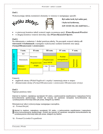 Word lab3 - tabele i rysunki 1 Zad.1. Wykorzystując tabelę rozmieścić elementy w wierszu w następujący sposób: Był sobie król, był sobie paź, i była też królewna, żyli wśród róż, nie znali burz.... • • w pierwszej komórce tabeli wstawić napis za pomocą opcji: Wstaw/Rysunek/WordArt w drugiej komórce wstawić dowolny clip (Wstaw/Rysunek/ClipArt). Zad.2. Do dokumentu z zadaniem 1 dodać poniższą tabelę. Na początek wstawić tabelę o 8 wierszach i 6 kolumnach a następnie wykorzystać scalanie komórek oraz opcję Format/Obramowanie i cieniowanie): II sem. III sem. IV sem. V sem. WF Matematyka Wykład Projektowanie Programowanie Podstawy Delphi monograficzny stron WWW j. ang j. niem. Informatyki dyplomowe Ekonomia Seminarium PROGRAM STUDIÓW I sem. Sieci Ustawić: • nagłówek strony (Widok/Nagłówek i stopka) i numerację stron w stopce • obramowanie strony (Format/Obramowanie i cieniowanie Obramowanie strony) Zad.3. Napisać poniższy tekst Internet to medium, największy wynalazek XX wieku, a jednocześnie współczesna i najszybsza forma komunikowania społecznego. Zrodził się inaczej niż epokowe narzędzia komunikowania się i przekazywania informacji takie jak prasa, telegraf czy telefon. Sformatować tekst wykorzystując następujące narzędzia. a) Format/Inicjał, I nternet to medium, największy wynalazek XX wieku, a jednocześnie współczesna i najszybsza forma komunikowania społecznego. Zrodził się inaczej niż epokowe narzędzia komunikowania się i przekazywania informacji takie jak prasa, telegraf czy telefon. b) Format/Czcionka/Uwypuklenie Ćwiczenia z Worda Word lab3 - tabele i rysunki 2 c) na końcu tekstu umieścić przypis (widoczny pod znakiem 1 na dole strony Wstaw/Przypis) d) ustawić marginesy dla akapitu (Format/Akapit - 2cm z prawej, 1cm z lewej, przed 12pkt, po 12 pkt) oraz 1.5 odstępu między wierszami e) wstawić rysunek z pliku: Wstaw/Rysunek oraz wykorzystać prawy klawisz do sformatowania rysunku (Formatuj rysunek – Układ i Położenie) Końcowy efekt powinien wyglądać jak poniżej: JJeeggoo rroozzw wóójj ttoo nniiee jjeeddeenn ssppeekkttaakkuullaarrnnyy w wyynnaallaazzeekk uulleeppsszzaannyy cczzyy m mooddyyffiikkoow waannyy jjeeddyynniiee,, aallee pprraaccaa ggrroonnaa nnaauukkoow wccóów w ii tteecchhnniikkóów w w w ssttoossuunnkkoow woo ddłłuuggiim m cczzaassiiee.. O Obbeeccnniiee jjeesstt rreeaalliizzoow waannyy nnoow wyy pprroojjeekktt-- IInntteerrnneett IIII.. CCeelleem m ttyycchh pprraacc jjeesstt ssttw woorrzzeenniiee ssiieeccii w wyyżżsszzeejj ggeenneerraaccjjii,, kkttóórraa uum moożżlliiw wii pprrzzeessłłaanniiee ddaannyycchh zz pprręęddkkoośścciiaam mii ddoocchhooddzząąccyym mii ddoo kkiillkkuu ggiiggaabbaajjttóów w nnaa sseekkuunnddęę ttzzw w..G Gbbppss.. M Maa oonnaa bbyyćć ttaakkżżee bbooggaattsszzaa oo kkiillkkaa nnoow wyycchh 11 rreew woolluuccyyjjnnyycchh uussłłuugg..1 Zad.4. Zaprojektować i wykonać swoją wizytówkę, np.: Ministerstwo Głupich Kroków Prof. Jan Kowalski Specjalista Adres prywatny: Warszawa ul. Mądra 45 1 Tel: 600 101010 M. Sławik, A. Bremer, „Elementy informatyki dla szkół średnich”, Katowice 2000, s.332-335. Ćwiczenia z Worda