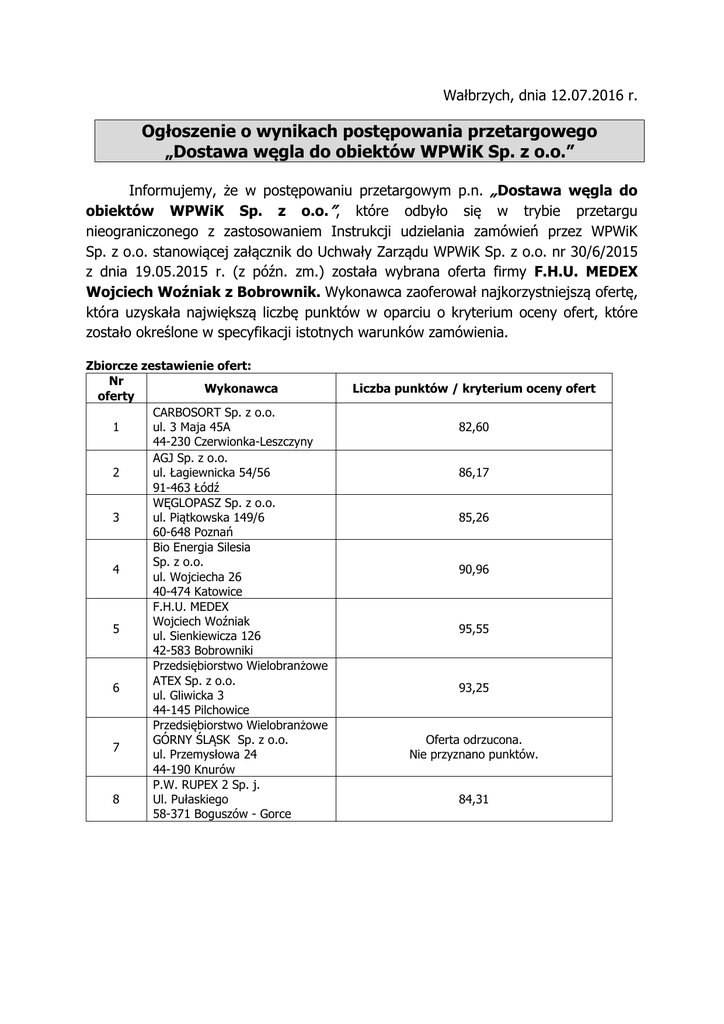 Wałbrzych, dnia 12.07.2016 r. Ogłoszenie o wynikach postępowania przetargowego „Dostawa węgla do obiektów WPWiK Sp. z o.o.” Informujemy, że w postępowaniu przetargowym p.n. „Dostawa węgla do obiektów WPWiK Sp. z o.o.”, które odbyło się w trybie przetargu nieograniczonego z zastosowaniem Instrukcji udzielania zamówień przez WPWiK Sp. z o.o. stanowiącej załącznik do Uchwały Zarządu WPWiK Sp. z o.o. nr 30/6/2015 z dnia 19.05.2015 r. (z późn. zm.) została wybrana oferta firmy F.H.U. MEDEX Wojciech Woźniak z Bobrownik. Wykonawca zaoferował najkorzystniejszą ofertę, która uzyskała największą liczbę punktów w oparciu o kryterium oceny ofert, które zostało określone w specyfikacji istotnych warunków zamówienia. Zbiorcze zestawienie ofert: Nr Wykonawca oferty CARBOSORT Sp. z o.o. 1 ul. 3 Maja 45A 44-230 Czerwionka-Leszczyny AGJ Sp. z o.o. 2 ul. Łagiewnicka 54/56 91-463 Łódź WĘGLOPASZ Sp. z o.o. 3 ul. Piątkowska 149/6 60-648 Poznań Bio Energia Silesia Sp. z o.o. 4 ul. Wojciecha 26 40-474 Katowice F.H.U. MEDEX Wojciech Woźniak 5 ul. Sienkiewicza 126 42-583 Bobrowniki Przedsiębiorstwo Wielobranżowe ATEX Sp. z o.o. 6 ul. Gliwicka 3 44-145 Pilchowice Przedsiębiorstwo Wielobranżowe GÓRNY ŚLĄSK Sp. z o.o. 7 ul. Przemysłowa 24 44-190 Knurów P.W. RUPEX 2 Sp. j. 8 Ul. Pułaskiego 58-371 Boguszów - Gorce Liczba punktów / kryterium oceny ofert 82,60 86,17 85,26 90,96 95,55 93,25 Oferta odrzucona. Nie przyznano punktów. 84,31