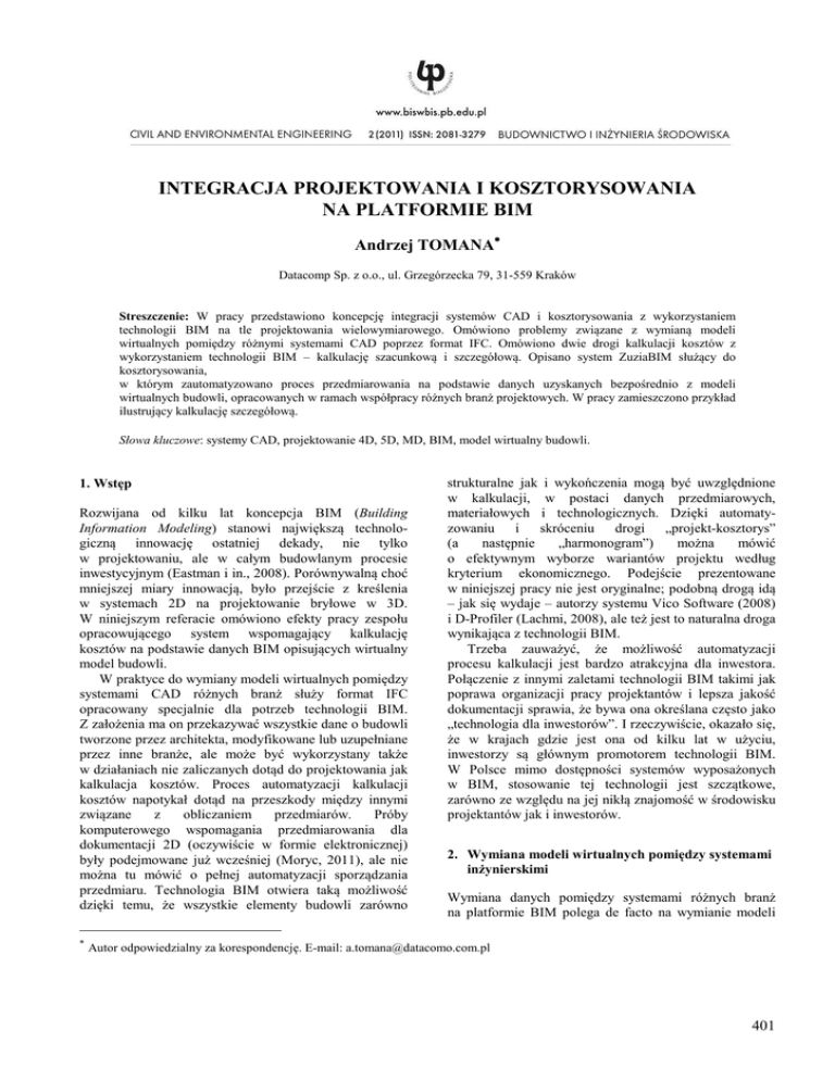 INTEGRACJA PROJEKTOWANIA I KOSZTORYSOWANIA NA PLATFORMIE BIM Andrzej TOMANA∗ Datacomp Sp. z o.o., ul. Grzegórzecka 79, 31-559 Kraków Streszczenie: W pracy przedstawiono koncepcję integracji systemów CAD i kosztorysowania z wykorzystaniem technologii BIM na tle projektowania wielowymiarowego. Omówiono problemy związane z wymianą modeli wirtualnych pomiędzy różnymi systemami CAD poprzez format IFC. Omówiono dwie drogi kalkulacji kosztów z wykorzystaniem technologii BIM – kalkulację szacunkową i szczegółową. Opisano system ZuziaBIM służący do kosztorysowania, w którym zautomatyzowano proces przedmiarowania na podstawie danych uzyskanych bezpośrednio z modeli wirtualnych budowli, opracowanych w ramach współpracy różnych branż projektowych. W pracy zamieszczono przykład ilustrujący kalkulację szczegółową. Słowa kluczowe: systemy CAD, projektowanie 4D, 5D, MD, BIM, model wirtualny budowli. 1. Wstęp Rozwijana od kilku lat koncepcja BIM (Building Information Modeling) stanowi największą technologiczną innowację ostatniej dekady, nie tylko w projektowaniu, ale w całym budowlanym procesie inwestycyjnym (Eastman i in., 2008). Porównywalną choć mniejszej miary innowacją, było przejście z kreślenia w systemach 2D na projektowanie bryłowe w 3D. W niniejszym referacie omówiono efekty pracy zespołu opracowującego system wspomagający kalkulację kosztów na podstawie danych BIM opisujących wirtualny model budowli. W praktyce do wymiany modeli wirtualnych pomiędzy systemami CAD różnych branż służy format IFC opracowany specjalnie dla potrzeb technologii BIM. Z założenia ma on przekazywać wszystkie dane o budowli tworzone przez architekta, modyfikowane lub uzupełniane przez inne branże, ale może być wykorzystany także w działaniach nie zaliczanych dotąd do projektowania jak kalkulacja kosztów. Proces automatyzacji kalkulacji kosztów napotykał dotąd na przeszkody między innymi związane z obliczaniem przedmiarów. Próby komputerowego wspomagania przedmiarowania dla dokumentacji 2D (oczywiście w formie elektronicznej) były podejmowane już wcześniej (Moryc, 2011), ale nie można tu mówić o pełnej automatyzacji sporządzania przedmiaru. Technologia BIM otwiera taką możliwość dzięki temu, że wszystkie elementy budowli zarówno ∗ strukturalne jak i wykończenia mogą być uwzględnione w kalkulacji, w postaci danych przedmiarowych, materiałowych i technologicznych. Dzięki automatyzowaniu i skróceniu drogi „projekt-kosztorys” (a następnie „harmonogram”) można mówić o efektywnym wyborze wariantów projektu według kryterium ekonomicznego. Podejście prezentowane w niniejszej pracy nie jest oryginalne; podobną drogą idą – jak się wydaje – autorzy systemu Vico Software (2008) i D-Profiler (Lachmi, 2008), ale też jest to naturalna droga wynikająca z technologii BIM. Trzeba zauważyć, że możliwość automatyzacji procesu kalkulacji jest bardzo atrakcyjna dla inwestora. Połączenie z innymi zaletami technologii BIM takimi jak poprawa organizacji pracy projektantów i lepsza jakość dokumentacji sprawia, że bywa ona określana często jako „technologia dla inwestorów”. I rzeczywiście, okazało się, że w krajach gdzie jest ona od kilku lat w użyciu, inwestorzy są głównym promotorem technologii BIM. W Polsce mimo dostępności systemów wyposażonych w BIM, stosowanie tej technologii jest szczątkowe, zarówno ze względu na jej nikłą znajomość w środowisku projektantów jak i inwestorów. 2. Wymiana modeli wirtualnych pomiędzy systemami inżynierskimi Wymiana danych pomiędzy systemami różnych branż na platformie BIM polega de facto na wymianie modeli Autor odpowiedzialny za korespondencję. E-mail: [email protected] 401 Civil and Environmental Engineering / Budownictwo i Inżynieria Środowiska 2 (2011) 401-406 traktowanych jako zespół danych geometrycznych, materiałowych i wielu innych, zgodnie z technologią BIM. W tym celu w ramach organizacji BSA (Building Smart Alliance) opracowano otwarty i ogólnodostępny format IFC (Industry Foundation Class), który obecnie aspiruje do standardu ISO i będzie dostępny jako ISO 16739. Ma on służyć do wymiany pełni danych o modelu budowli. Format IFC ma budowę hierarchiczną – od projektu, poprzez obiekty określone przez projektanta i elementy, dla których podane są dane szczegółowe (rys. 1). Wspomniane „obiekty” zostają określone przez projektanta i powinny odzwierciedlać strukturę budowli, na przykład podział na kondygnacje, segmenty i tym podobne charakterystyczne części budowli co ułatwia identyfikację elementów i korzystanie z dokumentacji. W praktyce bywa bardzo różnie; niejednokrotnie do danej kondygnacji projektant zalicza na przykład ściany kondygnacji sąsiedniej lub wprowadza mylne określenia, które zostaną przeniesione do pliku IFC. Z naszego doświadczenia jako twórcy przeglądarki interpretującej format IFC wynika także, że systemy CAD często błędnie obliczają niektóre dane, np. powierzchnie lub objętości. Powoduje to konieczność weryfikowania i obliczania tych wielkości niezależnie od wartości zapisanych w IFC przez systemy CAD. Przykładową postać takiego pliku pokazano na rysunku 2. Format IFC jest ciągle rozwijany i udoskonalany, obecnie dostępna jest wersja IFC 2x3 z 2007 roku, a do testów udostępniona jest wersja IFC 2x4 z roku 2010. Organizacja BSA skupia wszystkich liczących się producentów oprogramowania, a do najaktywniejszych firm należą Graphisoft, producent Archicada dla architektów i DDS, producent systemu DDS-CAD dla instalatorów. 3. Integracja branż na platformie BIM Dzięki wymianie danych poprzez format IFC, pomiędzy różnymi systemami wyposażonymi w BIM istnieje możliwość integracji działań wszystkich uczestników przedsięwzięcia budowlanego. Rysunek 3 ilustruje jak ta współpraca jest realizowana w warstwie technicznej pomi