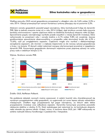 Silna końcówka roku w gospodarce January 26, 2016 Według szacunku GUS wzrost gospodarczy przyspieszył w ubiegłym roku do 3,6% wobec 3,3% w roku 2014. Odczyt przewyższył tym samym konsensus rynkowy plasujący się na poziomie 3,5%. Motorem wzrostu gospodarki pozostał popyt wewnętrzny, który kontrybuował 3,3pp do dynamiki PKB. Było to jednak znacznie mniej niż w roku 2014 (4,8pp), stąd struktura wzrostu była znacznie bardziej zrównoważona i oparta częściowo także na dodatniej kontrybucji eksportu netto (0,3pp). Spowolnienie popytu wewnętrznego wynikało przede wszystkim z niższej dynamiki inwestycji, które wyhamowały na przestrzeni roku i wzrosły średnio o 6,1% wobec 9,8% rok wcześniej. Jeszcze gwałtowniejsze spowolnienie obserwowaliśmy w przypadku całej akumulacji brutto (do 4,2% z 12,6%), czyli po uwzględnieniu zapasów. Częściowo mogło ono wynikać z efektywniejszego zarządzania zapasami, ale również i z większej niepewności co do rozwoju sytuacji gospodarczej w kraju i na świecie. W danych widać natomiast rosnącą rolę konsumpcji prywatnej w napędzaniu dynamiki PKB. Konsumpcja gospodarstw domowych wspierana przez poprawę sytuacji na rynku pracy rosła w stabilnym tempie 3,1%. Wykres. Struktura wzrostu PKB. 6,0 5,0 4,0 3,0 2,0 1,0 0,0 -1,0 -2,0 2011 2012 2013 2014 Konsumpcja prywatna (pp) Spożycie zbiorowe (pp) Inwestycje (pp) Zapasy (pp) Eksport netto (pp) PKB % r/r 2015 Źródło: GUS, Raiffeisen Polbank. Na podstawie statystyk rocznych można oszacować, iż ostatni kwartał roku charakteryzował się wyraźnym przyspieszeniem całej gospodarki, co sugerowały już coraz lepsze odczyty wskaźników miesięcznych. Źródłem tego przyspieszenia był popyt wewnętrzny, za którym stało lekkie przyspieszenie inwestycji oraz odbudowa zapasów. Dynamika konsumpcji prywatnej pozostała relatywnie stabilna w okolicy 3,1%. Dość zaskakujące jest natomiast to, że kontrybucja eksportu netto okazała się ujemna (około -0,4pp), mimo, iż zarówno dane GUS, jak i NBP wskazywały na solidne nadwyżki bilansu handlowego w październiku i listopadzie. Klauzula ograniczenia odpowiedzialności znajduje się na ostatniej stronie. Tabela. Implikowane szacunki wzrostu PKB i jego komponentów w Implikowany szacunek dla IV kw. (%, r/r) PKB 3,7-4,0 Popyt wewnętrzny 4,1-4,4 Konsumpcja prywatna 2,9-3,3 Inwestycje 4,8-5,0 Źródło: Obliczenia własne na podstawie danych GUS. IV kw. III kw. (%, r/r) 3,5 3,2 3,1 4,6 Oczekujemy, że w roku 2016 tendencje wzrostu PKB pozostaną podobne, jak w roku ubiegłym. Prognozujemy dalsze przyspieszenie gospodarki do 3,8%, które bazować będzie głównie na przyspieszającej dynamice konsumpcji prywatnej. Może ona naszym zdaniem przekroczyć nawet 4% zakładając, że już w II kw. uruchomiony zostanie program „500 plus” i że nie zostaną do niego wprowadzone żadne nowe kryteria ograniczające jego dostępność. Dynamika inwestycji z kolei może jeszcze nieco osłabnąć biorąc pod uwagę okres przejściowy pomiędzy perspektywami budżetu unijnego 2007-2013 i 2014-2020. Kontrybucja eksportu netto, zwłaszcza a pierwszej połowie roku powinna natomiast pozostać relatywnie neutralna. Klauzula ograniczenia odpowiedzialności znajduje się na ostatniej stronie. Raiffeisen Polbank ul. Piękna 20. 00-549 Warszawa www.raiffeisenpolbank.com Klauzula Ograniczenia Odpowiedzialności Raiffeisen Bank Polska SA: Niniejsza wiadomość została przesłana zgodnie z Pani/Pana zleceniem. Informujemy, że zgoda na otrzymywanie informacji może zostać w każdej chwili odwołana. Jeżeli nie życzy sobie Pani/ Pan dalszego otrzymywania materiałów przygotowanych przez Zespół Analiz Ekonomicznych Raiffeisen Bank Polska S.A (dalej: RBPL lub Bank) lub niniejszy materiał został wysłany na Pani/Pana adres przez pomyłkę, prosimy o przesłanie e-maila o tytule "REZYGNACJA" na skrzynkę e-mailową: [email protected]. Opracowanie to nie stanowi oferty w rozumieniu art. 66 Kodeksu Cywilnego i zostało przesłane na podstawie ustnej zgody, która w każdej chwili może być odwołana. Ma ono charakter wyłącznie informacyjny. Powielanie bądź publikowanie go lub jego części bez pisemnej zgody Banku jest zabronione. Decyzja inwestycyjna w odniesieniu do papieru wartościowego, produktu finansowego lub inwestycji powinna być podjęta na podstawie opublikowanego prospektu emisyjnego lub kompletnej dokumentacji dla papieru wartościowego, produktu finansowego lub inwestycji. Ostateczna decyzja zawarcia transakcji należy wyłącznie do Klienta. Bank nie występuje w roli pośrednika ani przedstawiciela Klienta. Przed zawarciem każdej transakcji Klient powinien nie opierając się na informacjach przekazanych przez Bank określić jej ryzyko, potencjalne korzyści oraz straty z nią związane, jak również w szczególności charakterystykę, konsekwencje prawne, podatkowe i księgowe transakcji oraz konsekwencje zmieniających się czynników rynkowych, a także w sposób niezależny ocenić czy jest w stanie sam lub po konsultacjach ze swoimi doradcami podjąć takie ryzyko. Niniejszy dokument nie stanowi rekomendacji kupna lub sprzedaży instrumentów finansowych. Dokument, ani żadna z jego części nie stanowi podstawy do zawarcia jakiejkolwiek umowy lub powstania zobowiązania. Opracowanie to nie zastępuje niezbędnych porad odnośnie zakupu lub sprzedaży papieru wartościowego, inwestycji lub innego produktu finansowego. Analiza oparta jest na informacjach publicznie dostępnych – do jej sporządzenia nie wykorzystano żadnych informacji poufnych. Wyrażane opinie są niezależnymi opiniami Banku. W opracowaniu wykorzystano źródła informacji, które Bank uważa za wiarygodne i dokładne, lecz nie istnieje gwarancja, że są one wyczerpujące i w pełni odzwierciedlają stan faktyczny. Wykresy i diagramy przestawione w niniejszym opracowaniu mają charakter wyłącznie ilustracyjny oraz nie są doradztwem inwestycyjn