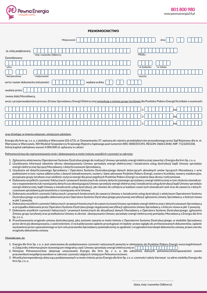 801 415 515 Infolinia pn-pt 8-20 PEŁNOMOCNICTWO Miejscowość dnia Ja, niżej podpisana/y, *PESEL: * imię i nazwisko Odbiorcy Zameldowany: * ulica * kod pocztowy * nr budynku * miejscowość seria i numer dokumentu tożsamości * nr lokalu * poczta wydany w dniu: wydany przez: zwany dalej Mocodawcą, wraz z przeprowadzeniem procesu Zmiany Sprzedawcy Energii Elektrycznej wnioskuję o zmianę grupy taryfowej dla Punktów Poboru Energii/liczników o numerach: z na z na z na oraz działając w imieniu własnym, niniejszym udzielam: Energia dla firm sp. z o. o. z siedzibą w Warszawie (02-672), ul. Domaniewska 37, wpisaną do rejestru przedsiębiorców prowadzonego przez Sąd Rejonowy dla m. st. Warszawy w Warszawie, XIII Wydział Gospodarczy Krajowego Rejestru Sądowego pod numerem KRS: 0000355392, REGON: 060613440, NIP: 7123205358, której kapitał zakładowy wynosi 4.000.000 zł, opłacony w całości Pełnomocnictwa do reprezentowania mnie i dokonywania w moim imieniu wszelkich czynności w zakresie: 1. Zgłoszenia właściwemu Operatorowi Systemu Dystrybucyjnego do realizacji Umowy sprzedaży energii elektrycznej zawartej z Energia dla firm Sp. z o. o. 2. Uzyskiwania informacji odnośnie okresu obowiązywania Umowy sprzedaży energii elektrycznej i świadczenia usług dystrybucji bądź Umowy sprzedaży energii elektrycznej łączącej Mocodawcę z dotychczasowym Sprzedawcą. 3. Uzyskania od dotychczasowego Sprzedawcy i Operatora Systemu Dystrybucyjnego danych dotyczących aktualnych umów łączących Mocodawcę z w/w podmiotami w tym: nazwa odbiorcy/ów z danymi teleadresowymi, numery i dane adresowe Punktów Poboru Energii, numery liczników, numery ewidencyjne, przypisane grupy taryfowe oraz wielkości zużycia energii dla poszczególnych Punktów Poboru Energii za ostatnie dwa okresy rozliczeniowe. 4. Dokonania wszelkich czynności faktycznych i prawnych koniecznych do zmiany dotychczasowego sprzedawcy energii elektrycznej w tym złożenia oświadczenia o wypowiedzeniu lub rozwiązaniu dotychczas obowiązującej Umowy sprzedaży energii elektrycznej i świadczenia usług dystrybucji bądź Umowy sprzedaży energii elektrycznej, bądź Umowy o świadczenie usług dystrybucji, jak również do cofnięcia w każdym czasie tych oświadczeń woli oraz do zawarcia z dotychczasowym sprzedawcą porozumienia o rozwiązaniu w/w Umowy. 5. Dokonania wszelkich czynności faktycznych i prawnych koniecznych do zawarcia Umowy o świadczenie usług dystrybucji z właściwym Operatorem Systemu Dystrybucyjnego w przypadku dokonania przez Operatora Systemu Dystrybucyjnego pozytywnej weryfikacji zgłoszenia zmiany Sprzedawcy, o którym mowa w pkt 1 powyżej. 6. Dokonania wszelkich czynności faktycznych i prawnych koniecznych do zawarcia nowej Umowy sprzedaży energii elektrycznej z dotychczasowym Sprzedawcą w przypadku dokonania przez Operatora Systemu Dystrybucyjnego negatywnej weryfikacji zgłoszenia zmiany Sprzedawcy, o którym mowa w pkt 1 powyżej. 7. Dokonania wszelkich czynności faktycznych i prawnych koniecznych do aktualizacji danych Mocodawcy u Operatora Systemu Dystrybucyjnego, zgłoszenia Zmiany grupy taryfowej oraz przedłożenia Umowy w okresie obwiązywania Umowy sprzedaży energii elektrycznej pomiędzy Mocodawcą a Energia dla firm Sp. z o. o. 8. Przechowywania oryginału umowy dystrybucyjnej, jaka zostanie zawarta w moim imieniu z Operatorem Systemu Dystrybucyjnego, w siedzibie Sprzedawcy przez okres jej obowiązywania, z zastrzeżeniem, iż na każdorazowe żądanie przysługiwać mi będzie: prawo wglądu do archiwizowanych dokumentów, żądanie wystawienia przez upoważnionego w tym celu pracownika Sprzedawcy poświadczonej za zgodność z oryginałem kserokopii dokumentu umowy, prawo zwrotu oryginału dokumentu umowy. Oświadczam, że: 1. Energia dla firm Sp. z o. o. jest umocowana do podejmowania czynności wskazanych powyżej w odniesieniu do Punktów Poboru Energii wyszczególnionych w Załączniku Informacyjnym stanowiącym integralną część Umowy sprzedaży energii elektrycznej nr 2. Niniejsze Pełnomocnictwo obejmuje umocowanie Energia dla firm Sp. z o. o. dla udzielenia dalszych pełnomocnictw/upoważnień swoim pracownikom/współpracownikom w zakresie czynności objętych niniejszym Pełnomocnictwem. 3. Wszelką korespondencję dotyczącą podejmowanych w moim imieniu przez Energia dla firm Sp. z o. o. czynności należy kierować na adres siedziby Energia dla firm Sp. z o. o. (data, imię i nazwisko Odbiorcy)