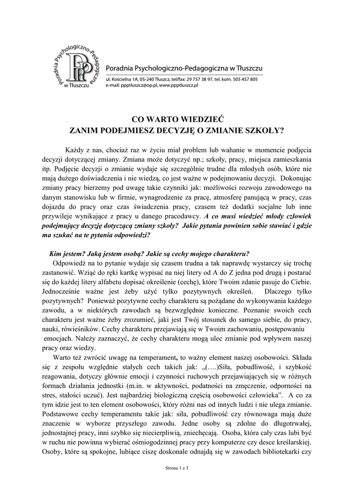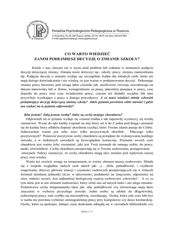 CO WARTO WIEDZIEĆ ZANIM PODEJMIESZ DECYZJĘ O ZMIANIE SZKOŁY? Każdy z nas, chociaż raz w życiu miał problem lub wahanie w momencie podjęcia decyzji dotyczącej zmiany. Zmiana może dotyczyć np.; szkoły, pracy, miejsca zamieszkania itp. Podjęcie decyzji o zmianie wydaje się szczególnie trudne dla młodych osób, które nie mają dużego doświadczenia i nie wiedzą, co jest ważne w podejmowaniu decyzji. Dokonując zmiany pracy bierzemy pod uwagę takie czynniki jak: możliwości rozwoju zawodowego na danym stanowisku lub w firmie, wynagrodzenie za pracę, atmosferę panującą w pracy, czas dojazdu do pracy oraz czas świadczenia pracy, czasem też dodatki socjalne lub inne przywileje wynikające z pracy u danego pracodawcy. A co musi wiedzieć młody człowiek podejmujący decyzję dotyczącą zmiany szkoły? Jakie pytania powinien sobie stawiać i gdzie ma szukać na te pytania odpowiedzi? Kim jestem? Jaką jestem osobą? Jakie są cechy mojego charakteru? Odpowiedź na to pytanie wydaje się czasem trudna a tak naprawdę wystarczy się trochę zastanowić. Wziąć do ręki kartkę wypisać na niej litery od A do Z jedna pod drugą i postarać się do każdej litery alfabetu dopisać określenie (cechę), które Twoim zdanie pasuje do Ciebie. Jednocześnie ważne jest żeby użyć tylko pozytywnych określeń. Dlaczego tylko pozytywnych? Ponieważ pozytywne cechy charakteru są pożądane do wykonywania każdego zawodu, a w niektórych zawodach są bezwzględnie konieczne. Poznanie swoich cech charakteru jest ważne żeby zrozumieć, jaki jest Twój stosunek do samego siebie, do pracy, nauki, rówieśników. Cechy charakteru przejawiają się w Twoim zachowaniu, postępowaniu emocjach. Należy zaznaczyć, że cechy charakteru mogą ulec zmianie pod wpływem naszej pracy oraz wiedzy. Warto też zwrócić uwagę na temperament, to ważny element naszej osobowości. Składa się z zespołu względnie stałych cech takich jak: „(….)Siła, pobudliwość, i szybkość reagowania, dotyczy głównie emocji i czynności ruchowych przejawiających się w różnych formach działania jednostki (m.in. w aktywności, podatności na zmęczenie, odporności na stres, stałości uczuć). Jest najbardziej biologiczną częścią osobowości człowieka”. A co za tym idzie jest to ten element osobowości, który różni nas od innych ludzi i nie ulega zmianie. Podstawowe cechy temperamentu takie jak: siła, pobudliwość czy równowaga mają duże znaczenie w wyborze przyszłego zawodu. Jedne osoby są zdolne do długotrwałej, jednostajnej pracy, inni szybko się niecierpliwią, zniechęcają. Osoba, która cały czas lubi być w ruchu nie powinna wybierać ośmiogodzinnej pracy przy komputerze czy desce kreślarskiej. Osoby, które są spokojne, lubiące ciszę doskonale odnajdą się w zawodach bibliotekarki czy Strona 1 z 3 w/w kreślarza. To, co jeszcze powinno wpływać na podjęcie decyzji o zmianie szkoły to na pewno posiadane zdolności oraz stan zdrowia i rozwój fizyczny. Zdolności, umiejętności oraz stan zdrowia składają się na możliwości każdego z nas. Dokonując wyboru dalszego kształcenia należy zastanowić się, jakich przedmiotów najchętniej się uczę. Które przedmioty nie sprawiają mi kłopotów? Czy mam zdolności do nauki teoretycznej czy raczej powinienem wybrać szkołę zawodową ze względu na uzdolnienia praktyczne? Nie zawsze łatwo odpowiedzieć sobie samemu na te pytania. Warto porozmawiać o tym ze swoimi rodzicami, nauczycielami czy swoimi rówieśnikami, którzy obserwują was w szkole na lekcjach. W tej sytuacji każda informacja może okazać się cenna. Ważnym czynnikiem w podejmowaniu decyzji jest stan zdrowia i rozwój fizyczny. Należy sprawdzić, czy nasz ogólny stan zdrowia pozwala na wykonywanie wybranego konkretnego zawodu. Przykładem jest wada słuchu, która jest przeszkodą w wykonywaniu zawodu kierowcy lub alergia w zawodach wymagających kontaktu z chemikaliami, smarami, pyłami lub zwierzętami. Zainteresowania to kolejny ważny element, który powinien być wzięty pod uwagę przy podejmowaniu decyzji o zmianie szkoły. Czytając biografie znanych osób często można przeczytać, że ich zainteresowania dotyczące obecnie wykonywanego zawodu towarzyszą im już od dziecka. Co to są te zainteresowania? I skąd się biorą? Jedną z definicji opisujących zainteresowania jest definicja wskazująca różnice pomiędzy zainteresowaniami a zaciekawieniem.(...) "Zainteresowania są utrwaloną tj. pojawiającą się i ukierunkowaną jednolitą ciekawością. Tak, więc zaciekawienie stanowi podstawowy element struktury zainteresowań. Różnica między zainteresowaniami a zaciekawieniem to złożoność i trwałość zainteresowań". Wszystko zainteresowania, które przez wiele lat wykonujemy lub rozwijamy z przyjemnością w przyszłości mogą dalej być dla nas źródłem przyjemności w postaci wykonywanej pracy zawodowej. Sukcesy w nauce szkolnej, potem w pracy zawodowej zależą nie tylko od zdolności, ale również od zainteresowań, które są ważnym czynnikiem motywującym do pracy w przyszłym zawodzie. Zainteresowania pojawiają się już we wczesnym dzieciństwie na początku dotyczą one zainteresowań przestrzennych następnie koncentrują się na zainteresowaniach dotyczących mowy. Wraz z rozwojem dziecka ulegają one zmianie. W dużej mierze wpływ na zainteresowania dziecka ma dom rodzinny oraz środowisko, w którym żyje. Im bardziej środowisko jest wspierające i rozwijające tym zainteresowania są silniejsze i trwalsze. Rozwijanie własnych pasji jest kluczem do sukcesu w podejmowaniu decyzji dotyczącej wyboru swojej przyszłości. Przecież już Konfucjusz żyjący 500 p.n.e. uznawany za największego chińskiego filozofa powiedział: " Wybierz pracę, którą kochasz, a nie będziesz musiał pracować nawet przez jeden dzień w swoim życiu". Wszystko, co sprawia nam przyjemność z podwójną si