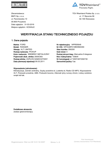 Zleceniodawca: TÜV Rheinland Polska Sp. z o.o. BMTI Sp. z o.o. ul. 17 Stycznia 56 ul. Parzniewska 10 02-146 Warszawa 05-800 Pruszków Data oględzin: 31-03-2016 Miejsce oględzin: KOWALE WERYFIKACJA STANU TECHNICZNEGO POJAZDU 1. Dane pojazdu Marka: FORD Model: RANGER Wersja: XLT LIMITED Rodzaj nadwozia: PICKUP Kolor nadwozia: SREBRNY METALICZNY Pojemność skok. silnika: 2500CM3 Rodzaj silnika: ZAPŁON SAMOCZYNNY Data pierwszej rejestracji: 09.03.2011 Nr rejestracyjny: WPR55648 Nr VIN: WF0UMFE10BW894494 Stan licznika: 290200 Ilość drzwi: 4 Rodzaj skrzyni bieg.: Manualna 5-biegowa Moc maksymalna: 105kW Nr homologacji: e1*2007/46*0394*00 Samochód jezdny: Tak Wyposażenie (odnotowane): Klimatyzacja, Zamek centralny, Szyby przednie el, Lusterka el, Radio CD MP3, Wyposażenie XLT, Poduszki przednie, ABS. Poduszki boczne, Zderzak tylny rurowy chrom, Listwy ozdobne wnęki kół lak. Dodatkowe akcesoria: zestaw głośnomówiący Wygenerowano: Wed Jun 08 13:31:16 CEST Strona 1 z 9 Piotr Karankowski (Uznany rzeczoznawca TUV Rheinland) 2. Stan pojazdu 2.1 Układ jezdny. Stan ogumienia: Opona lewa przednia: Producent, model: BRIDGESTONE DUELER Rodzaj: LETNIE Wysokość bieżnika: 5mm Opona prawa przednia: Producent, model: BRIDGESTONE DUELER Rodzaj: LETNIE Wysokość bieżnika: 5mm Opona lewa tylna: Producent, model: BRIDGESTONE DUELER Rodzaj: LETNIE Wysokość bieżnika: 5mm Opona prawa tylna: Producent, model: BRIDGESTONE DUELER Rodzaj: LETNIE Wysokość bieżnika: 5mm Stan obręczy kół/kołpaków: Widoczne otarcia obręczy kół. Zaobserwowany stan tarcz/klocków hamulcowych: Układ hamulcowy uszkodzony - przedstawiono kosztorys naprawy Niepokojące odgłosy/objawy stwierdzone w trakcie jazdy próbnej: Dobiegające z uszkodzonego układu hamulcowego (C) TÜV, TUEV, TUV, are registred trademarks. Utilisation and application requires prior approval. Uwagi inne: Uszkodzona półoś napędowa Wygenerowano: Wed Jun 08 13:31:16 CEST Strona 2 z 9 Piotr Karankowski (Uznany rzeczoznawca TUV Rheinland) 2.2 Nadwozie pojazdu. Pomiar lakieru wykonany miernikiem: LIMIT 5100 83-94 96-99 97-103 86-88 77-90 84-99 90-102 82-98 73-96 61-72 77-95 (C) TÜV, TUEV, TUV, are registred trademarks. Utilisation and application requires prior approval. Uszkodzenia nadwozia: Drzwi p.l.-odkształcone, drzwi tylne l - zarysowanie wierzchnie, Błotnik tylny l - pogięty, Klapa załadowcza - pogięta, Zderzak tylny - pogięty, Lampa tylna prawa - pęknięta, , Zderzak przedni pęknięty, Izolacja maski - uszkodzona, Błotnik przedni prawy - zgięty, Pokrywa silnika - odpryski lakieru/korozja Szyby pojazdu: Szyba przednia oryginalna - odprysk warstwy zewnętrznej Uwagi inne: Liczne przetarcia wymagające spolerowania Wygenerowano: Wed Jun 08 13:31:16 CEST Strona 3 z 9 Piotr Karankowski (Uznany rzeczoznawca TUV Rheinland) 2.3 Wnętrze pojazdu. Stan tapicerki foteli oraz tapicerek drzwiowych: Siedzisko fotela kierowcy rozdarte, tapicerka silnie zabrudzona, Stan podsufitki, deski rozdzielczej, oraz wykończeń przedziału bagażowego: Podsufitka zabrudzona Tablica rozdzielcza - świecące kontrolki: Komunikat ABS, uszkodzony układ hamulcowy Uwagi inne: Wytarta kierownica, brak naklejki gałki zmiany biegów, brak zapalniczki 2.4 Układ napędowy. Wycieki w układzie napędowym: Brak widocznych wycieków Nieprawidłowości w pracy układu napędowego: Uszkodzona półoś Stan układu wydechowego: Widoczna korozja (C) TÜV, TUEV, TUV, are registred trademarks. Utilisation and application requires prior approval. 2.5 Kompletność pojazdu. Do samochodu dołączono: - Klucze (szt): 2 - Dowód rejestracyjny: TAK - Instrukcję obsługi: TAK - Książkę serwisową - data ostatniego wpisu: 22.07.2014 - Koło zapasowe - wysokość bieżnika: 7mm - Kompletny zestaw narzędzi: TAK - Sprawny podnośnik: TAK - Ważna gaśnicę - data ważności: Nieczytelna Drugi komplet kół/opon: Rodzaj opon: Brak Rodzaj felg: Ilość, marka, model i rozmiar opon: Wygenerowano: Wed Jun 08 13:31:16 CEST Strona 4 z 9 Piotr Karankowski (Uznany rzeczoznawca TUV Rheinland) 3. Dodatkowe uwagi. Rzeczoznawca przeprowadzający weryfikację oraz TÜV Rheinland Polska sp. z o.o. nie biorą odpowiedzialności za wady ukryte pojazdu oraz wady których nie dotyczyła powyższa weryfikacja. Powyższa weryfikacja stanu pojazdu została sporządzona organoleptycznie, oraz za pomocą wymienionych w formularzu urządzeń. Weryfikacja nie ma charakteru diagnostyki uszkodzeń pojazdu. Dodatkowe uwagi: Brak (C) TÜV, TUEV, TUV, are registred trademarks. Utilisation and application requires prior approval. 4. Zdjęcia pojazdu. Wygenerowano: Wed Jun 08 13:31:18 CEST Strona 5 z 9 Piotr Karankowski (Uznany rzeczoznawca TUV Rheinland) (C) TÜV, TUEV, TUV, are registred trademarks. Utilisation and application requires prior approval. Wygenerowano: Wed Jun 08 13:31:20 CEST Strona 6 z 9 Piotr Karankowski (Uznany rzeczoznawca TUV Rheinland) (C) TÜV, TUEV, TUV, are registred trademarks. Utilisation and application requires prior approval. Wygenerowano: Wed Jun 08 13:31:21 CEST Strona 7 z 9 Piotr Karankowski (Uznany rzeczoznawca TUV Rheinland) 5. Wartość pojazdu Jako zużycie ponadnormatywne uznano: Drzwi p.l.-odkształcone, drzwi tylne l - zarysowanie wierzchnie, Błotnik tylny l - pogięty, Klapa załadowcza - pogięta, Zderzak tylny - pogięty, Lampa tylna prawa - pęknięta, , Zderzak przedni pęknięty, Izolacja maski - uszkodzona, Błotnik przedni prawy - zgięty, Pokrywa silnika - odpryski lakieru/korozja, uszkodzona tapicerka, XXX Wartość pojazdu obliczona w oparciu o analizę ofert rynkowych: XXX (C) TÜV, TUEV, TUV, are registred trademarks. Utilisation and application requires prior approval. Wartość pojazdu obliczona za pomocą programu EUROTAX: Wygenerowano: Wed Jun 08 13:31:21 CEST Strona 8 z 9 Piotr Karankowski (Uznany rzeczoznawca TUV Rheinland) (C) TÜV, TUEV, TUV, are registred trademarks. Utilisation and application requires prior approval. Wygenerowano: Wed