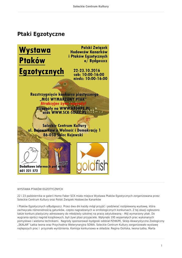 Soleckie Centrum Kultury Ptaki Egzotyczne WYSTAWA PTAKÓW EGZOTYCZNYCH 22 i 23 października w galerii Homo Faber SCK miała miejsce Wystawa Ptaków Egzotycznych zorganizowana przez Soleckie Centrum Kultury oraz Polski Związek Hodowców Kanarków i Ptaków Egzotycznych o/Bydgoszcz. Przez dwa dni każdy mógł przyjść i podziwiać rozśpiewaną wystawę, która zachwycała różnorodnością gatunków, często nagradzanych w ornitologicznych konkursach. Z tej okazji ogłoszono także konkurs plastyczny adresowany do młodzieży szkolnej na pracę zatytułowaną – Mój wymarzony ptak. Do wygrania oprócz nagród książkowych, byli żywi ptasi przyjaciele. Wpłynęło 195 wspaniałych prac wykonanych pomysłowo i wieloma technikami. Nagrody sponsorowali bydgoski oddział PZHKiPE, Sklep Akwarystyczno Zoologiczny „SKALAR” Łatka Iwona oraz Przychodnia Weterynaryjna SOWA. Soleckie Centrum Kultury zorganizowało wystawę najlepszych prac i przyznało wyróżnienia. Komisja konkursowa w składzie: Regina Osińska, Iwona Łatka, Marta 1 Soleckie Centrum Kultury Klubińska, Marcin Piskorski, Monika Ratajczyk – wyłoniła zwycięzców: Kategoria I-III 1. Agnieszka Ryduchowska 2. Natalia Piskorska 3. Matylda Zboińska Kategoria IV-VI 1. Natalia Zawadzka 2. Dominika Sałacińska 3. Paulina Łassa Wyróżnienia: Roksana Bryk Olga Piotrowska Justyna Ostrowska Kategoria Gimnazjaliści 1. Milena Król 2. Martyna Pietrzak 3. Martyna Estkowska Gratulujemy! 2