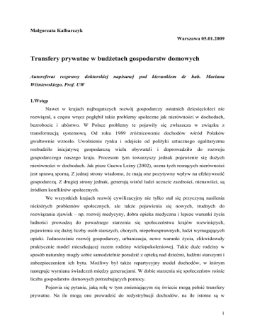 Małgorzata Kalbarczyk Warszawa 05.01.2009 Transfery prywatne w budżetach gospodarstw domowych Autoreferat rozprawy doktorskiej napisanej pod kierunkiem dr hab. Mariana Wiśniewskiego, Prof. UW 1.Wstęp Nawet w krajach najbogatszych rozwój gospodarczy ostatnich dziesięcioleci nie rozwiązał, a często wręcz pogłębił takie problemy społeczne jak nierówności w dochodach, bezrobocie i ubóstwo. W Polsce problemy te pojawiły się zwłaszcza w związku z transformacją systemową. Od roku 1989 zróżnicowanie dochodów wśród Polaków gwałtownie wzrosło. Uwolnienie rynku i odejście od polityki sztucznego egalitaryzmu rozbudziło inicjatywę gospodarczą wielu obywateli i doprowadziło do rozwoju gospodarczego naszego kraju. Procesom tym towarzyszy jednak pojawienie się dużych nierówności w dochodach. Jak pisze Gucwa Leśny (2002), ocena tych rosnących nierówności jest sprawą sporną. Z jednej strony wiadomo, że mają one pozytywny wpływ na efektywność gospodarczą. Z drugiej strony jednak, generują wśród ludzi uczucie zazdrości, nienawiści, są źródłem konfliktów społecznych. We wszystkich krajach rozwój cywilizacyjny nie tylko stał się przyczyną nasilenia niektórych problemów społecznych, ale także pojawienia się nowych, trudnych do rozwiązania zjawisk – np. rozwój medycyny, dobra opieka medyczna i lepsze warunki życia ludności prowadzą do poważnego starzenia się społeczeństwa krajów rozwiniętych, pojawienia się dużej liczby osób starszych, chorych, niepełnosprawnych, ludzi wymagających opieki. Jednocześnie rozwój gospodarczy, urbanizacja, nowe warunki życia, zlikwidowały praktycznie model mieszkającej razem rodziny wielopokoleniowej. Takie duże rodziny w sposób naturalny mogły sobie samodzielnie poradzić z opieką nad dziećmi, ludźmi starszymi i zabezpieczeniem ich bytu. Możliwy był także repartycyjny model dochodów, w którym następuje wymiana świadczeń między generacjami. W dobie starzenia się społeczeństw rośnie liczba gospodarstw domowych potrzebujących pomocy. Pojawia się pytanie, jaką rolę w tym zmieniającym się świecie mogą pełnić transfery prywatne. Na ile mogą one prowadzić do redystrybucji dochodów, na ile istotne są w 1 dochodach gospodarstw domowych. Wielkość i rodzaj transferowanych dóbr lub usług zależą od wielu czynników nie tylko ekonomicznych, ale także społecznych (takich jak więzi rodzinne), politycznych (modelu prowadzonej polityki społecznej) jak również kulturowych. Oczywiście istnieje szereg czynników ograniczających transfery prywatne i ich rolę w wyrównywaniu różnic w dochodach. Nierównomierny rozkład bogactwa w społeczeństwie, sprawia, że nie zawsze w pobliżu są osoby, które mogą nam pomóc. Także wysokie obciążenia podatkowe mogą sprawiać, że ludzie czują, że spełnili w ten sposób swoje obowiązki wobec bliźnich i nie chcą dodatkowo przekazywać pomocy dla gospodarstw biedniejszych. Mimo tych wszystkich ograniczeń według zarówno Cox’a, Eser’a i Jimenez’a (1998), jak i Lillard, Willis (1997), w wielu krajach to właśnie transfery prywatne są jednym z najważniejszych czynników realokujących zasoby. 2. Problemy badawcze i hipotezy Celem pracy jest dokładna analiza transferów prywatnych w Polsce, zbadanie ich roli i motywów i porównanie z innymi krajami europejskimi. Wyniki dla Polski porównano z rezultatami dla kilku wybranych krajów europejskich: dla Anglii i Danii tzn. krajów reprezentujących przeciwstawny, liberalny i opiekuńczy typ polityki społecznej, dla Niemiec, kraju o systemie polityki społecznej najbardziej zbliżonym do kontynentalno-europejskiego, w którego części też miała miejsce transformacja ustrojowa oraz dla Włoch, kraju śródziemnomorskiego o dużych tradycjach rodzinnych. Rolę transferów prywatnych w Polsce porównano też do roli jaką pełnią w Czechach, kraju sąsiadującym, o podobnej przeszłości historycznej. Hipoteza pierwsza: ze względu na uwarunkowania historyczne, szczególną wartość rodziny w Polsce oraz niższą niż w krajach rozwiniętych zamożność gospodarstw, transfery prywatne odgrywają tu szczególną rolę i przede wszystkim służą wspieraniu w podstawowych potrzebach w przeciwieństwie do roli jaką pełnią w rozwiniętych krajach Europy Zachodniej. Bardzo ważne przy analizie transferów prywatnych jest zrozumienie przyczyn, z powodu których transfery te się pojawiają. Zrozumienie tych motywów nie tylko pozwala dokładnie określić, kto może być potencjalnym odbiorcą transferów prywatnych, ale również pozwala określić efektywną politykę zabezpieczenia społecznego. Można wyróżnić następujące motywy transferów prywatnych: • Altruizm 2 • Wymiana o Motyw demonstracyjny o Potrzeba zabezpieczenia i bycia w „sieci” • Ważne wydarzenia w życiu Jednym z kluczowych motywów transferów prywatnych jest altruizm. Altruizm zakłada, że ludzie pomagają tym, którzy tej pomocy potrzebują. Dający, oferując swoją pomoc, nie oczekuje niczego w zamian1. Alternatywnym motywem jest motyw wymiany. Motyw ten zakłada, że dający transfer oczekuje lub w przyszłości będzie oczekiwał czegoś w zamian. Polega więc na dbaniu o zadowolenie osób, od których spodziewamy się usług w przyszłości, np. pomoc finansowa dzieciom, od których rodzice oczekują opieki na starość. Motyw ten zakłada, że proces wymiany może nastąpić po długim okresie czasu. Czasami okres ten może trwać nawet kilkadziesiąt lat. W pracy wykorzystano teoretyczny model motywów transferów Coxa i Ranka (1992). Założyli oni, że użyteczność dającego zależy od jego własnej konsumpcji (Cd), od usług, które dostanie w zamian od dostającego transfer (s) (element wymiany) i od użyteczności biorącego transfer (V) (element altruizmu), która zależy od jego własnej konsumpcji (Cb) oraz usług, które dostarczy w zamian dającemu. Ud 