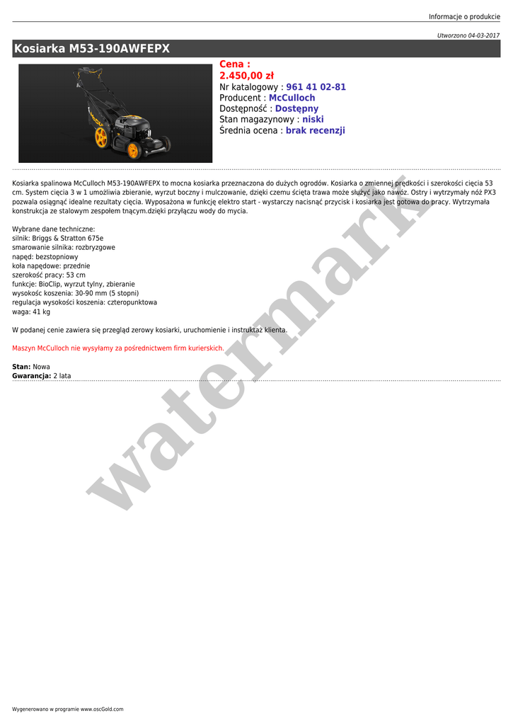 Informacje o produkcie Utworzono 04-03-2017 Kosiarka M53-190AWFEPX Cena : 2.450,00 zł Nr katalogowy : 961 41 02-81 Producent : McCulloch Dostępność : Dostępny Stan magazynowy : niski Średnia ocena : brak recenzji er m ar k Kosiarka spalinowa McCulloch M53-190AWFEPX to mocna kosiarka przeznaczona do dużych ogrodów. Kosiarka o zmiennej prędkości i szerokości cięcia 53 cm. System cięcia 3 w 1 umożliwia zbieranie, wyrzut boczny i mulczowanie, dzięki czemu ścięta trawa może służyć jako nawóz. Ostry i wytrzymały nóż PX3 pozwala osiągnąć idealne rezultaty cięcia. Wyposażona w funkcję elektro start - wystarczy nacisnąć przycisk i kosiarka jest gotowa do pracy. Wytrzymała konstrukcja ze stalowym zespołem tnącym.dzięki przyłączu wody do mycia. Wybrane dane techniczne: silnik: Briggs & Stratton 675e smarowanie silnika: rozbryzgowe napęd: bezstopniowy koła napędowe: przednie szerokość pracy: 53 cm funkcje: BioClip, wyrzut tylny, zbieranie wysokośc koszenia: 30-90 mm (5 stopni) regulacja wysokości koszenia: czteropunktowa waga: 41 kg W podanej cenie zawiera się przegląd zerowy kosiarki, uruchomienie i instruktaż klienta. Maszyn McCulloch nie wysyłamy za pośrednictwem firm kurierskich. w at Stan: Nowa Gwarancja: 2 lata Wygenerowano w programie www.oscGold.com