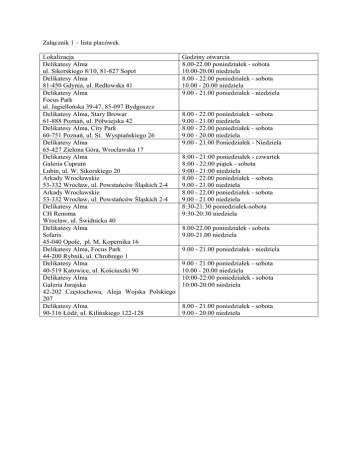 Załącznik 1 – lista placówek Lokalizacja Delikatesy Alma ul. Sikorskiego 8/10, 81-827 Sopot Delikatesy Alma 81-450 Gdynia, ul. Redłowska 41 Delikatesy Alma Focus Park ul. Jagiellońska 39-47, 85-097 Bydgoszcz Delikatesy Alma, Stary Browar 61-888 Poznań, ul. Półwiejska 42 Delikatesy Alma, City Park 60-751 Poznań, ul. St. Wyspiańskiego 26 Delikatesy Alma 65-427 Zielona Góra, Wrocławska 17 Delikatesy Alma Galeria Cuprum Lubin, ul. W. Sikorskiego 20 Arkady Wrocławskie 53-332 Wrocław, ul. Powstańców Śląskich 2-4 Arkady Wrocławskie 53-332 Wrocław, ul. Powstańców Śląskich 2-4 Delikatesy Alma CH Renoma Wrocław, ul. Świdnicka 40 Delikatesy Alma Solaris 45-040 Opole, pl. M. Kopernika 16 Delikatesy Alma, Focus Park 44-200 Rybnik, ul. Chrobrego 1 Delikatesy Alma 40-519 Katowice, ul. Kościuszki 90 Delikatesy Alma Galeria Jurajska 42-202 Częstochowa, Aleja Wojska Polskiego 207 Delikatesy Alma 90-316 Łódź, ul. Kilińskiego 122-128 Godziny otwarcia 8.00-22.00 poniedziałek - sobota 10.00-20.00 niedziela 8.00 - 22.00 poniedziałek - sobota 10.00 - 20.00 niedziela 9.00 - 21.00 poniedziałek - niedziela 8.00 - 22.00 poniedziałek - sobota 9.00 - 21.00 niedziela 8.00 - 22.00 poniedziałek - sobota 9.00 - 20.00 niedziela 9.00 - 21.00 Poniedziałek - Niedziela 8:00 - 21:00 poniedziałek - czwartek 8:00 - 22:00 piątek - sobota 9:00 - 21:00 niedziela 8.00 - 22.00 poniedziałek - sobota 9.00 - 21.00 niedziela 8.00 - 22.00 poniedziałek - sobota 9.00 - 21.00 niedziela 8:30-21:30 poniedziałek-sobota 9:30-20:30 niedziela 8.00-22.00 poniedziałek - sobota 9.00-21.00 niedziela 9.00 - 21.00 poniedziałek - niedziela 9.00 - 21.00 poniedziałek - sobota 10.00 - 20.00 niedziela 10:00-22:00 poniedziałek - sobota 10:00-20:00 niedziela 8.00 - 21.00 poniedziałek - sobota 9.00 - 20.00 niedziela Załącznik 1 – Lista placówek (c.d.) Lokalizacja Delikatesy Alma Manufaktura 91-065 Łódź , Ogrodowa 19a Supermarket Alma 34-400 Nowy Targ, ul. Szaflarska 174 Delikatesy Alma, Galeria Kazimierz 31-536 Kraków, ul. Podgórska 34 Supermarket Alma ul. Pilotów 6, 30-964 Kraków Delikatesy Alma 30-114 Kraków, ul. Kościuszki 71 Delikatesy Alma 30-126 Kraków, ul. Stańczyka 14/2 Supermarket Alma 33-100 Tarnów, ul. Dąbrowskiego 10 Delikatesy Alma Capital Park 35-326 Rzeszów, al. T. Rejtana 23 Delikatesy Alma ul. Sprawiedliwości 4, 05-800 Pruszków Delikatesy Alma 05-500 Piaseczno, ul. Wojska Polskiego 17 Delikatesy Alma, Centrum Handlowe Skorosze 02-497 Warszawa, ul. Gen. Sławoja Składkowskiego 4 Delikatesy Alma, Centrum Handlowe Promenada 04-175 Warszawa, ul. Ostrobramska 75c Delikatesy Alma 03-937 Warszawa, ul. Zwycięzców 40 Delikatesy Alma Galeria Olimp 20-147 Lublin, al. Spółdzielczości Pracy 32 Godziny otwarcia 9.00 - 22.00 poniedziałek - sobota 9.00 - 21.00 niedziela 9.00 - 21.00 poniedziałek - piątek 8.00 - 21.00 sobota 10.00 - 19.00 niedziela 10.00 - 22.00 poniedziałek - sobota 10.00 - 20.00 niedziela 8.00 - 22.00 poniedziałek - sobota 9.00 - 20.00 niedziela 8.00 - 21.00 poniedziałek - sobota 9.00 - 20.00 niedziela 8.00 - 22.00 poniedziałek - sobota 9.00 - 21.00 niedziela 8.00 - 22.00 poniedziałek - sobota 10.00 - 20.00 niedziela 8.00-22.00 poniedziałek - sobota 10.00-20.00 niedziela 8.00 - 22.00 poniedziałek - sobota 10.00 - 20.00 niedziela 8.00 - 22.00 poniedziałek - sobota 10.00 - 20.00 niedziela 10.00 - 21.00 poniedziałek - sobota 10.00 - 20.00 niedziela 9.00 - 22.00 poniedziałek - sobota 10.00 - 20.00 niedziela 8.00-22.00 poniedziałek - sobota 10.00-20.00 niedziela 9:00-21:00 poniedziałek - sobota 9:00-20:00 niedziela