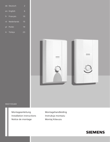 de Deutsch 2 en English 6 fr Français 10 nl Nederlands 15 pl Polski 19 tr 23 Türkçe 9001155269 Montageanleitung Montagehandleiding Installation instructions Instrukcja montażu Notice de montage Montaj Kılavuzu de Bestimmungsgemäßer Gebrauch Dieses Gerät ist für den Haushalt oder für haushaltsähnliche, nicht gewerbliche Anwendungen bestimmt. Haushaltsähnliche Anwendungen umfassen z. B. die Verwendung in Mitarbeiterküchen von Läden, Büros, landwirtschaftlichen und anderen gewerblichen Betrieben, sowie die Nutzung durch Gäste von Pensionen, kleinen Hotels und ähnlichen Wohneinrichtungen. Sicherheitshinweise Die Montageanleitung bitte sorgfältig durchlesen, danach handeln und aufbewahren! Bei Weitergabe des Gerätes diese Montageanleitung beilegen. ■ Das Gerät nur von einem Fachmann anschließen und in Betrieb nehmen lassen. ■ Das Gerät wie in Text und Bild beschrieben montieren und bedienen. Wir übernehmen keine Haftung für Schäden, die durch Nichtbeachtung dieser Anleitung entstehen. ■ Beiliegende Wasseranschlussstutzen unbedingt verwenden und wie im Beiblatt angegeben montieren. Sicherstellen, dass im Kaltwasserzulauf ein Rückschlagventil eingebaut wird. ■ Vorsicht: Geerdete Wasserleitungen können das Vorhandensein eines Schutzleiters vortäuschen. ■ Das Gerät muss dauerhaft an festverlegte Leitungen angeschlossen werden. Der Leitungsquerschnitt muss der zu installierenden Leistung entsprechen. ■ Zur Erfüllung der einschlägigen Sicherheitsvorschriften muss installationsseitig eine allpolige Trennvorrichtung vorhanden sein. Die Kontaktöffnung muss mindestens 3 mm betragen. ■ Das Gerät ist nur für den geschlossenen (druckfesten) Betrieb geeignet. ■ Armaturen müssen für den Betrieb mit geschlossenen (druckfesten) Durchlauferhitzern zugelassen sein. ■ Das Gerät kann an eine Kaltwasserleitung angeschlossen oder mit vorgewärmtem Wasser (Solaranlage) betrieben werden. Dazu technische Daten und Sonderzubehör beachten. ■ Der spezifische Wasserwiderstand darf nicht unter 1 300 Ωcm liegen. Den Wasserwiderstand beim örtlichen Wasserversorger erfragen. ■ Das Gerät ist für den Anschluss an DVGWgeprüfte Kunststoffrohre geeignet. ■ Dieses Gerät ist für den Gebrauch bis zu einer Höhe von 2 000 m über dem Meeresspiegel bestimmt. ■ Das elektrische Anschlusskabel vor der Montage spannungslos machen und die Wasserzuleitung absperren! ■ Das Gerät nur in einem frostfreien Raum installieren und lagern (Restwasser). ■ Den Elektroanschluss erst nach dem Wasseranschluss durchführen. Stromschlaggefahr! Schalten Sie im Fehlerfall sofort die Netzspannung ab! Vor dem Öffnen des Gerätes die Stromzufuhr zum Gerät unterbrechen. Bei einer Undichtigkeit am Gerät sofort die Kaltwasserleitung schließen. ■ Die gesetzlichen Vorschriften des jeweiligen Landes, des örtlichen Elektrizitäts-Versorgungsunternehmens und des Wasserwerkes müssen eingehalten werden. ■ Der Durchlauferhitzer ist ein Gerät der Schutzklasse I und muss an den Schutzleiter angeschlossen werden. 2 ■ In der Rückwand nur die Öffnungen herstellen, die für die Montage benötigt werden. Bei erneuter Montage müssen die unbenutzten Öffnungen wasserdicht verschlossen werden. ■ Spannungsführende Teile dürfen nach der Montage nicht mehr berührbar sein. ■ Keine Scheuermittel oder anlösende Reinigungsmittel verwenden. ■ Keinen Dampfreiniger benutzen. de Herzlichen Glückwunsch zum Kauf dieses Geräts aus unserem Hause Siemens. Sie haben ein hochwertiges Produkt erworben, das Ihnen viel Freude bereiten wird. Montageanleitung IV. ■ Den Wasseranschluss vornehmen, anschließend die Kaltwasserzuleitung öffnen. ■ Das Gerät muss entlüftet werden. Dazu Warmwasserhahn ganz öffnen und das Gerät 1 Minute lang spülen. V. Diese Montageanleitung gilt für verschiedene Gerätemodelle. Die Darstellung kann deshalb vom gekauften Gerät abweichen. ■ Montieren Sie das Gerät wie im Bildteil beschrieben. Die Bildseiten finden Sie in der Mitte der Anleitung. Beachten Sie die Hinweise im Text. Montage I. Auspacken/Haube abnehmen ■ Gerät auspacken und auf Transportschäden kontrollieren. Liegt ein Schaden vor, Gerät nicht anschließen. ■ Lieferumfang kontrollieren: Gerät, Montagesatz mit Beiblatt, Montageanleitung, Gebrauchsanleitung. ■ Verpackung und Altgerät umweltgerecht entsorgen. ■ Beim Abnehmen der Haube Typ A oder Typ B beachten: Die Haube Typ A ist durch einen zentralen Verschluss hinter der Serviceklappe fixiert. Die Haube Typ B ist durch 2 Schrauben an der Haubenunterseite befestigt. II. Montagevorbereitung Wichtig: Nur den beiliegenden Montagesatz verwenden. Die mitgelieferten Wasseranschlussstutzen müssen unbedingt eingebaut werden! ■ Wasserzuleitung absperren. Der elektrische Anschluss (Anschlusskabel) muss spannungsfrei sein. Sicherungen herausdrehen oder ausschalten. Wasseranschluss Elektroanschluss/Montage ■ Nur bei Geräten mit Leistungsumschaltung: Vor Anschluss der Leitungen an die Netzanschlussklemme die Leistung mit dem Leistungsumschalter einstellen: nominale Leistung links, reduzierte Leistung rechts (Bild V., 1.) und die eingestellte Leistung am Typenschild markieren. ■ Die Leitungen an der Netzanschlussklemme festschrauben. ■ Sicherheitsbegrenzer einschalten (Bild V., 3.) ■ Haube montieren, Typ A oder B beachten (Bild V., 4. – 7.) Installationshinweis ■ Die Installation nicht-steckerfertiger Geräte ist vom jeweiligen Netzbetreiber oder von einem eingetragenen Fachbetrieb vorzunehmen, der Ihnen auch bei der Einholung der Zustimmung des jeweiligen Netzbetreibers für die Installation des Gerätes behilflich ist. VI. Inbetriebnahme Das Gerät stimmt mit IEC 61000-3-12 überein. Erstinbetriebnahme ■ Sicherungen einschalten. ■ Temperatur einstellen. ■ Startspülung: Warmwasserhahn ganz öffnen und mindestens 1 Minute lang Wasser beziehen. Aus Sicherheitsgründen beginnt das Gerät erst danach mit dem Heizen. ■ Die Wasseran