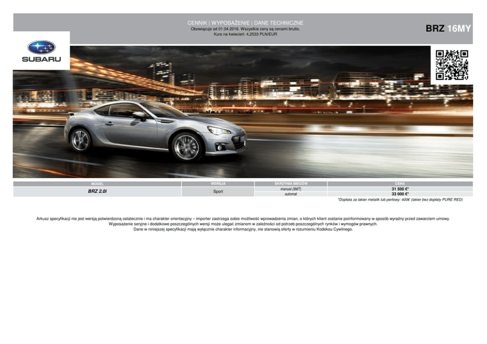 CENNIK | WYPOSAŻENIE | DANE TECHNICZNE BRZ 16MY Obowiązuje od 01.04.2016. Wszystkie ceny są cenami brutto. Kurs na kwiecień: 4,2533 PLN/EUR MODEL WERSJA SKRZYNIA BIEGÓW CENA BRZ 2.0i Sport manual (6MT) automat 31 500 €* 33 000 €* *Dopłata za lakier metalik lub perłowy: 400€ (lakier bez dopłaty PURE RED) Arkusz specyfikacji nie jest wersją potwierdzoną ostatecznie i ma charakter orientacyjny – importer zastrzega sobie możliwość wprowadzenia zmian, o których klient zostanie poinformowany w sposób wyraźny przed zawarciem umowy. Wyposażenie seryjne i dodatkowe poszczególnych wersji może ulegać zmianom w zależności od potrzeb poszczególnych rynków i wymogów prawnych. Dane w niniejszej specyfikacji mają wyłącznie charakter informacyjny, nie stanowią oferty w rozumieniu Kodeksu Cywilnego. WYPOSAŻENIE -2- BRZ 2.0i Sport manual(6MT) automat WYPOSAŻENIE WNĘTRZA dodatkowe gniazdo AUX i USB dla zewnętrznego odtwarzacza MP3 dźwignia hamulca ręcznego obszyta skórą gałka dźwigni zmiany biegów obszyta skórą elektrycznie sterowane szyby przednie fotel kierowcy z regulacją wysokości kierownica obszyta skórą kieszenie w drzwiach z uchwytami na napoje kieszeń z tyłu oparcia przedniego fotela pasażera klimatyzacja automatyczna dwustrefowa kolumna kierownicy regulowana w dwóch płaszczyznach komputer pokładowy konsola środkowa ze zintegrowanym schowkiem i gniazdem 12V (w schowku) kontrolka poziomu paliwa lusterka w osłonach przeciwsłonecznych manetki zmiany biegów przy kierownicy obrotomierz oświetlenie przestrzeni bagażowej składane oparcia tylnych foteli system audio z odtwarzaczem CD z 6 głośnikami tapicerka materiałowa termometr zewnętrzny uruchamianie silnika za naciśnięciem przycisku Start/Stop wlew paliwa otwierany ze środka zegar cyfrowy zestaw naprawczy kół wyposażenie seryjne Subaru Import Polska sp. z o.o. podjęło wszelkie środki, aby zawarte w niniejszej specyfikacji informacje były dokładne i aktualne w chwili oddania do druku. W ramach polityki stałego ulepszania swoich produktów Subaru zastrzega sobie prawo do zmiany specyfikacji i wyposażenia opisanych i przedstawionych pojazdów bez uprzedzenia. O zmianach tych autoryzowani partnerzy Subaru będą powiadamiani w możliwie najkrótszym terminie. Każda zmiana wyposażenia i specyfikacji zostanie wyraźnie przedstawiona Państwu przed zawarciem umowy ze sprzedawcą. Niniejsza specyfikacja nie stanowią oferty w rozumieniu Kodeksu Cywilnego. WYPOSAŻENIE -3- BRZ 2.0i Sport manual(6MT) automat WYPOSAŻENIE ZEWNĘTRZNE klamki zewnętrzne w kolorze nadwozia lakier metalik/perłowy lusterka zewnętrzne podgrzewane lusterka zewnętrzne regulowane elektrycznie lusterka zewnętrzne składane elektrycznie lusterka zewnętrzne w kolorze nadwozia podgrzewanie szyby tylnej przyciemniane szyby atermiczne reflektory ksenonowe przednie reflektory przeciwmgłowe reflektory przednie ze spryskiwaczami system klucza elektronicznego Keyless Access światła LED do jazdy dziennej tylny spojler w kolorze nadwozia wycieraczki szyby przedniej z regulowaną prędkością zamek centralny sterowany pilotem zderzaki w kolorze nadwozia BRZ 2.0i Sport manual(6MT) automat 17-calowe felgi aluminiowe z oponami 215/45R17 3-punktowe pasy bezpieczeństwa dla drugiego rzędu siedzeń ABS z funkcją EBD (elektroniczny rozdział sił hamowania) hamulce tarczowe tył immobilizer kolanowa poduszka powietrzna po stronie kierowcy kurtyny powietrzne (przód/tył) mechanizm różnicowy o zwiększonym tarciu typu Torsen napęd na tylne koła poduszki powietrzne kierowcy i pasażera (boczne) poduszki powietrzne kierowcy i pasażera (przednie) przednie hamulce tarczowe (wentylowane) przednie pasy bezpieczeństwa z napinaczami i ogranicznikami napięcia system kontroli trakcji i stabilizacji toru jazdy (VSC) system montażu fotelików dziecięcych ISOFIX szkolenie w Szkole Jazdy Subaru Bezpłatne szkolenie dedykowane modelom z napędem na tylną oś. tempomat TPMS (Tire Pressure Monitoring System – system monitorujący ciśnienie powietrza w oponach) wspomaganie układu kierowniczego wzmocnienia boczne nadwozia TECHNIKA / BEZPIECZEŃSTWO Inteligentny System Ratunkowy (ISR) Inteligentny System ratunkowy używając sygnału GPS przekazuje automatycznie w sytuacji awaryjnej informacje do stale funkcjonującego centrum monitoringu. Umożliwia to natychmiastowe zweryfikowanie zdarzenia i powiadomienie właściwych służb w celu szybkiej i sprawnej organizacji pomocy. wyposażenie seryjne wyposażenie opcjonalne Subaru Import Polska sp. z o.o. podjęło wszelkie środki, aby zawarte w niniejszej specyfikacji informacje były dokładne i aktualne w chwili oddania do druku. W ramach polityki stałego ulepszania swoich produktów Subaru zastrzega sobie prawo do zmiany specyfikacji i wyposażenia opisanych i przedstawionych pojazdów bez uprzedzenia. O zmianach tych autoryzowani partnerzy Subaru będą powiadamiani w możliwie najkrótszym terminie. Każda zmiana wyposażenia i specyfikacji zostanie wyraźnie przedstawiona Państwu przed zawarciem umowy ze sprzedawcą. Niniejsza specyfikacja nie stanowią oferty w rozumieniu Kodeksu Cywilnego. BRZ 2.0i Sport DANE TECHNICZNE -4- manual(6MT) automat SILNIK typ i układ silnika silnik w układzie bokser, 4 cylindry, 16V, benzynowy wtrysk paliwa pojemność silnika moc silnika maksymalny moment obrotowy bezpośredni, wielopunktowy cm3 kW (KM) / obr/min 1998 1998 147(200)/7000 147(200)/7000 Nm/ obr/min 205/6400-6600 205/6400-6600 stopień sprężania 12,5:1 12,5:1 Euro 6b Euro 6b mm 86,0 x 86,0 napęd na tylne koła (mechanizm różnicowy o zwiększonym tarciu typu Torsen) benzyna bezołowiowa 98 oktan 86,0 x 86,0 napęd na tylne koła (mechanizm różnicowy o zwiększonym tarciu typu Torsen) benzyna bezołowiowa 98 oktan km/h 226 210 s 7,6 8,2 cykl miejski l/100 km 10,4 9,6 cykl pozamiejski l/100 km 6,3 5,7 cykl mieszany l/100 km 7,8 7,1 g/km 180 164 4240 norma emisji sp