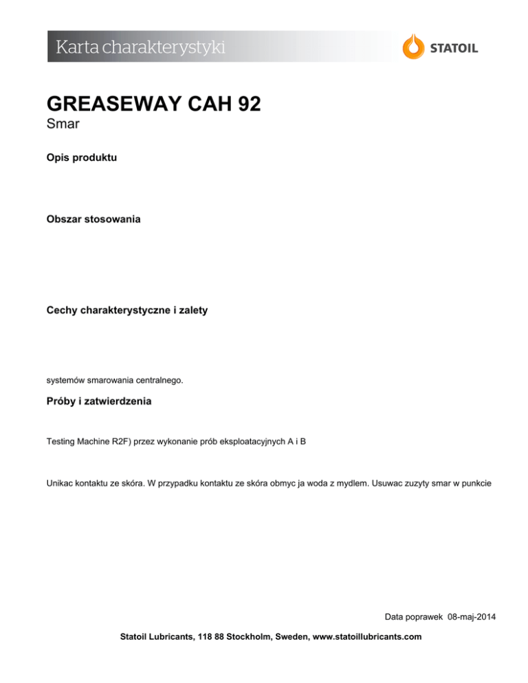 GREASEWAY CAH 92 Smar Opis produktu Obszar stosowania Cechy charakterystyczne i zalety systemów smarowania centralnego. Próby i zatwierdzenia Testing Machine R2F) przez wykonanie prób eksploatacyjnych A i B Unikac kontaktu ze skóra. W przypadku kontaktu ze skóra obmyc ja woda z mydlem. Usuwac zuzyty smar w punkcie Data poprawek 08-maj-2014 Statoil Lubricants, 118 88 Stockholm, Sweden, www.statoillubricants.com Dane charakterystyczne Charakterystyka 4-ball, WL Przenikanie, przepracowane 100 000 suwów Przenikanie, przepracowane 60 suwów Jednostki Metoda 2 2800 70 N mm²/s ISO 20623 ISO 3104 850 mm²/s ISO 3104 145 280 °C ISO 2176 280 mm/10 ISO 2137 OK load Data poprawek 08-maj-2014