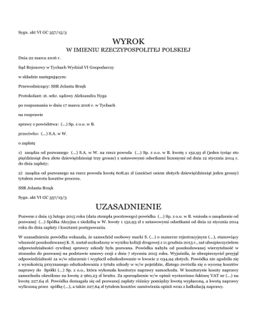 Sygn. akt VI GC 357/15/3 WYROK W IMIENIU RZECZYPOSPOLITEJ POLSKIEJ Dnia 22 marca 2016 r. Sąd Rejonowy w Tychach Wydział VI Gospodarczy w składzie następującym: Przewodniczący: SSR Jolanta Brzęk Protokolant: st. sekr. sądowy Aleksandra Nyga po rozpoznaniu w dniu 17 marca 2016 r. w Tychach na rozprawie sprawy z powództwa: (...) Sp. z o.o. w B. przeciwko: (...) S.A. w W. o zapłatę 1) zasądza od pozwanego (...) S.A. w W. na rzecz powoda (...) Sp. z o.o. w B. kwotę 1 152,93 zł (jeden tysiąc sto pięćdziesiąt dwa złote dziewięćdziesiąt trzy grosze) z ustawowymi odsetkami liczonymi od dnia 12 stycznia 2014 r. do dnia zapłaty; 2) zasądza od pozwanego na rzecz powoda kwotę 608,91 zł (sześćset osiem złotych dziewięćdziesiąt jeden groszy) tytułem zwrotu kosztów procesu. SSR Jolanta Brzęk Sygn. akt VI GC 357/15/3 UZASADNIENIE Pozwem z dnia 13 lutego 2015 roku (data stempla pocztowego) powódka (...) Sp. z o.o. w B. wniosła o zasądzenie od pozwanej (...) Spółka Akcyjna z siedzibą w W. kwoty 1 152,93 zł z ustawowymi odsetkami od dnia 12 stycznia 2014 roku do dnia zapłaty i kosztami postępowania. W uzasadnieniu powódka wskazała, że samochód osobowy marki S. (...) o numerze rejestracyjnym (...), stanowiący własność poszkodowanej K. S. został uszkodzony w wyniku kolizji drogowej z 11 grudnia 2013 r., zaś ubezpieczycielem odpowiedzialności cywilnej sprawcy szkody była pozwana. Powódka nabyła od poszkodowanej wierzytelność w stosunku do pozwanej na podstawie umowy cesji z dnia 7 stycznia 2015 roku. Wyjaśniła, że ubezpieczyciel przyjął odpowiedzialność za w/w zdarzenie i wypłacił odszkodowanie w kwocie 2 034,94 złotych. Powódka nie zgodziła się z wysokością przyznanego odszkodowania z tytułu szkody w w/w pojeździe, dlatego zwróciła się o wycenę kosztów naprawy do Spółki (...) Sp. z o.o., która wykonała kosztorys naprawy samochodu. W kosztorysie koszty naprawy samochodu określono na kwotę 2 960,23 zł brutto. Za sporządzenie w/w opinii wystawiono fakturę VAT nr (...) na kwotę 227,64 zł. Powódka domagała się od pozwanej zapłaty różnicy pomiędzy kwotą wypłaconą, a kwotą naprawy wyliczoną przez spółkę (...), a także 227,64 zł tytułem kosztów zamówienia opinii wraz z kalkulacją naprawy. W dniu 16 marca 2015 roku Sąd Rejonowy w Tychach, Wydział VI Gospodarczy wydał nakaz zapłaty w postępowaniu upominawczym w sprawie o sygnaturze VI GNc 426/15/3. W przepisanym terminie pozwana (...) Spółka Akcyjna z siedzibą w W. wniosła sprzeciw od nakazu zapłaty zaskarżając go w całości, wnosząc o oddalenie powództwa oraz zasądzenie kosztów postępowania. Pozwana przyznała, iż w związku ze zdarzeniem z dnia 11 grudnia 2013 r. spowodowanym przez kierowcę pojazdu objętego ubezpieczeniem OC u pozwanej, objęła to zdarzenie swoją ochroną i wypłaciła odszkodowanie za koszty naprawy w kwocie 2 034,94 zł. Zdaniem pozwanej wypłacona kwota jest adekwatna do rozmiaru szkody poniesionej w związku ze zdarzeniem sprawczym i pozwalała na pokrycie celowych kosztów przywrócenia pojazdu do stanu sprzed szkody. W ocenie pozwanej użycie do naprawy pojazdu poszkodowanej części nowych i oryginalnych nie mieściło się w pojęciu naprawienia szkody i było niezasadne. Postanowieniem z dnia 1 października 2015 r. Sąd dopuścił dowód z opinii biegłego sądowego na okoliczność ustalenia kosztów naprawy samochodu uszkodzonego przy zastosowaniu części nowych oryginalnych producenta samochodu tak zwana jakość O, przy stawkach za roboty blacharskie, lakiernicze, mechaniczne obowiązujących w zakładach na terminie miejsca zamieszkania pierwotnie poszkodowanego, świadczących usługi przy uwzględnieniu technologii naprawy wymaganej przez producenta pojazdu S.; Sąd ustalił, co następuje: W dniu 11 grudnia 2013 roku samochód osobowy marki S. (...) o numerze rejestracyjnym (...), stanowiący własność poszkodowanej K. S. uległ uszkodzeniu w wyniku kolizji drogowej. Ubezpieczycielem od odpowiedzialności cywilnej sprawcy kolizji drogowej była pozwana (okoliczność bezsporna). Poszkodowana zgłosiła pozwanej powstanie szkody. Pozwana wypłaciła pierwotnie poszkodowanej odszkodowanie w wysokości 2 034,94 zł. Cesją z 7 stycznia 2015 r. poszkodowana K. S. przeniosła na powódkę wierzytelność o zapłatę odszkodowania za szkodę wyrządzoną w pojeździe marki S. (...) o numerze rejestracyjnym (...) w związku ze zdarzeniem z dnia 11 grudnia 2013 r. za które odpowiedzialność przyjęła na siebie pozwana. Dowód: akta szkody (decyzja pozwanego o przyznaniu odszkodowaniu dla poszkodowanej (k.7), kalkulacja (k.8-11) umowa cesji (k.12) wraz z pełnomocnictwem (k.13), zawiadomienie o cesji (k.14), Uzasadniony koszt naprawy samochodu S. (...) o numerze rejestracyjnym (...) wyniósł kwotę 2 960,23 zł brutto. Dowód: pisemna opinia biegłego sądowego M. D. z dnia 7 stycznia 2016 r. (k.70-72), opinia prywatna (k.15-18), kalkulacja (21-24). Powódka zleciła Spółce (...) Sp. z o.o. sporządzenie opinii dotyczącej wyceny naprawy samochodu S. (...) o numerze rejestracyjnym (...). Za wykonanie w/w opinii wystawiona została faktura VAT nr (...) na kwotę 227,64 zł netto. Dowód: opinia spółki (...) Sp. z o.o. (k.15-18), ocena techniczna (k.19-20), kalkulacja (k.21-24), faktura VAT (k.25). Przedstawiony powyżej stan faktyczny Sąd ustalił na podstawie złożonych do akt sprawy dokumentów, których prawdziwości strony nie kwestionowały. Ustalając stan faktyczny sprawy sąd uwzględnił przede wszystkim treść pisemnej opinii biegłego z zakresu motoryzacji uznając, że pozostawały one rzetelne, logiczne i w wyczerpujący sposób opowiedziały na przedstawione biegłemu zagadnienia. Opinia została poparta dużym profesjonalizmem i doświadczeniem biegłego. Sąd zważył co następuje: Powództwo wytoczone w niniejszej sprawie przez powoda zasługiwało na uwzględnienie w całośc
