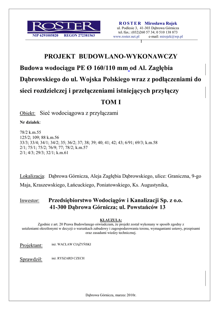 R O S T E R Mirosława Rojek NIP 6291005820 REGON 272381563 ul. Podlesie 3, 41-303 Dąbrowa Górnicza tel./fax.: (032)260 57 34; 0 510 138 873 www.roster.net.pl e-mail: [email protected] 1 PROJEKT BUDOWLANO-WYKONAWCZY Budowa wodociągu PE Ø 160/110 mm od Al. Zagłębia Dąbrowskiego do ul. Wojska Polskiego wraz z podłączeniami do sieci rozdzielczej i przełączeniami istniejących przyłączy TOM I Obiekt: Sieć wodociągowa z przyłączami Nr działek: 78/2 k.m.55 125/2; 109; 88 k.m.56 33/3; 33/4; 34/1; 34/2; 35; 36/2; 37; 38; 39; 40; 41; 42; 43; 6/91; 69/3; k.m.58 2/1; 75/1; 75/2; 76/9; 77; 78/2; k.m.57 2/1; 4/3; 29/3; 32/1; k.m.61 Lokalizacja: Dąbrowa Górnicza, Aleja Zagłębia Dąbrowskiego, ulice: Graniczna, 9-go Maja, Kraszewskiego, Łańcuckiego, Poniatowskiego, Ks. Augustynika, Inwestor: Przedsiębiorstwo Wodociągów i Kanalizacji Sp. z o.o. 41-300 Dąbrowa Górnicza; ul. Powstańców 13 KLAUZULA: Zgodnie z art. 20 Prawa Budowlanego oświadczam, Ŝe projekt został wykonany w sposób zgodny z ustaleniami określonymi w decyzji o warunkach zabudowy i zagospodarowania terenu, wymaganiami ustawy, przepisami oraz zasadami wiedzy technicznej. Projektant: inŜ. WACŁAW CIĄśYŃSKI Sprawdził: inŜ. RYSZARD CZECH Dąbrowa Górnicza, marzec 2010r. Budowa wodociągu PE Ø 355mm/Ŝeliwo Ø 300mm od Al. Zagłębia Dąbrowskiego do ul. Wojska Polskiego w Dąbrowie Górniczej (część II – wodociąg Ø 160/110mm) SPIS TREŚCI 1................................................................................................................................................................ 0 I. OPIS TECHNICZNY .................................................................................................................... 3 1 Dane ogólne:.................................................................................................................................... 3 1.1 Nazwa inwestycji: ................................................................................................................... 3 1.2 Inwestor:................................................................................................................................... 3 1.3 Uwagi: ...................................................................................................................................... 3 2 Podstawa opracowania .................................................................................................................. 3 2.1 Umowa nr 20/IN/2009 ............................................................................................................. 3 2.2 Warunki techniczne wykonania dokumentacji projektowej .................................................... 3 2.3 Uzgodnienia z Inwestorem....................................................................................................... 3 2.4 Mapa do celów projektowych .................................................................................................. 3 2.5 Wizje robocze w terenie ........................................................................................................... 3 2.6 Uzgodnienia z właścicielami urządzeń podziemnych.............................................................. 3 2.7 Uzgodnienia z właścicielami terenu......................................................................................... 3 2.8 Decyzja o ustaleniu lokalizacji inwestycji celu publicznego WUA.AO.7331-367/2009 z dnia 16.03.2010r........................................................................................................................................... 3 2.9 Wypisy z rejestru gruntów ....................................................................................................... 3 2.10 Opinia geotechniczna; .............................................................................................................. 3 3 Przedmiot opracowania ................................................................................................................. 3 4 Lokalizacja projektowanego wodociągu ...................................................................................... 4 5 Podstawowe dane projektowanej sieci wodociągowej ................................................................ 4 5.1 Charakterystyka terenu............................................................................................................. 4 5.2 Istniejące uzbrojenie terenu...................................................................................................... 5 5.3 Dane charakterystyczne projektowanej sieci wodociągowej ................................................... 5 6 Opis wykonawczy projektowanej sieci wodociągowej................................................................ 5 6.1 MontaŜ wodociągu z rur PE ..................................................................................................... 5 6.2 MontaŜ przyłączy ..................................................................................................................... 7 6.3 Projektowana komora pod reduktor ......................................................................................... 7 6.4 Zabezpieczenie kabli teletechnicznych i energetycznych ........................................................ 7 7 Roboty ziemne ................................................................................................................................ 8 7.1 Wykopy .................................................................................................................................... 8 7.2 Zabezpieczenie wykopów ........................................................................................................ 9 7.3 UłoŜenie przewodu wodociągowego ..................................................................................... 9 7.4 Kolizje z uzbrojeniem podziemnym oraz sposób ich zabezpieczenia ..................................... 9 8