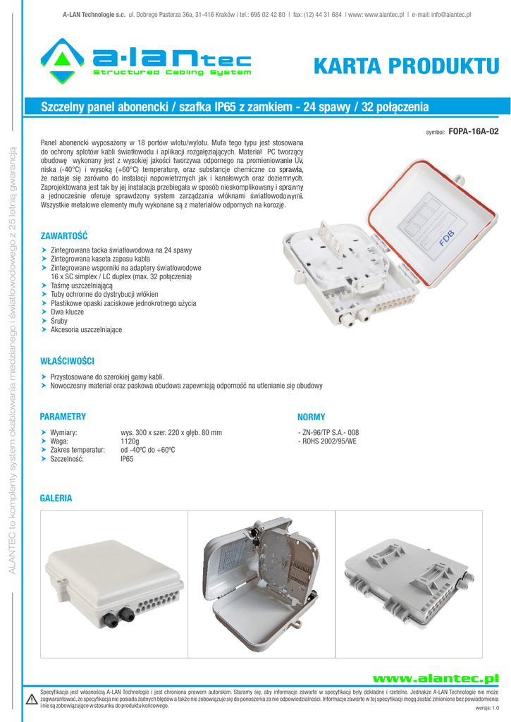 A-LAN Technologie s.c. ul. Dobrego Pasterza 36a, 31-416 Kraków | tel.: 695 02 42 80 | fax: (12) 44 31 684 | www: www.alantec.pl | e-mail: [email protected] KARTA PRODUKTU Szczelny panel abonencki / szafka IP65 z zamkiem - 24 spawy / 32 połączenia ALANTEC to komplenty system okablowania miedzianego i światłowodowego z 25 letnią gwarancją symbol: FOPA-16A-02 Panel abonencki wyposażony w 18 portów wlotu/wylotu. Mufa tego typu jest stosowana do ochrony splotów kabli światłowodu i aplikacji rozgałęziających. Materiał PC tworzący obudowę wykonany jest z wysokiej jakości tworzywa odpornego na promieniowanie UV, niska (-40°C) i wysoką (+60°C) temperaturę, oraz substancje chemiczne co sprawia, że nadaje się zarówno do instalacji napowietrznych jak i kanałowych oraz doziemnych. Zaprojektowana jest tak by jej instalacja przebiegała w sposób nieskomplikowany i sprawny a jednocześnie oferuje sprawdzony system zarządzania włóknami światłowodowymi. Wszystkie metalowe elementy mufy wykonane są z materiałów odpornych na korozję. ZAWARTOŚĆ Zintegrowana tacka światłowodowa na 24 spawy Zintegrowana kaseta zapasu kabla Zintegrowane wsporniki na adaptery światłowodowe 16 x SC simplex / LC duplex (max. 32 połączenia) Taśmę uszczelniającą Tuby ochronne do dystrybucji włókien Plastikowe opaski zaciskowe jednokrotnego użycia Dwa klucze Śruby Akcesoria uszczelniające WŁAŚCIWOŚCI Przystosowane do szerokiej gamy kabli. Nowoczesny materiał oraz paskowa obudowa zapewniają odporność na utlenianie się obudowy PARAMETRY Wymiary: Waga: Zakres temperatur: Szczelność: NORMY wys. 300 x szer. 220 x głęb. 80 mm 1120g od -40ºC do +60ºC IP65 - ZN-96/TP S.A.- 008 - ROHS 2002/95/WE GALERIA www.alantec.pl Specyfikacja jest własnością A-LAN Technologie i jest chroniona prawem autorskim. Staramy się, aby informacje zawarte w specyfikacji były dokładne i rzetelne. Jednakże A-LAN Technologie nie może zagwarantować, że specyfikacja nie posiada żadnych błędów a także nie zobowiązuje się do ponoszenia za nie odpowiedzialności. Informacje zawarte w tej specyfikacji mogą zostać zmienione bez powiadomienia i nie są zobowiązujące w stosunku do produktu końcowego. wersja: 1.0