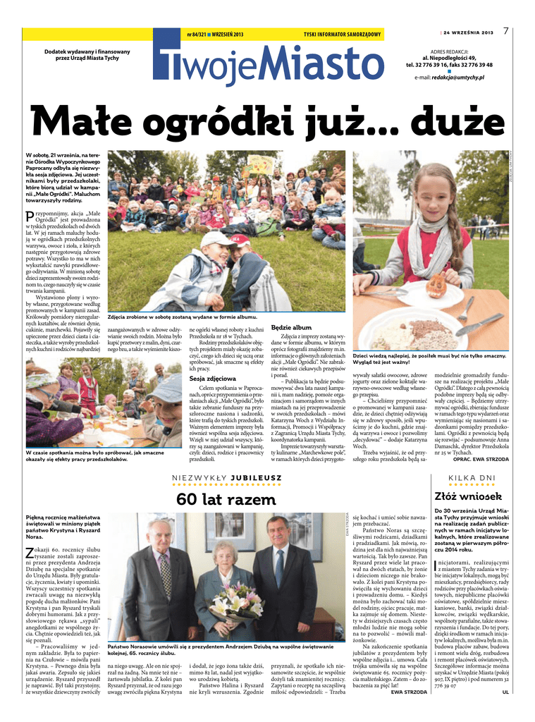 nr 84/321 wrzesień 2013 Tyski Informator Samorządowy Dodatek wydawany i finansowany przez Urząd Miasta Tychy T woje t yc hy | 2 4 wrze ś n i a 2 0 13 7 Adres redakcji: al. Niepodległości 49, tel. 32 776 39 16, faks 32 776 39 48 e-mail: [email protected] zdjęcia: UM tychy Małe ogródki już... duże W sobotę, 21 września, na terenie Ośrodka Wypoczynkowego Paprocany odbyła się niezwykła sesja zdjęciowa. Jej uczestnikami były przedszkolaki, które biorą udział w kampanii „Małe Ogródki”. Maluchom towarzyszyły rodziny. P rzypomnijmy, akcja „Małe Ogródki” jest prowadzona w tyskich przedszkolach od dwóch lat. W jej ramach maluchy hodują w ogródkach przedszkolnych warzywa, owoce i zioła, z których następnie przygotowują zdrowe potrawy. Wszystko to ma w nich wykształcić nawyki prawidłowego odżywiania. W minioną sobotę dzieci zaprezentowały swoim rodzinom to, czego nauczyły się w czasie trwania kampanii. Wystawiono plony i wyroby własne, przygotowane według promowanych w kampanii zasad. Królowały pomidory nieregularnych kształtów, ale również dynie, cukinie, marchewki. Pojawiły się upieczone przez dzieci ciasta i ciasteczka, a także wyroby przedszkolnych kuchni i rodziców najbardziej Zdjęcia zrobione w sobotę zostaną wydane w formie albumu. zaangażowanych w zdrowe odżywianie swoich rodzin. Można było kupić przetwory z malin, dyni, czarnego bzu, a także wyśmienite kiszo- ne ogórki własnej roboty z kuchni Przedszkola nr 18 w Tychach. Rodziny przedszkolaków objętych projektem miały okazję zobaczyć, czego ich dzieci się uczą oraz spróbować, jak smaczne są efekty ich pracy. Sesja zdjęciowa Celem spotkania w Paprocanach, oprócz przypomnienia o przesłaniach akcji „Małe Ogródki”, było także zebranie funduszy na przyszłoroczne nasiona i sadzonki, które trafią do tyskich przedszkoli. Ważnym elementem imprezy była również wspólna sesja zdjęciowa. Wzięli w niej udział wszyscy, którzy są zaangażowani w kampanię, czyli: dzieci, rodzice i pracownicy przedszkoli. W czasie spotkania można było spróbować, jak smaczne okazały się efekty pracy przedszkolaków. Będzie album Zdjęcia z imprezy zostaną wydane w formie albumu, w którym oprócz fotografii znajdziemy m.in. informacje o głównych założeniach akcji „Małe Ogródki”. Nie zabraknie również ciekawych przepisów i porad. – Publikacja ta będzie podsumowywać dwa lata naszej kampanii i, mam nadzieję, pomoże organizacjom i samorządom w innych miastach na jej przeprowadzenie w swoich przedszkolach – mówi Katarzyna Woch z Wydziału Informacji, Promocji i Współpracy z Zagranicą Urzędu Miasta Tychy, koordynatorka kampanii. Imprezie towarzyszyły warsztaty kulinarne „Marchewkowe pole”, w ramach których dzieci przygoto- Dzieci wiedzą najlepiej, że posiłek musi być nie tylko smaczny. Wygląd też jest ważny! wywały sałatki owocowe, zdrowe jogurty oraz zielone koktajle warzywno-owocowe według własnego przepisu. – Chcieliśmy przypomnieć o promowanej w kampanii zasadzie, że dzieci chętniej odżywiają się w zdrowy sposób, jeśli wpuścimy je do kuchni, gdzie znajdą warzywa i owoce i pozwolimy „decydować” – dodaje Katarzyna Woch. Trzeba wyjaśnić, że od przyszłego roku przedszkola będą sa- modzielnie gromadziły fundusze na realizację projektu „Małe Ogródki”. Dlatego z całą pewnością podobne imprezy będą się odbywały częściej. – Będziemy utrzymywać ogródki, zbierając fundusze w ramach tego typu wydarzeń oraz wymieniając się nasionami i sadzonkami pomiędzy przedszkolami. Ogródki z pewnością będą się rozwijać – podsumowuje Anna Damaschk, dyrektor Przedszkola nr 25 w Tychach. Oprac. Ewa Strzoda N i e z w y k ły j u b i l e u s z kilka dni 60 lat razem ewa strzoda Piękną rocznicę małżeństwa świętowali w miniony piątek państwo Krystyna i Ryszard Noras. Z okazji 60. rocznicy ślubu tyszanie zostali zaproszeni przez prezydenta Andrzeja Dziubę na specjalne spotkanie do Urzędu Miasta. Były gratulacje, życzenia, kwiaty i upominki. Wszyscy uczestnicy spotkania zwracali uwagę na niezwykłą pogodę ducha małżonków. Pani Krystyna i pan Ryszard tryskali dobrymi humorami. Jak z przysłowiowego rękawa „sypali” anegdotkami ze wspólnego życia. Chętnie opowiedzieli też, jak się poznali. – Pracowaliśmy w jednym zakładzie. Była to papiernia na Czułowie – mówiła pani Krystyna. – Pewnego dnia była jakaś awaria. Zepsuło się jakieś urządzenie. Ryszard przyszedł je naprawić. Był taki przystojny, że wszystkie dziewczyny zwróciły Złóż wniosek Państwo Norasowie umówili się z prezydentem Andrzejem Dziubą na wspólne świętowanie kolejnej, 65. rocznicy ślubu. na niego uwagę. Ale on nie spojrzał na żadną. Na mnie też nie – żartowała jubilatka. Z kolei pan Ryszard przyznał, że od razu jego uwagę zwróciła piękna Krystyna i dodał, że jego żona także dziś, mimo 82 lat, nadal jest wyjątkowo urodziwą kobietą. Państwo Halina i Ryszard nie kryli wzruszenia. Zgodnie przyznali, że spotkało ich niesamowite szczęście, że wspólnie dożyli tak znamienitej rocznicy. Zapytani o receptę na szczęśliwą miłość odpowiedzieli: – Trzeba się kochać i umieć sobie nawzajem przebaczać. Państwo Noras są szczęśliwymi rodzicami, dziadkami i pradziadkami. Jak mówią, rodzina jest dla nich najważniejszą wartością. Tak było zawsze. Pan Ryszard przez wiele lat pracował na dwóch etatach, by żonie i dzieciom niczego nie brakowało. Z kolei pani Krystyna poświęciła się wychowaniu dzieci i prowadzeniu domu. – Kiedyś można było zachować taki model rodziny, ojciec pracuje, matka zajmuje się domem. Niestety w dzisiejszych czasach często młodzi ludzie nie mogą sobie na to pozwolić – mówili małżonkowie. Na zakończenie spotkania jubilatów z prezydentem były wspólne zdjęcia i... umowa. Cała trójka umówi