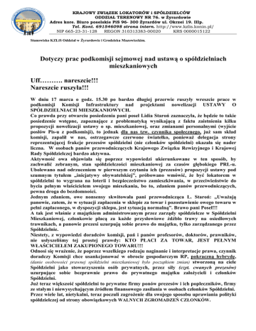 KRAJOWY ZWI ZEK LOKATORÓW i SPÓ DZIELCÓW ODDZIA TERENOWY NR 76. w yrardowie Adres kore. Biuro poselskie PiS 96- 300 yrardów ul. Okrzei 19. IIIp. Tel. Kont. 691546098 strona intern. http://www.kzlis.konin.pl/ NIP 665-23-31-128 REGON 310313383-00020 KRS 0000015122 Stanowisko KZLiS Oddzia w yrardowie i Grodzisku Mazowieckim. Dotyczy prac podkomisji sejmowej nad ustaw o spó dzielniach mieszkaniowych Uff………. nareszcie!!! Nareszcie ruszy a!!! W dniu 17 marca o godz. 15.30 po bardzo d ugiej przerwie ruszy y wreszcie prace w podkomisji Komisji Infrastruktury nad projektami nowelizacji USTAWY O SPÓ6DZIELNIACH MIESZKANIOWYCH. Co prawda przy otwarciu posiedzenia pani pose Lidia Staro: zaznaczy a, <e b=dzie to takie posiedzenie wst=pne, zapoznaj ce z problematyk wynikaj c z faktu zaistnienia kilku propozycji nowelizacji ustawy o sp. mieszkaniowej, oraz zmianami personalnymi (wyj?cie pos ów Pis-u z podkomisji), to jednak dla nas tzw. czynnika spo ecznego, ju< sam sk ad komisji, zapali w nas, ostrzegawcze czerwone ?wiate ko, poniewa< delegacja strony reprezentuj cej frakcje prezesów spó dzielni (nie cz onków spó dzielni) okaza a si= nader liczna. W osobach panów przewodnicz cych Krajowego Zwi zku Rewizyjnego i Krajowej Rady Spó dzielczej bardzo aktywna. Aktywno?C owa objawia a si= poprzez wypowiedzi ukierunkowane w ten sposób, by zachwaliC zebranym, stan spó dzielczo?ci mieszkaniowej za czasów g =bokiego PRL-u. Ubolewano nad odrzuceniem w pierwszym czytaniu ich (prezesów) propozycji ustawy pod szumnym tytu em „inicjatywy obywatelskiej”, próbowano wmówiC, <e byC lokatorem w spó dzielni to wygrana na loterii i bezpiecze:stwo zamieszkiwania, w przeciwie:stwie do bycia pe nym w a?cicielem swojego mieszkania, bo to, zdaniem panów przewodnicz cych, pewna droga do bezdomno?ci. Jednym zdaniem, owe nonsensy skwitowa a pani przewodnicz ca L. Staro:: „Uwa<aj panowie, zatem, <e w sytuacji zap acenia w sklepie za towar i pozostawienie owego towaru w pe ni zap aconego, w dyspozycji sklepu, jest sytuacj normaln ”. Brawo pani Pose !!! A tak jest w a?nie z maj tkiem administrowanym przez zarz dy spó dzielcze w Spó dzielni Mieszkaniowej, cz onkowie p ac za ka<de przys owiowe IdIb o trawy na osiedlowych trawnikach, a panowie prezesi uzurpuj sobie prawo do maj tku, tylko zarz dzanego przez Spó dzielnie. Niestety, z wypowiedzi doradców komisji, pa: i panów profesorów, doktorów, prawników, nie us yszeli?my tej prostej prawdy: KTO P6ACI ZA TOWAR, JEST PE6NYM W6AJCICIELEM ZAKUPIONEGO TOWARU!!! Odnosi si= wra<enie, <e poprzez wszelkiego rodzaju naginanie i interpretacje prawa, czynnik doradczy Komisji chce usankcjonowaC w obrocie gospodarczym RP, pokraczn hybryd=, (danie osobowo ci prawnej spó dzielni mieszkaniowej by o pocz tkiem zmian) stworzon na ciele Spó dzielni jako stowarzyszenia osób prywatnych, przez si y (czyt. cwanych prezesów) uzurpuj ce sobie bezprawnie prawo do prywatnego maj tku za o<ycieli i cz onków Spó dzielni. Ju< teraz wi=kszo?C spó dzielni to prywatne firmy ponów prezesów i ich popleczników, firmy ze sta ym i niewysychaj cym Iród em finansowego zasilania w osobach cz onków Spó dzielni. Przez wiele lat, nietykalni, teraz poczuli zagro<enie dla swojego sposobu uprawiania polityki spó dzielczej od strony obowi zkowych WALNYCH ZGROMADZEK CZ6ONKÓW. Na posiedzeniu Komisji odczu o si= to dobitnie w szermierce s ownej pomi=dzy przedstawicielami KZLiS-u i przewodnicz cym KRS, tak w czasie posiedzenia, jak te< ju< po zamkni=ciu podkomisji w luInej dyskusji. Podsumowuj c: To, co napisa em powy<ej, nie jest dla zwyk ego cz onka spó dzielni mieszkaniowej, a tak<e dla w a?cicieli mieszka:, w których zamieszkuj wraz z rodzinami, buduj ce. To, co napisa em, dla uwa<nego czytelnika - spó dzielcy, powinno byC sygna em do podniesienia swojego poziomu wiedzy na temat jak dzia a spó dzielnia i jakie prawa i obowi zki wynikaj z przynale<no?ci dla jej cz onków. A tym samym, powinno zwi=kszyC obecno?C przedstawicieli czynnika spo ecznego na podkomisjach sejmowych (ka dy mo e uczestniczy w pracach podkomisji sejmowych, po wcze niejszym zg oszeniu ch ci uczestnictwa w pracach) do poziomu przewy<szaj cego stan delegacji prezesów (KRS). Oni pilnuj swoich interesów, dlaczego Spó dzielca daje si= otumaniaC i nie walczy o przywrócenie normalno?ci w swoim stowarzyszeniu?! aden pose nie zast pi czynnego udzia u nad pracami ku poprawie naszego prawa w a?cicielskiego do mieszka:, za które w pe ni zap acili?my. Bo Pose , jest jak komputer bez programu, wrzuCmy swoim pos om temat SPÓ6DZIELNIA. Rozliczmy ich, gdy pope ni grzech zaniechania. Ale popierajmy, gdy pracuj dla nas. Na posiedzeniu podkomisji w dniu 17 marca 2011 roku pani pose Lidia Staro: da a sygna , <e jeste?my jako cz onkowie, w a?cicielami ca ego maj tku zarz dzanego przez administracj= spó dzielcz . Na nas kolej pomóc Pos om i Profesorom w pracach ku normalno?ci, by teoria równa a si= z praktyk . Nie zawsze wiedza teoretyczna ekspertów, nawet z tytu ami profesora, daje gwarancj= poprawno?ci prawa. Ale w powi zaniu z praktyk daje tak gwarancj=. Dlatego Spó dzielco!!! Zapytaj swojego pos a jak dostaC si= do Sejmu i uczestniczyC w pracach by nie zostaC wycyganionym (przez uzurpatora!) ze swojego maj tku w postaci dóbr zarz dzanych (tylko!!!) przez personel najemny ka<dej spó dzielni mieszkaniowej w RP. Przedstawiciele KZLiS postanowili po czyC si y ze stowarzyszeniem SOS Nasz Dom i przedstawiC wspólne stanowisko na najbli<szych obradach podkomisji. Uczestnicy Podkomisji Sejmowej Komisji Infrastruktury Z ramienia KZLiS-u Wies aw 6=cki i Janusz Okurowski Dnia 18. 03. 2011 r. DO SPÓ6DZIELCÓW MIESZKANIOWYCH w YRARDOWIE (i nie tylko) Otó<, najwy<szy czas aby?my jako cz onkowie – w a?ciciele wszystkich zasobów spó dzielczych, w swoim my?leniu, zapomnieli o tym, <e zarz d spó dzielni mieszkaniowej jest w adz spó dzielni, tak samo zreszt , nale<y potraktowaC rad= nadzorcz . • Najwy<szy czas, aby?my my