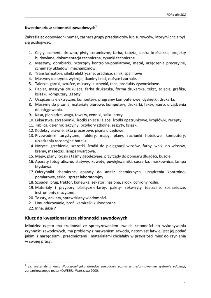 FORa dla SDZ Kwestionariusz skłonności zawodowych1 Zakreślając odpowiedni numer, zaznacz grupy przedmiotów lub surowców, którymi chciałbyś się posługiwać. 1. Cegły, cement, drewno, płyty ceramiczne, farba, tapeta, deska kreślarska, projekty budowlane, dokumentacja techniczna, rysunki techniczne. 2. Maszyny, obrabiarki, przyrządy kontrolno-pomiarowe, metal, urządzenia precyzyjne, schematy układów i mechanizmów. 3. Transformatory, silniki elektryczne, prądnice, silniki spalinowe 4. Maszyny do szycia, wykroje, tkaniny i nici, nożyce i żurnale. 5. Talerze, garnki, sztućce, miksery, kuchenki, tace, produkty żywnościowe. 6. Papier, maszyna drukująca, farba drukarska, forma drukarska, tekst, zdjęcia, grafika, książki, komputery, gazety. 7. Urządzenia elektryczne, komputery, programy komputerowe, dyskietki, drukarki. 8. Maszyny do pisania, materiały biurowe, komputery, drukarki, faksy, ksero, urządzenia do księgowania. 9. Kasa, pieniądze, waga, towary, cenniki, kalkulatory. 10. Lekarstwa, szczepionki, środki znieczulające, środki opatrunkowe, kroplówki, recepty. 11. Tablica, dziennik lekcyjny, przybory szkolne, zeszyty, książki. 12. Kodeksy prawne, akta procesowe, pisma urzędowe. 13. Przewodniki turystyczne, foldery, mapy, plany, rachunki hotelowe, komputery, urządzenia recepcyjne hotelu. 14. Nożyce, grzebienie, szczotki, środki do pielęgnacji włosów, farby, wałki do włosów, kremy, maseczki, lampa kwarcowa. 15. Mapy, plany, tyczki i taśmy geodezyjne, przyrządy do pomiaru długości, busole. 16. Aparaty fotograficzne, statywy, kuwety, powiększalniki, suszarka, maskownica, lampa błyskowa. 17. Odczynniki chemiczne, aparaty do analiz chemicznych, urządzenia kontrolnopomiarowe, szkło i sprzęt laboratoryjny. 18. Szpadel, pług, traktor, konewka, sekator, nasiona, środki ochrony roślin. 19. Materiały i przybory plastyczne-farby, palety- rekwizyty teatralne, scenariusze, instrumenty muzyczne. 20. Teksty, ankiety, sprawdziany wiadomości. 21. Umundurowanie, broń, kamizelki kuloodporne. 22. Inne, jakie ? Klucz do kwestionariusza skłonności zawodowych Młodzież często ma trudności ze sprecyzowaniem swoich skłonności do wykonywania czynności zawodowych, ma problemy z nazwaniem zawodu, natomiast łatwiej jest jej podać jakimi z narzędziami, przedmiotami i materiałami chciałaby w przyszłości mieć do czynienia w swojej pracy. 1 za: materiały z kursu Nauczyciel jako doradca zawodowy ucznia w zreformowanym systemie edukacji, zorganizowanego przez KOWEZiU, Warszawa 2000. 1 FORa dla SDZ Kwestionariusz Skłonności Zawodowych obejmuje zatem pytania dotyczące 21 grup zawodowych. Kwestionariusz ten może stanowić podstawę do określenia przybliżonej dziedziny zainteresowań ucznia. Numer grupy przedmiotów Grupa zawodów lub zawód 1. 2. budowlane mechaniczne elektryczne, energetyczne (w tym kolejowe) odzieżowe gastronomiczne, garmażeryjne poligraficzne elektroniczne, informatyczne ekonomiczne, administracyjne handlowe medyczne nauczyciel różnych przedmiotów prawnicze hotelarskie, turystyczne fryzjer, kosmetyczka geodeta fotograf chemiczne rolnicze, ogrodnicze artystyczne, plastyczne psycholog, pedagog policyjne, wojskowe ? 3. 4. 5. 6. 7. 8. 9. 10. 11. 12. 13. 14. 15. 16. 17. 18. 19. 20. 21. 22. 2 FORa dla SDZ Szeregowanie przedmiotów szkolnych2 Niżej przedstawiono zestaw przedmiotów, których uczesz się w szkole. Uszereguj je w kolejności od najbardziej lubianych(ciekawych) do najmniej lubianych (nudnych) Język polski Historia Język obcy Matematyka Fizyka Chemia Biologia Geografia Informatyka i technika Sztuka WOS Wychowanie fizyczne 1. ……………………., 2. ……………………., 3. ……………………., 4. ……………………., 5. ……………………., 6. ……………………., 7. ……………………., 8. ……………………., 9. ……………………., 10. ……………………., 11. ……………………., 12. ……………………., Ocena - skłonności zawodowe a zainteresowania przedmiotami szkolnymi: 1. Człowiek-człowiek – j. polski, biologia, historia, wychowanie fizyczne, wos; 2. Człowiek-technika – matematyka, fizyka, informatyka, technika; 3. Człowiek-przyroda – biologia, chemia, fizyka; 4. Człowiek-system znaków – geografia, matematyka, chemia, fizyka, informatyka; 5. Człowiek-działalność artystyczna – j. polski, sztuka, informatyka, technika. 2 za: materiały z kursu Nauczyciel jako doradca zawodowy ucznia w zreformowanym systemie edukacji, zorganizowanego przez KOWEZiU w Warszawa 2000. 3
