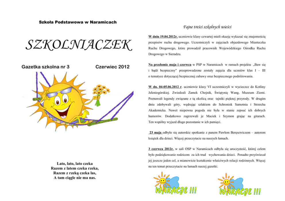 Szkoła Podstawowa w Naramicach SZKOLNIACZEK Gazetka szkolna nr 3 Czerwiec 2012 Fajne treści szkolnych wieści W dniu 19.04.2012r. uczniowie klasy czwartej mieli okazję wykazać się znajomością przepisów ruchu drogowego. Uczestniczyli w zajęciach objazdowego Miasteczka Ruchu Drogowego, które prowadził pracownik Wojewódzkiego Ośrodka Ruchu Drogowego w Sieradzu. Na przełomie maja i czerwca w PSP w Naramicach w ramach projektu „Baw się i bądź bezpieczny” przeprowadzone zostały zajęcia dla uczniów klas I – III o tematyce dotyczącej bezpiecznej zabawy oraz bezpiecznego podróżowania. W dn. 04-05.06.2012 r. uczniowie klasy VI uczestniczyli w wycieczce do Kotliny Jeleniogórskiej. Zwiedzali Zamek Chojnik, Świątynię Wang, Muzeum Ziemi. Poznawali legendy związane z tą okolicą oraz tajniki pięknej przyrody. W drugim dniu zdobywali góry, wędrując szlakiem do Schronisk Samotnia i Strzecha Akademicka. Nawet niepewna pogoda nie była w stanie zepsuć ich dobrych humorów. Dodatkowo zagrzewali je Maciek i Szymon grając na gitarach. Ten wspólny wyjazd długo pozostanie w ich pamięci. 23 maja odbyło się autorskie spotkanie z panem Pawłem Beręsewiczem – autorem książek dla dzieci. Więcej przeczytacie na naszych łamach. 3 czerwca 2012r. w sali OSP w Naramicach odbyła się uroczystość, której celem było podziękowanie rodzicom za ich trud wychowania dzieci. Ponadto przyświecał Lato, lato, lato czeka Razem z latem czeka rzeka, Razem z rzeką czeka las, A tam ciągle nie ma nas. jej jeszcze jeden cel, a mianowicie kształcenie właściwych relacji rodzinnych. Więcej na ten temat przeczytacie na łamach naszej gazetki. Dzień Rodziny 3 czerwca w Sali OSP w Naramicach odbyła się Dzień Zapraszamy do przeczytania wyjątkowego wywiadu, Rodziny. Uroczystość ta została zorganizowana przez naszą którego udzieliła nam pani Agata Grzybek – wasza szkołę, szkolną bibliotekę i przedszkole. Część artystyczną ulubiona nauczycielka. przygotowały 1. Kiedy postanowiła Pani zostać nauczycielem? i nauczycielki przedszkola. Marzyłam o zawodzie nauczyciela już od wczesnego Na uroczystość przybyło dużo gości. Swą obecnością panie: Agata Grzybek, Anna Jajczak dzieciństwa. zaszczycili nas: Wójt Gminy, Pani Sekretarz i przewodniczący Rady Gminy oraz 2. Jakiego przedmiotu nie lubiła Pani w szkole? mieszkańcy Naramic i pobliskich wiosek. Wszystkich gości serdecznie powitała W szkole średniej nie lubiła fizyki. dyrektor szkoły Henryka Halusiak oraz dyrektor przedszkola Dorota Cicha. 3. Z którą klasą pracuje się Pani najlepiej i Część dlaczego? przedszkolaków. W ich wykonaniu usłyszeliśmy wierszyki i piosenki. artystyczna rozpoczęła się od występów najmłodszych dzieci – Właściwie lubię pracować ze wszystkimi klasami, ale najbardziej lubię uczniów, Kolejnym punktem spotkania były skecze przygotowanie przez starszych uczniów. którzy mają zacięcie teatralne i bogatą wyobraźnię. Z takimi uczniami można tworzyć Szczególnie dużo uśmiechu pojawiło się na twarzach gości, kiedy oglądali skecz pt. dużo fajnych rzeczy. „Wieś”. 4. Gdzie Pani najbardziej lubi spędzać wakacje? Ale wszyscy czekali na wystawienie „Skąpca” Moliera. Wakacje lubię spędzać w swoim domu i w swoim ulubionym ogródku. zawiodła widzów, ponieważ jako reżyser spisała się doskonale. Bardzo dobrze 5. Co Pani sprawia najwięcej przyjemności w pracy z dziećmi? obsadziła role, dobrała odpowiednią muzykę i rekwizyty. Chyba wszyscy się zgodzą W pracy z dziećmi najwięcej przyjemności sprawiają mi sukcesy moich uczniów. z tym, że kominek został wykonany z odpowiednią precyzją i kunsztem plastycznym. Zdobywają oni różnorodne nagrody i wiedzą, że jeśli będzie się ciężko pracować to Dodajmy, że ten rekwizyt wykonały panie: Dorota Cicha i Bożena Leszczyńska. można w życiu osiągnąć bardzo dużo? Brawo!!! 6. Co Pani lubi robić w wolnym czasie? W przerwach można było zakupić lody, napoje i słodycze. Były też w sprzedaży W wolnym czasie zajmuję się pielęgnowaniem kwiatów. balony i soki w przepięknie, ręcznie malowanych butelkach. 7. Jakie jest Pani największe marzenie? Wszyscy świetnie się bawili i miło spędzili niedzielne popołudnie. Prosimy o więcej Jest to bardzo osobiste pytanie, ale chyba najbardziej marze o budowie domu. takich imprez!!! Tutaj pani Agata nie Opracowała Oliwia Hadryś Dziękujemy za wywiad. Wywiad przeprowadziły: Oliwia Hadryś, Kinga Nowak, Wiktoria Cieślak „Rodzina nie cieszy, nie cieszy, gdy jest, Lecz kiedy jej nie ma samotyś jak pies.” Autorskie spotkanie w szkolnej bibliotece Kącik dla rodziców 23 maja w szkolnej bibliotece odbyło się autorskie spotkanie z Uzależnienie od gier komputerowych panem Pawłem Beręsewiczem – autorem książek dla dzieci i młodzieży. Spotkanie to zorganizowała Dlaczego lubimy grać na komputerze? i – opinie graczy przygotowała pani Bożena Leszczyńska. • Na wstępie przybyły gość wyjawił zebranym, że był swego • czasu nauczycielem języka angielskiego. lubimy grać w odróżnieniu np. od kina. Jest to rozrywka, która posiada jedną niespotykaną w innych Oprócz pisania zajmuje się również tłumaczeniami książek i mediach cechę – interaktywność (gracz nie jest tworzeniem słowników angielsko – polskich i polsko – angielskich. Ale najwięcej satysfakcji sprawia mu jednak wymyślanie zabawnych i lubimy grać , bo gry dostarczają nam rozrywki; odbiorcą, ale uczestnikiem wydarzeń); pouczających historyjek, które później czytają młodzi pożeracze książek. • w grach dokonuje się zatarcie granicy między nauką a fantazją; Opowiedział nam również o swoim życiu i rodzinie. Otóż mieszka w Warszawie, • gra jest czymś, co można niemal w nieskończoność zgłębiać, dążąc do ma żonę i dwoje dzieci: chłopca i dziewczynkę. Bardzo ich kocha i to dla nich absolu