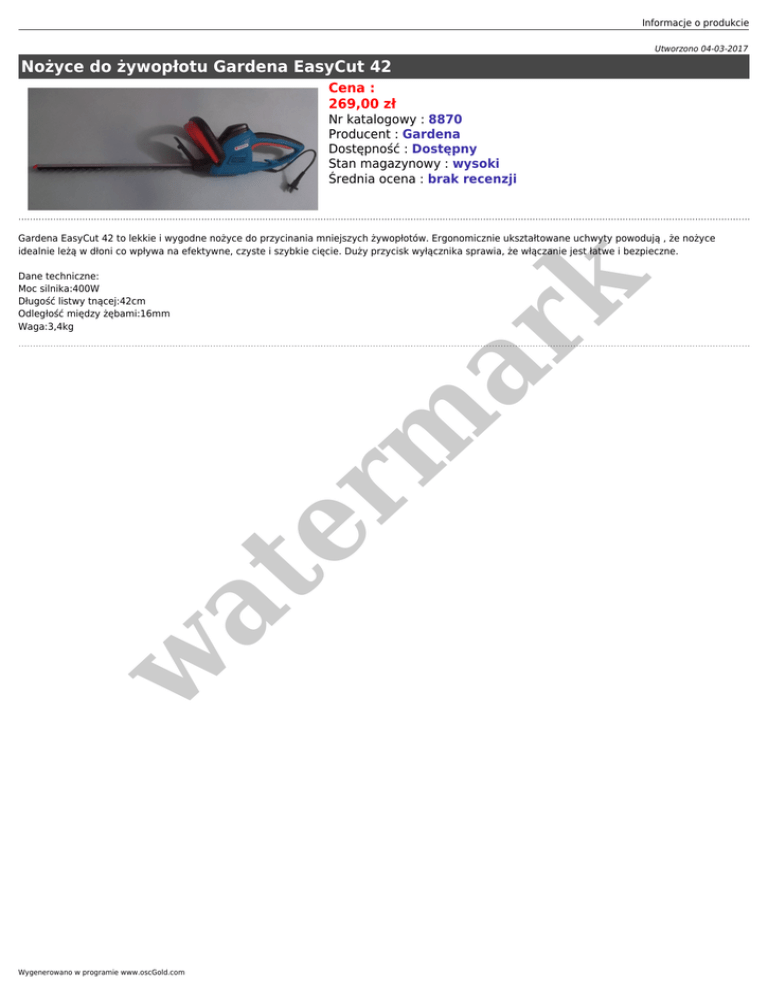 Informacje o produkcie Utworzono 04-03-2017 Nożyce do żywopłotu Gardena EasyCut 42 Cena : 269,00 zł Nr katalogowy : 8870 Producent : Gardena Dostępność : Dostępny Stan magazynowy : wysoki Średnia ocena : brak recenzji w at Dane techniczne: Moc silnika:400W Długość listwy tnącej:42cm Odległość między żębami:16mm Waga:3,4kg er m ar k Gardena EasyCut 42 to lekkie i wygodne nożyce do przycinania mniejszych żywopłotów. Ergonomicznie ukształtowane uchwyty powodują , że nożyce idealnie leżą w dłoni co wpływa na efektywne, czyste i szybkie cięcie. Duży przycisk wyłącznika sprawia, że włączanie jest łatwe i bezpieczne. Wygenerowano w programie www.oscGold.com