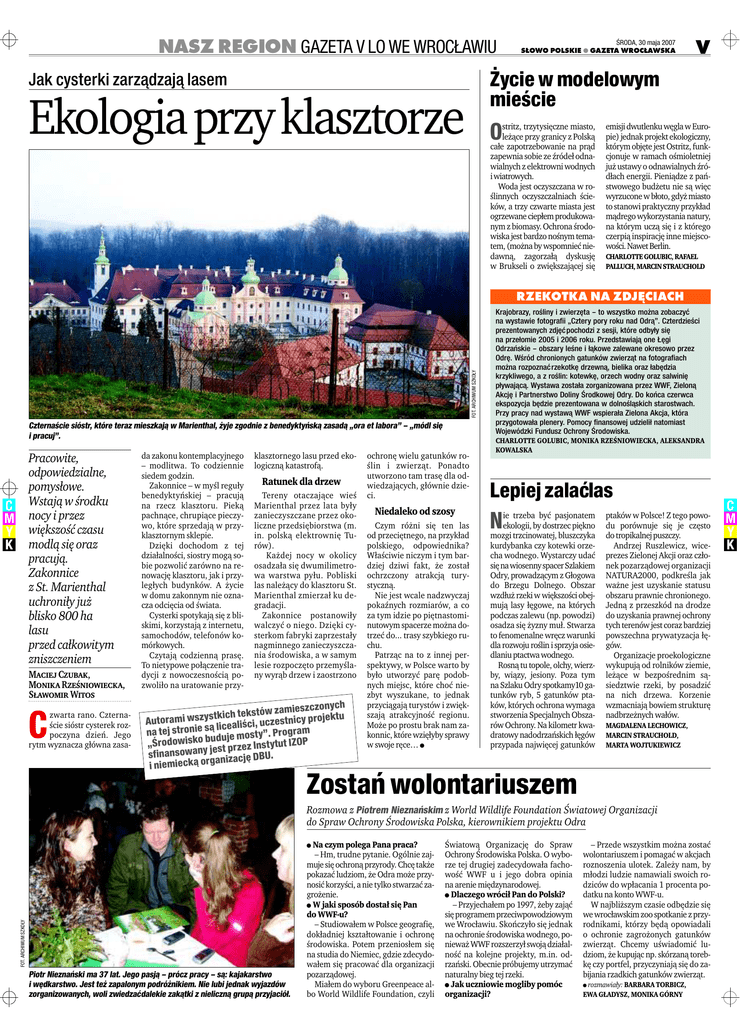 NASZ REGION GAZETA V LO WE WROCŁAWIU ŚRODA, 30 maja 2007 SŁOWO POLSKIE M GAZETA WROCŁAWSKA V Życie w modelowym mieście Jak cysterki zarządzają lasem Ekologia przy klasztorze O stritz, trzytysięczne miasto, leżące przy granicy z Polską całe zapotrzebowanie na prąd zapewnia sobie ze źródeł odnawialnych z elektrowni wodnych i wiatrowych. Woda jest oczyszczana w roślinnych oczyszczalniach ścieków, a trzy czwarte miasta jest ogrzewane ciepłem produkowanym z biomasy. Ochrona środowiska jest bardzo nośnym tematem, (można by wspomnieć niedawną, zagorzałą dyskusję w Brukseli o zwiększającej się emisji dwutlenku węgla w Europie) jednak projekt ekologiczny, którym objęte jest Ostritz, funkcjonuje w ramach ośmioletniej już ustawy o odnawialnych źródłach energii. Pieniądze z państwowego budżetu nie są więc wyrzucone w błoto, gdyż miasto to stanowi praktyczny przykład mądrego wykorzystania natury, na którym uczą się i z którego czerpią inspirację inne miejscowości. Nawet Berlin. CHARLOTTE GOLUBIC, RAFAEL PALLUCH, MARCIN STRAUCHOLD FOT. ARCHIWUM SZKOŁY RZEKOTKA NA ZDJĘCIACH Czternaście sióstr, które teraz mieszkają w Marienthal, żyje zgodnie z benedyktyńską zasadą „ora et labora” – „módl się i pracuj”. Pracowite, odpowiedzialne, pomysłowe. Wstają w środku nocy i przez większość czasu modlą się oraz pracują. Zakonnice z St. Marienthal uchroniły już blisko 800 ha lasu przed całkowitym zniszczeniem Maciej Czubak, Monika Rześniowiecka, Sławomir Witos C zwarta rano. Czternaście sióstr cysterek rozpoczyna dzień. Jego rytm wyznacza główna zasa- da zakonu kontemplacyjnego – modlitwa. To codziennie siedem godzin. Zakonnice – w myśl reguły benedyktyńskiej – pracują na rzecz klasztoru. Pieką pachnące, chrupiące pieczywo, które sprzedają w przyklasztornym sklepie. Dzięki dochodom z tej działalności, siostry mogą sobie pozwolić zarówno na renowację klasztoru, jak i przyległych budynków. A życie w domu zakonnym nie oznacza odcięcia od świata. Cysterki spotykają się z bliskimi, korzystają z internetu, samochodów, telefonów komórkowych. Czytają codzienną prasę. To nietypowe połączenie tradycji z nowoczesnością pozwoliło na uratowanie przy- klasztornego lasu przed ekologiczną katastrofą. Ratunek dla drzew Tereny otaczające wieś Marienthal przez lata były zanieczyszczane przez okoliczne przedsiębiorstwa (m. in. polską elektrownię Turów). Każdej nocy w okolicy osadzała się dwumilimetrowa warstwa pyłu. Pobliski las należący do klasztoru St. Marienthal zmierzał ku degradacji. Zakonnice postanowiły walczyć o niego. Dzięki cysterkom fabryki zaprzestały nagminnego zanieczyszczania środowiska, a w samym lesie rozpoczęto przemyślany wyrąb drzew i zaostrzono onych kstów zamieszcz te h ic tk ys sz jektu w ro i Autoram ci, uczestnicy p liś ea lic są ie n gram na tej stro duje mosty”. Pro „Środowisko bu st przez Inst ytut IZOP sfinansowany jeanizację DBU. i niemiecką org ochronę wielu gatunków roślin i zwierząt. Ponadto utworzono tam trasę dla odwiedzających, głównie dzieci. Niedaleko od szosy Czym różni się ten las od przeciętnego, na przykład polskiego, odpowiednika? Właściwie niczym i tym bardziej dziwi fakt, że został ochrzczony atrakcją turystyczną. Nie jest wcale nadzwyczaj pokaźnych rozmiarów, a co za tym idzie po piętnastominutowym spacerze można dotrzeć do... trasy szybkiego ruchu. Patrząc na to z innej perspektywy, w Polsce warto by było utworzyć parę podobnych miejsc, które choć niezbyt wyszukane, to jednak przyciągają turystów i zwiększają atrakcyjność regionu. Może po prostu brak nam zakonnic, które wzięłyby sprawy w swoje ręce… • Krajobrazy, rośliny i zwierzęta – to wszystko można zobaczyć na wystawie fotografii „Cztery pory roku nad Odrą”. Czterdzieści prezentowanych zdjęć pochodzi z sesji, które odbyły się na przełomie 2005 i 2006 roku. Przedstawiają one Łęgi Odrzańskie – obszary leśne i łąkowe zalewane okresowo przez Odrę. Wśród chronionych gatunków zwierząt na fotografiach można rozpoznać rzekotkę drzewną, bielika oraz łabędzia krzykliwego, a z roślin: kotewkę, orzech wodny oraz salwinię pływającą. Wystawa została zorganizowana przez WWF, Zieloną Akcję i Partnerstwo Doliny Środkowej Odry. Do końca czerwca ekspozycja będzie prezentowana w dolnośląskich starostwach. Przy pracy nad wystawą WWF wspierała Zielona Akcja, która przygotowała plenery. Pomocy finansowej udzielił natomiast Wojewódzki Fundusz Ochrony Środowiska. CHARLOTTE GOLUBIC, MONIKA RZEŚNIOWIECKA, ALEKSANDRA KOWALSKA Lepiej zalać las N ie trzeba być pasjonatem ekologii, by dostrzec piękno mozgi trzcinowatej, bluszczyka kurdybanka czy kotewki orzecha wodnego. Wystarczy udać się na wiosenny spacer Szlakiem Odry, prowadzącym z Głogowa do Brzegu Dolnego. Obszar wzdłuż rzeki w większości obejmują lasy łęgowe, na których podczas zalewu (np. powodzi) osadza się żyzny muł. Stwarza to fenomenalne wręcz warunki dla rozwoju roślin i sprzyja osiedlaniu ptactwa wodnego. Rosną tu topole, olchy, wierzby, wiązy, jesiony. Poza tym na Szlaku Odry spotkamy10 gatunków ryb, 5 gatunków ptaków, których ochrona wymaga stworzenia Specjalnych Obszarów Ochrony. Na kilometr kwadratowy nadodrzańskich łęgów przypada najwięcej gatunków ptaków w Polsce! Z tego powodu porównuje się je często do tropikalnej puszczy. Andrzej Ruszlewicz, wiceprezes Zielonej Akcji oraz członek pozarządowej organizacji NATURA2000, podkreśla jak ważne jest uzyskanie statusu obszaru prawnie chronionego. Jedną z przeszkód na drodze do uzyskania prawnej ochrony tych terenów jest coraz bardziej powszechna prywatyzacja łęgów. Organizacje proekologiczne wykupują od rolników ziemie, leżące w bezpośrednim sąsiedztwie rzeki, by posadzić na nich drzewa. Korzenie wzmacniają bowiem strukturę n