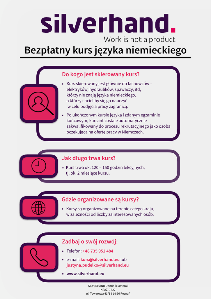 Bezpłatny kurs języka niemieckiego Do kogo jest skierowany kurs? • Kurs skierowany jest głównie do fachowców – elektryków, hydraulików, spawaczy, itd, którzy nie znają języka niemieckiego, a którzy chcieliby się go nauczyć w celu podjęcia pracy zagranicą. • Po ukończonym kursie języka i zdanym egzaminie końcowym, kursant zostaje automatycznie zakwalifikowany do procesu rekrutacyjnego jako osoba oczekująca na ofertę pracy w Niemczech. Jak długo trwa kurs? • Kurs trwa ok. 120 – 150 godzin lekcyjnych, tj. ok. 2 miesiące kursu. Gdzie organizowane są kursy? • Kursy są organizowane na terenie całego kraju, w zależności od liczby zainteresowanych osób. Zadbaj o swój rozwój: • Telefon: +48 735 952 484 • e-mail: [email protected] lub [email protected] • www.silverhand.eu SILVERHAND Dominik Matczak KRAZ: 7822 ul. Towarowa 41/1 61-896 Poznań