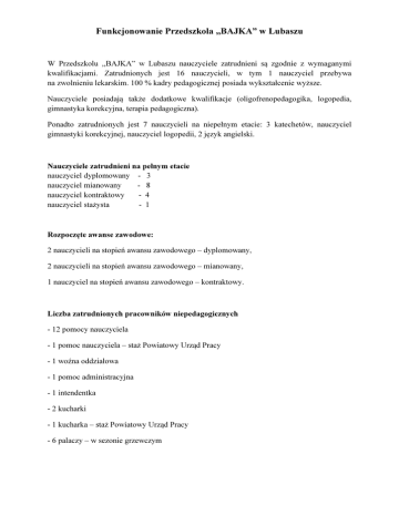 Funkcjonowanie Przedszkola ,,BAJKA” w Lubaszu W Przedszkolu ,,BAJKA” w Lubaszu nauczyciele zatrudnieni są zgodnie z wymaganymi kwalifikacjami. Zatrudnionych jest 16 nauczycieli, w tym 1 nauczyciel przebywa na zwolnieniu lekarskim. 100 % kadry pedagogicznej posiada wykształcenie wyższe. Nauczyciele posiadają także dodatkowe kwalifikacje (oligofrenopedagogika, logopedia, gimnastyka korekcyjna, terapia pedagogiczna). Ponadto zatrudnionych jest 7 nauczycieli na niepełnym etacie: 3 katechetów, nauczyciel gimnastyki korekcyjnej, nauczyciel logopedii, 2 język angielski. Nauczyciele zatrudnieni na pełnym etacie nauczyciel dyplomowany - 3 nauczyciel mianowany - 8 nauczyciel kontraktowy - 4 nauczyciel stażysta - 1 Rozpoczęte awanse zawodowe: 2 nauczycieli na stopień awansu zawodowego – dyplomowany, 2 nauczycieli na stopień awansu zawodowego – mianowany, 1 nauczyciel na stopień awansu zawodowego – kontraktowy. Liczba zatrudnionych pracowników niepedagogicznych - 12 pomocy nauczyciela - 1 pomoc nauczyciela – staż Powiatowy Urząd Pracy - 1 woźna oddziałowa - 1 pomoc administracyjna - 1 intendentka - 2 kucharki - 1 kucharka – staż Powiatowy Urząd Pracy - 6 palaczy – w sezonie grzewczym Realizujemy 3 innowacje pedagogiczne zatwierdzone przez Kuratorium Oświaty w Poznaniu: ,,Przygody bajkowych postaci inspiracją do głośnego czytania dzieciom” ,,Nasza Bajka wszystkim powie, jak należy dbać o zdrowie” ,,Bajkowa gimnastyka buzi i języka” Dzieci objęte pomocą psychologiczną Z orzeczeniem o niepełnosprawności – 3 dzieci Z opinią o wczesnym wspomaganiu – 1 dziecko Z opiniami o potrzebie zajęć korekcyjno – kompensacyjnych – 3 dzieci Z dziećmi bez opinii pracują nauczyciele dodatkowo – w porankach. Liczba godzin zajęć dodatkowych: Logopedia – 4 godziny + 4 godziny Gimnastyka korekcyjna – 1 godzina + 2 godziny Zajęcia o charakterze terapeutycznym Język angielski Religia – 1 godzina – 11,5 godziny + 1 godzina – 8 godzin Zajęcia rewalidacyjne – 2 godziny Inne cykliczne zajęcia dodatkowe: - Spotkania z muzyką – MUZOLAKI - Teatrzyki - Zajęcia plastyczno - techniczne - Zajęcia rytmiczno – taneczne - Zajęcia ogólnorozwojowe dla dzieci - Warsztaty dla Rodziców - Festyny integrujące wszystkie oddziały - Spotkania ze specjalistami dla dzieci i rodziców Bierzemy udział w akcjach: ,,Góra grosza”, ,,Cała Polska czyta dzieciom”, ,,Akademia aquafresh”. Godziny pracy - w Lubaszu - w Miłkowie - w Dębe - w Kamionce - w Prusinowie - w Kruczu - w Stajkowie Przedszkola: od 6.30 do 17.00 od 7.00 do 16.00 od 6.30 do 15.30 od 8.00 do 16.00 od 7.30 do 15.30 od 7.30 do 12.30 od 8.30 do 13.30 Żywienie dzieci w Przedszkolu Stawka dzienna żywieniowa wynosi 5,20 zł - śniadanie 1,90 zł - obiad 2,30 zł - podwieczorek 1,00 zł Koszt pobytu dziecka w przedszkolu w miesiącu wrześniu wynosi (22 dni) 5 godzin (śniadanie) – 41,80 zł 6 godzin (śniadanie + obiad) – 114,40 zł 9 godzina (śniadanie + obiad + podwieczorek) - 202,40 zł 10 godzin (śniadanie + obiad + podwieczorek) - 224,40 zł Stawka dzienna w oddziałach 5 godzinnych wynosi - napój 0,29 zł Koszt pobytu dziecka w Przedszkolu ( oddziały 5 godzinne) w miesiącu wrześniu wynosi (22 dni) - 6,38 zł W roku szkolnym 2016/2017 pracuje 13 oddziałów – 306 dzieci. Zwiększyła się liczba – o 32 dzieci Dodatkowo wydłużony czas pracy - po 8 godzin dziennie. w Oddziałach w Kamionce i Prusinowie Wydawane posiłki: Śniadania – 123 (Lubasz) Obiady – 203 (Lubasz, Goraj, Dębe, Kamionka, Miłkowo, Prusinowo) Podwieczorki – 143 (Lubasz, Goraj, Dębe, Kamionka, Miłkowo, Prusinowo) Współpracujemy: - z Poradnią Psychologiczno – Pedagogiczną w Czarnkowie - corocznie przeprowadzane są przesiewowe badania logopedyczne - ze Szkołami Podstawowymi – wspólne spotkanie z pedagogiem z CDN Piła na temat ,,Dojrzałości szkolnej dziecka 6 – 7 letniego” - z Gimnazjum – udostępnienie hali na różne większe imprezy, udostępnienie gabinetu logopedy na potrzeby indywidualnych spotkań dzieci z rodzicami - z Gminnym Ośrodkiem Kultury – wspólne organizowanie imprez dla dzieci - ze Strażą Pożarną, Policją, różnymi zakładami pracy i wieloma instytucjami. Rok szkolny 2016 / 2017 Liczba przyjętych dzieci do Przedszkola ,,BAJKA” w Lubaszu Oddział 2,5 latki 2014 3 latki 2013 Lubasz ul. Podgórna 2,5 – 3 l. Lubasz ul. Podgórna 3 l. Lubasz ul. Podgórna 4 l. Lubasz ul. Szkolna 4 - 5 l. Lubasz ul. Szkolna 5 l. 4 21 4 latki 2012 5 latki 2011 6 latki 2010 Razem 25 16 9 25 25 25 3 22 25 2 21 23 Goraj Goraj 24 24 2 17 19 Razem Lubasz 4 37 39 45 41 166 Dębe 2 1 6 5 4 18 3 4 11 7 25 Kamionka Krucz 1 3 7 6 8 25 Miłkowo 1 2 7 8 4 22 Prusinowo 2 5 11 7 25 Stajkowo 2 7 6 10 25 50 75 92 81 306 Razem 8 Podział na godziny Oddział 5 godz. 6 godz. 8 godz. 9 godz. więcej niż 9 godz. Lubasz Dębe Kamionka Miłkowo Prusinowo Oddziały Razem 24 5 9 12 7 50 107 43 8 0 5 3 0 59 0 0 16 0 15 0 31 83 5 0 5 0 0 93 16 0 0 0 0 0 16 Przeprowadzono remonty i modernizację Przedszkola - Lubasz Dla bezpieczeństwa dzieci zamontowano ogrodzenie na placu zabaw. Zamontowano piaskownicę. Remont kuchni – powiększono powierzchnię poprzez wyburzenie ściany. Zakupiono wyposażenie kuchni – taboret gazowy, patelnia elektryczna, okap, naczynia kuchenne. Zamontowano moskitiery na okna we wszystkich salach dydaktycznych na ul. Podgórnej 5. Zakupiono szafkę z półkami na pościel dzieci leżakujących. - Kamionka Modernizacja Oddziału Przedszkolnego (łazienki dla dzieci, kuchnia, szatnia, wymiana drzwi w pomieszczeniach). Zakup mebli, sprzętu i naczyń kuchennych. - Prusinowo Remont i wyposażenie kuchni w meble, sprzęt i naczynia kuchenne. Remont i malowanie korytarza i łazienki. Wymiana drzwi wewnętrznych (3 sztuki). - Stajkowo Niwelacja terenu. Wymiana ogrodzenia na placu zabaw ( modernizacja placu zabaw). Meble do szatni. - Goraj Wymiana okien w sali przedszkolnej