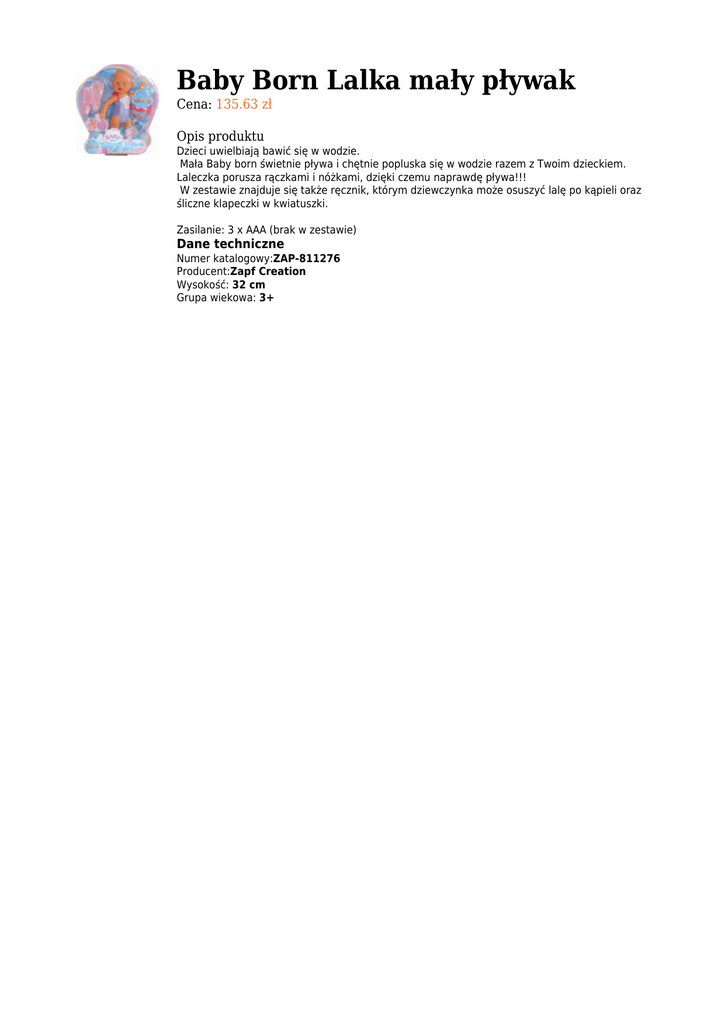 Baby Born Lalka mały pływak Cena: 135.63 zł Opis produktu Dzieci uwielbiają bawić się w wodzie. Mała Baby born świetnie pływa i chętnie popluska się w wodzie razem z Twoim dzieckiem. Laleczka porusza rączkami i nóżkami, dzięki czemu naprawdę pływa!!! W zestawie znajduje się także ręcznik, którym dziewczynka może osuszyć lalę po kąpieli oraz śliczne klapeczki w kwiatuszki. Zasilanie: 3 x AAA (brak w zestawie) Dane techniczne Numer katalogowy:ZAP-811276 Producent:Zapf Creation Wysokość: 32 cm Grupa wiekowa: 3+