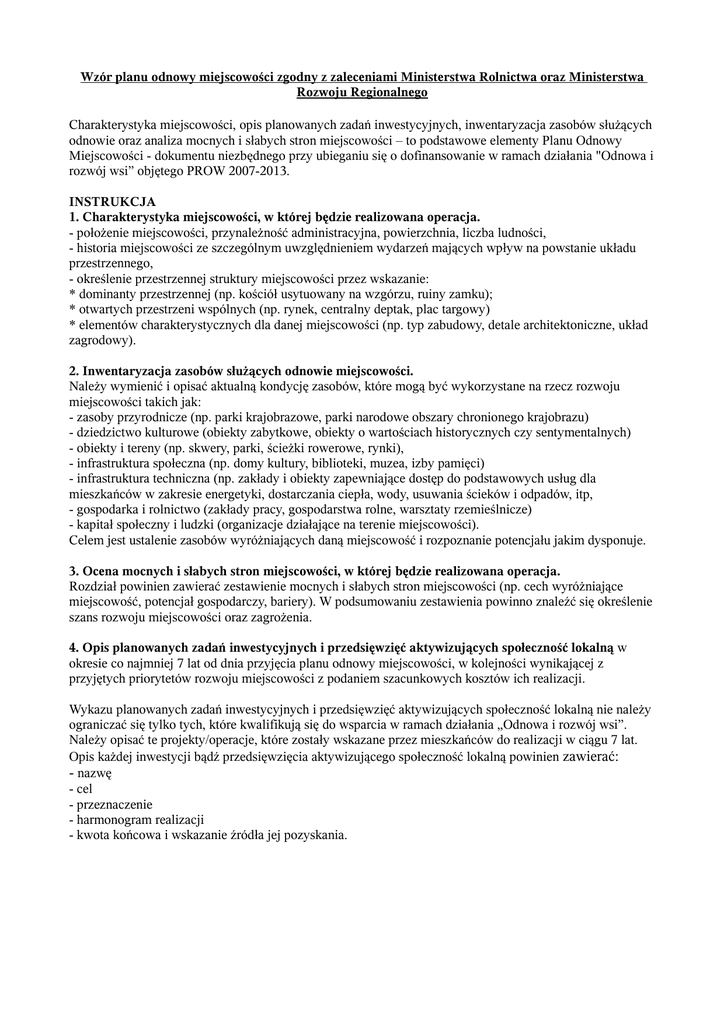 Wzór planu odnowy miejscowości zgodny z zaleceniami Ministerstwa Rolnictwa oraz Ministerstwa Rozwoju Regionalnego Charakterystyka miejscowości, opis planowanych zadań inwestycyjnych, inwentaryzacja zasobów służących odnowie oraz analiza mocnych i słabych stron miejscowości – to podstawowe elementy Planu Odnowy Miejscowości - dokumentu niezbędnego przy ubieganiu się o dofinansowanie w ramach działania "Odnowa i rozwój wsi” objętego PROW 2007-2013. INSTRUKCJA 1. Charakterystyka miejscowości, w której będzie realizowana operacja. - położenie miejscowości, przynależność administracyjna, powierzchnia, liczba ludności, - historia miejscowości ze szczególnym uwzględnieniem wydarzeń mających wpływ na powstanie układu przestrzennego, - określenie przestrzennej struktury miejscowości przez wskazanie: * dominanty przestrzennej (np. kościół usytuowany na wzgórzu, ruiny zamku); * otwartych przestrzeni wspólnych (np. rynek, centralny deptak, plac targowy) * elementów charakterystycznych dla danej miejscowości (np. typ zabudowy, detale architektoniczne, układ zagrodowy). 2. Inwentaryzacja zasobów służących odnowie miejscowości. Należy wymienić i opisać aktualną kondycję zasobów, które mogą być wykorzystane na rzecz rozwoju miejscowości takich jak: - zasoby przyrodnicze (np. parki krajobrazowe, parki narodowe obszary chronionego krajobrazu) - dziedzictwo kulturowe (obiekty zabytkowe, obiekty o wartościach historycznych czy sentymentalnych) - obiekty i tereny (np. skwery, parki, ścieżki rowerowe, rynki), - infrastruktura społeczna (np. domy kultury, biblioteki, muzea, izby pamięci) - infrastruktura techniczna (np. zakłady i obiekty zapewniające dostęp do podstawowych usług dla mieszkańców w zakresie energetyki, dostarczania ciepła, wody, usuwania ścieków i odpadów, itp, - gospodarka i rolnictwo (zakłady pracy, gospodarstwa rolne, warsztaty rzemieślnicze) - kapitał społeczny i ludzki (organizacje działające na terenie miejscowości). Celem jest ustalenie zasobów wyróżniających daną miejscowość i rozpoznanie potencjału jakim dysponuje. 3. Ocena mocnych i słabych stron miejscowości, w której będzie realizowana operacja. Rozdział powinien zawierać zestawienie mocnych i słabych stron miejscowości (np. cech wyróżniające miejscowość, potencjał gospodarczy, bariery). W podsumowaniu zestawienia powinno znaleźć się określenie szans rozwoju miejscowości oraz zagrożenia. 4. Opis planowanych zadań inwestycyjnych i przedsięwzięć aktywizujących społeczność lokalną w okresie co najmniej 7 lat od dnia przyjęcia planu odnowy miejscowości, w kolejności wynikającej z przyjętych priorytetów rozwoju miejscowości z podaniem szacunkowych kosztów ich realizacji. Wykazu planowanych zadań inwestycyjnych i przedsięwzięć aktywizujących społeczność lokalną nie należy ograniczać się tylko tych, które kwalifikują się do wsparcia w ramach działania „Odnowa i rozwój wsi”. Należy opisać te projekty/operacje, które zostały wskazane przez mieszkańców do realizacji w ciągu 7 lat. Opis każdej inwestycji bądź przedsięwzięcia aktywizującego społeczność lokalną powinien zawierać: - nazwę - cel - przeznaczenie - harmonogram realizacji - kwota końcowa i wskazanie źródła jej pozyskania. 1.Wstęp WPROWADZENIE:....................................................................... ................................................ DIAGNOZA STANU ISTNIEJĄCEGO: ............................................................................ 2. Charakterystyka sołectwa Położenie: .................................................... ...................................................... Podstawowe dane : Powierzchnia : Liczba ludności Ważniejsze drogi: Instytucje: Działalność kulturalna i sportowa: Organizacje; Położenie i środowisko przyrodnicze: Położenie komunikacyjne: Gospodarka: Historia: 3. Analiza zasobów. Analiza zasobów zawiera wykaz elementów materialnych oraz niematerialnych sołectwa, które mogą być wykorzystane dla rozwoju miejscowości , w działaniach na rzecz jego odnowy. Rodzaj zasobu, Opis (nazwanie) zasobu jakim wieś dysponuje Środowisko przyrodnicze, położenie Walory krajobrazu Walory klimatu Walory szaty roślinnej, świat zwierzęcy Wody powierzchniowe Wody podziemne Gleby, kopaliny, budowa geologiczna Drogi, dostępność komunikacyjna Sąsiedztwo Środowisko kulturowe Walory architektury wiejskiej, zabytki Walory ukształtowania przestrzeni publicznej Osobliwości, tradycje,miejsca i przedmioty kultu Historia, znani ludzie, wydarzenia Specyficzne nazwy, ciekawa nazwa miejscowości: Inne; Obiekty i tereny Tereny mieszkaniowe Tereny dla funkcji rekreacyjnoturystycznej Tereny dla działalności gospodarczej Miejsca tradycyjnych spotkań, place i miejsca publiczne Miejsca sportu i rekreacji Szlaki turystyczne, ścieżki dydaktyczne itp. Inne Gospodarka, rolnictwo Miejsca pracy Miejsca noclegowe, hotelowe, gastronomia itp. Mieszkańcy, kapitał społeczny Autorytety, znane postacie we wsi: Inne - 4. Diagnoza możliwości rozwojowych sołectwa. Co należy zrobić w miejscowości? .......................................................................................................... ...................................................................................... ANALIZA SWOT DIAGNOZA MOŻLIWOŚCI ROZWOJOWYCH SOŁECTWA Przeprowadzenie tzw. analizy SWOT jest jednym z czynników umożliwiających podjęcie prawidłowej decyzji na podstawie posiadanych informacji. Umożliwia usystematyzowanie danych dotyczących projektu i podpowiada kierunki rozwiązań. Przeprowadzenie jej jest niezbędne do prawidłowej oceny sytuacji. 1. SILNE STRONY - ATUTY ROZWOJU SOŁECTWA ..................................... .................... 2. SŁABE STRONY - CZYNNIKI OGRANICZAJĄCE ROZWÓJ SOŁECTWA .............................................. ...................