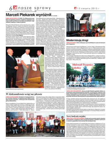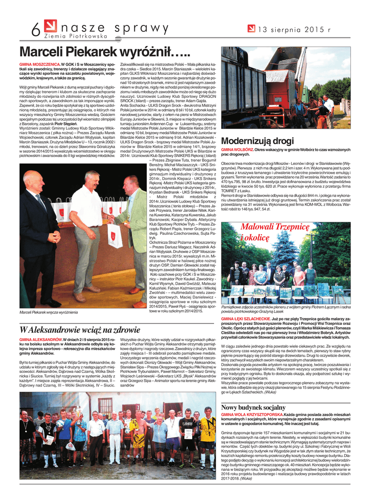 6 nasze sprawy Ziemia Piotrkowska 13 sierpnia 2015 r Marceli Piekarek wyróżnił….. GMINA MOSZCZENICA.W GOK i S w Moszczenicy spotkali się zawodnicy, trenerzy i działacze osiągający znaczące wyniki sportowe na szczeblu powiatowym, wojewódzkim, krajowym, a także za granicą. Wójt gminy Marceli Piekarek z dumą wręczał puchary i dyplomy dziękując trenerom i klubom za skuteczne zachęcanie młodzieży do rozwijania ich zdolności w różnych dyscyplinach sportowych, a zawodnikom za tak imponujące wyniki. Zapewnił, że co roku będzie spotykał się z tą sportowo uzdolnioną młodzieżą, prezentując jej osiągnięcia, o których nie wszyscy mieszkańcy Gminy Moszczenica wiedzą. Gościem specjalnym podczas tej uroczystości był wicemistrz olimpijski z Barcelony, zapaśnik Piotr Stępień. Wyróżnieni zostali: Gminny Ludowy Klub Sportowy Włókniarz Moszczenica ( piłka nożna) – Prezes Zarządu Marek Wojciechowski, członek Zarządu Adrian Wojtysiak, kapitan Marcin Staniaszek.Drużyna Młodzików U – 13, rocznik 2002 i młodsi, trenowani, na co dzień przez Sławomira Góralczyka w sezonie 2014/2015 wywalczyła wicemistrzostwo w okręgu piotrkowskim i awansowała do II ligi wojewódzkiej młodzików. Marceli Piekarek wręcza wyróżnienia Zakwalifikowali się na mistrzostwa Polski – Mała piłkarska kadra czeka – Siedlce 2015. Marcin Staniaszek – wieloletni kapitan GLKS Włókniarz Moszczenica i najbardziej doświadczony zawodnik, w każdym sezonie gwarantuje drużynie ponad 10 strzelonych bramek, mimo iż jest najstarszym zawodnikiem w drużynie, nigdy nie schodzi poniżej określonego poziomu i wielu młodszych zawodników może od niego się dużo nauczyć. Uczniowski Ludowy Klub Sportowy DRAGON SROCK ( bilard) – prezes zarządu, trener Adam Gajda. Anita Sochacka - ULKS Dragon Srock - dwukrotna Mistrzyni Polski juniorów w 2014r.w odmiany 8 bil i 10 bil, członek kadry narodowej juniorów, starty z orłem na piersi w Mistrzostwach Europy Juniorów w Słowenii, 3.miejsce w międzynarodowym turnieju juniorskim Ardennen Cup w Luksemburgu, srebrny medal Mistrzostw Polski Juniorów w Bilardzie Kielce 2015 w odmianę 10 bil, brązowy medal Mistrzostw Polski Juniorów w Bilardzie Kielce 2015 w odmianę 9 bil. Adrian Kozakowski ULKS Dragon Srock - brązowy medal Mistrzostw Polski Juniorów w Bilardzie Kielce 2015 w odmianę 14/1, brązowy medal Drużynowych Mistrzostw Polski UKS w Bilardzie w 2014r. Uczniowski Klub Sportowy SNIKERS Rękoraj ( bilard) – Prezes Zbigniew Tuta, trener Bogumił Bereźny. Michał Maciaszczyk - UKS Snikers Rękoraj - Mistrz Polski UKS kategoria gimnazjum indywidualny i drużynowy z 2014r., Dominik Klepacz - UKS Snikers Rękoraj -Mistrz Polski UKS kategoria gimnazjum indywidualny i drużynowy z 2014r., Krystian Bednarek - UKS Snikers Rękoraj Mistrz Polski młodzików z 2014r..Uczniowski Ludowy Klub Sportowy Moszczenica ( tenis stołowy) – Prezes Jacek Przywara, trener Jarosław Nitek. Karina Kuwerska, Katarzyna Kuwerska, Jakub Baranowski, Kacper Dybała. Atletyczny Klub Sportowy Piotrków Tryb.– Prezes Zarządu Robert Papis, trener Grzegorz Ludwig. Paulina Czechorowska, Sujta Patryk. Ochotnicza Straż Pożarna w Moszczenicy – Prezes Dariusz Magacz, Naczelnik Adrian Wojtysiak. Druhowie z OSP Moszczenica w marcu 2015r. wywalczyli m.in. Mistrzostwo Polski w halowej piłce nożnej drużyn OSP, Damian Głowacki został najlepszym zawodnikiem turnieju finałowego. Koło szachowe przy GOK i S w Moszczenicy – instruktor Piotr Kaukel. Zawodnicy Kamil Wysmyk, Dawid Gwóźdź, Mateusz Kałuziński. Fabian Kaźmierczak i Mikołaj Zwoliński - – multimedaliści wielu zawodów sportowych, Maciej Danielewicz osiągnięcia sportowe w roku szkolnym 2014/2015, Paweł Ryś - osiągnięcia sportowe w roku szkolnym 2014/2015. W Aleksandrowie wciąż na zdrowie GMINA ALEKSANDRÓW.W dniach 2 i 9 sierpnia 2015 roku na boisku szkolnym w Aleksandrowie odbyła się kolejna impreza sportowo - rekreacyjna dla mieszkańców gminy Aleksandrów. Był to turniej piłkarski o Puchar Wójta Gminy Aleksandrów, do udziału w którym zgłosiły się 4 drużyny z następujących miejscowości: Aleksandrów, Dąbrowa nad Czarną, Wólka Skotnicka i Siucice. Turniej był rozgrywany w systemie „każdy z każdym”. I miejsce zajęła reprezentacja Aleksandrowa, II – Dąbrowy nad Czarną, III – Wólki Skotnickiej, IV – Siucic. Wszystkie drużyny, które wzięły udział w rozgrywkach piłkarskich o Puchar Wójta Gminy Aleksandrów otrzymały pamiątkowe dyplomy i nagrody rzeczowe.Zawodnicy z drużyn, które zajęły miejsca I - III odebrali ponadto pamiątkowe medale. Uroczystego wręczenia dyplomów, medali i nagród rzeczowych dokonali: Dionizy Głowacki – Wójt Gminy Aleksandrów, Stanisław Sipa – Prezes Okręgowego Związku Piłki Nożnej w Piotrkowie Trybunalskim, Paweł Mamrot – Sekretarz Gminy, Wojciech Leśniewski –Sekretarz LKS „Błysk” Aleksandrów oraz Grzegorz Sipa – Animator sportu na terenie gminy Aleksandrów Modernizują drogi GMINA WOLBÓRZ. Okres wakacyjny w gminie Wolbórz to czas wzmożonych prac drogowych. Obecnie trwa modernizacja drogi Młoszów - Leonów i drogi w Stanisławowie (Węgrzynów). Pierwsza z nich ma długość 2,2 km i szer. 4 m.Wykonywana jest tu podbudowa z kruszywa łamanego i utrwalenie trzykrotne powierzchniowe emulsją i grysami.Termin wykonania prac przewidziano na 20 września.Wartość zadania to 470 tys.795, 98 zł. brutto. Inwestycja jest dofinansowana z budżetu województwa łódzkiego w kwocie 50 tys. 620 zł. Prace wykonuje wyłoniona z przetargu firma TOMRET z Łasku. Remont drogi w Stanisławowie odbywa się na długości 844 m.i polega na wykonaniu utwardzenia istniejącej już drogi gruntowej. Termin zakończenia prac został przewidziany na 31 września. Wykonawcą jest firma KOM-WOL z Wolborza. Wartość robót to 146 tys. 947, 54 zł. Malowali Trzepnicę i okolicę Pamiątkowe zdjęcia