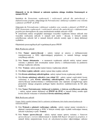 Załącznik nr 4c do Zaleceń w zakresie systemu obiegu środków finansowych w ramach PO IiŚ Instrukcja do Zestawienia wypłaconych i rozliczonych zaliczek dla umów/decyzji o dofinansowanie projektu, załączanego do Poświadczenia i deklaracji wydatków oraz wniosku o płatność od IPII/IP do IP/IZ. Załączanie do Poświadczenia i deklaracji wydatków oraz wniosku o płatność od IPII/IP do IP/IZ Zestawienia wypłaconych i rozliczonych zaliczek dla umów/decyzji o dofinansowanie projektu jest obowiązkowe do czasu uruchomienia modułu zaliczek w KSI. W zestawieniu naleŜy uwzględnić narastająco wszystkie wypłacone transze zaliczek oraz wszystkie rozliczenia zaliczek w ramach tych umów / decyzji, w których zostały certyfikowane zaliczki lub w ramach których zaliczki zostały ujęte w danej deklaracji wydatków. Objaśnienie poszczególnych pól wypełnianych przez IPII/IP: Blok Wypłacone zaliczki 1) Pole Numer umowy/decyzji – naleŜy wpisać nr umowy o dofinansowanie (zarejestrowanej w KSI) odpowiadającej projektowi, w ramach którego nastąpi certyfikacja zaliczki. 2) Pole Numer dokumentu – w momencie wypłacenia zaliczki naleŜy wpisać numer wniosku o płatność (lub ewentualnie numer umowy o dofinansowanie) na podstawie którego wypłacono zaliczkę 3) Pole Transza – naleŜy podać numer transzy wypłaconej zaliczki 4) Pole Data wypłaty zaliczki – naleŜy wpisać datę wypłaty zaliczki 5) Pole Kwota udzielonej zaliczki/ogółem – naleŜy wpisać kwotę wypłaconej zaliczki 6) Pole Kwota udzielonej zaliczki/w tym wkład UE – naleŜy wpisać część/całość kwoty wykazanej w polu Kwota udzielonej zaliczki/ogółem, która zgodnie z zapisami umowy/decyzji (aneksu/zmiany) o dofinansowanie oraz zapisami szczegółowego opisu priorytetów danego programu podlegać będzie docelowo zadeklarowaniu do KE jako środki UE 7) Pole Numer Poświadczenia i deklaracji wydatków, w którym certyfikowano zaliczkę – naleŜy wpisać numer deklaracji od IPII/IP do IP/IZ w ramach której została ujęta kwota zaliczki wskazana w kolumnach Kwota udzielonej zaliczki. Blok Rozliczone zaliczki Uwaga: NaleŜy wypełnić kolumnę 8 lub 9 w zaleŜności od dokumentu, który będzie stanowił podstawę do rozliczenia zaliczki. 8) Pole Wniosek o płatność rozliczający zaliczkę – naleŜy wpisać numer wniosku/ów o płatność (zarejestrowanego w KSI), w którym zostały ujęte wydatki rozliczające transzę zaliczki wykazanej w polu Transza. 9) Pole Numer sprawy/decyzji – naleŜy wpisać numer sprawy toŜsamy z Numerem sprawy/decyzji o zwrocie odnotowanym w module KSI Rejestr obciąŜeń na projekcie, w ramach której zarejestrowano kwoty do odzyskania/wycofane odpowiadające zaliczce wypłaconej na podstawie dokumentu, którego numer został wpisany w polu Numer dokumentu. 10) Pole Numer Poświadczenia i deklaracji wydatków, w którym rozliczono zaliczkę naleŜy wpisać numer/y deklaracji od IPII/IP do IP/ IZ, w ramach których zostały ujęte wnioski o płatność obejmujące wydatki rozliczające kwotę zaliczki1, wykazaną w kolumnach Kwota udzielonej zaliczki w bloku Wypłacone zaliczki (tj. wydatki wykazane we wnioskach o płatność wpisanych do tabeli Rozliczone zaliczki w polu Wniosek o płatność) lub w ramach której uwzględniono kwoty wynikające z modułu KSI Rejestr obciąŜeń na projekcie przypisane do nr sprawy/decyzji wskazanej w polu Nr sprawy/decyzji Tabeli Rozliczone zaliczki. 11) Pole Kwota rozliczonej zaliczki/ogółem – naleŜy wpisać kwotę stanowiącą rozliczenie zaliczki wykazanej w polu Kwota udzielonej zaliczki/ogółem w bloku Wypłacone zaliczki. W przypadku rozliczenia zaliczki poprzez przedstawienie wniosku o płatność naleŜy brać pod uwagę kwotę dofinansowania (pole dofinansowanie w formatce wniosku o płatność w module KSI Wnioski o płatność) z zatwierdzonego (zarejestrowanego w KSI) wniosku o płatność. W przypadku wpisania Nr sprawy/decyzji naleŜy wpisać kwotę odpowiadającą wypłaconej zaliczce z modułu Rejestr obciąŜeń na projekcie z części Kwoty odzyskane 12) Pole Kwota rozliczonej zaliczki/w tym wkład UE – W przypadku rozliczenia zaliczki poprzez przedstawienie wniosku o płatność naleŜy brać pod uwagę kwotę dofinansowania UE (pole w tym dofinansowanie UE w formatce wniosku o płatność w module KSI Wnioski o płatność) z zatwierdzonego (zarejestrowanego w KSI) wniosku o płatność. W przypadku wpisania Nr sprawy/decyzji naleŜy wpisać kwotę odpowiadającą wypłaconej zaliczce z modułu Rejestr obciąŜeń na projekcie z pola w tym wkład UE z części Kwoty odzyskane. 13) Pole Do rozliczenia (ogółem) - pole uzupełniane jako róŜnica wartości z pola Kwota udzielonej zaliczki/ogółem oraz pola Kwota rozliczonej zaliczki/ogółem. 1 Ujęciu w deklaracji podlegać będą wydatki kwalifikowane po pomniejszeniu o wcześniej certyfikowaną zaliczkę w celu uniknięcia podwójnej certyfikacji. Tzn. w przypadku, gdy wniosek o płatność obejmuje, oprócz wydatków rozliczających zaliczkę, równieŜ inne wydatki w deklaracji zostaną wykazane jedynie te wydatki.