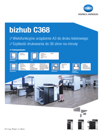 bizhub C368 Wielofunkcyjne urządzenie A3 do druku kolorowego Szybkość drukowania do 36 stron na minutę Funkcjonalności –Kolorowe –Czarno-białe Kopiowanie –Mobilna Druk –Kolorowe –Czarno-białe –Skanowanie do e-mail – Skanowanie na adres e-mail Skanowanie –Kolorowe –Czarno-białe –PCL/PS –Lokalne/w sieci –USB użytkownika –Skanowanie do SMB –Skanowanie do własnego folderu –Skanowanie do FTP –Skanowanie do skrzynki użytkownika –Skanowanie do USB –Skanowanie do WebDAV – Skanowanie do DPWS –Sieć TWAIN –Super G3 Fax –PC-Fax –i-Fax –IP-Fax Faksowanie 1 Skrzynka użytkownika – Przedruk – Dystrybucja – Udostępnianie między skrzynkami – Ze skrzynki do USB BROSZURA bizhub C368 Opisy bizhub C368 DF-629 Podajnik dokumentów DF-704 Podajnik dokumentów OC-511 Pokrywa oryginału PC-110 1 x podajnik uniwersalny PC-210 2 x podajnik uniwersalny PC-410 Kaseta dużej pojemności DK-510 Podstawa kopiarki LU-302 Kaseta dużej pojemności FS-533 Finiszer wewnętrzny PK-519 Moduł dziurkowania dla FS-533 FS-534 Finiszer zszywający FS-534SD Finiszer do broszur RU-513 Moduł przekazujący dla FS-534/SD PK-520 Moduł dziurkowania dla FS-534/SD JS-506 Separator prac KP-101 Klawiatura numeryczna WT-506 Półka boczna FK-514 Moduł faksu IC-416 Kontroler Fiery Urządzenie wielofunkcyjne A3 do druku czarno-białego i kolorowego z szybkością 36 str./min. Standardowy kontroler druku Emperon™ z obsługą PCL, PostScript i obsługą XPS. Pojemność papieru 500 + 500 arkuszy i 150 arkuszy z podajnika bocznego. Nośniki od A6 do SRA3, banner 1,2 m i 52 – 300 g/m2. pamięć 2 GB, twardy dysk 250 GB i standardowy Gigabit Ethernet. Automatyczny podajnik z funkcją obracania dokumentów, pojemność 100 arkuszy Automatyczny podajnik z funkcją dwustronnego skanowania, pojemność 100 arkuszy Pokrywa zamiast ADF A5–A3, 500 arkuszy, 52–256 g/m2 A5–A3, 2 x 500 arkuszy, 52–256 g/m2 A4, 2,500 arkuszy, 52–256 g/m2 Zapewnia przestrzeń do magazynowania materiałów eksploatacyjnych A4, 3000 arkuszy, 52–256 g/m2 Zszywanie 50 arkuszy, taca wyjściowa maks. 500 arkuszy Dziurkowanie 2/4 otworów, automatyczne obracanie Zszywanie 50 arkuszy, taca wyjściowa maks. 3300 arkuszy Finiszer zszywający 50 arkuszy, finiszer do broszur 20 arkuszy, taca wyjściowa 2 300 arkuszy Dla instalacji FS-534/SD Dziurkowanie 2/4 otworów, automatyczne obracanie Separacja dla wydruków z faksu itp. Zamiast ekranu dotykowego Umieszczenie urządzenia uwierzytelniającego Faks Super G3, funkcja faksu cyfrowego Profesjonalny kontroler kolorów druku VI-508 Moduł interfejsu dla IC-416 KH-102 Uchwyt klawiatury EK-608 Moduł USB I/F EK-609 Moduł USB I/F Czytnik kart identyfikacyjnych Moduł do montażu MK-735 AU-102 Moduł autoryzacji biometrycznej SC-508 Moduł zabezpieczeń Karta interfejsu kontrolera Fiery Do mocowania klawiatury USB Złącze klawiatury USB Złącze klawiatury USB, Bluetooth Różne technologie uwierzytelniania kart identyfikacyjnych Moduł do montażu czytnika kart ID Skaner naczyń krwionośnych w palcu F unkcja ochrony przed kopiowaniem (wymagane 2 moduł jeśli zainstalowano DF-704) Zapasowy HDD HD-524 Tworzenie kopii dysku twardego BT-C1e Podajnik bannerów Wielostronicowe podawanie bannerów LK-102v3 Rozszerzenie obsługi PDF/A (1b), kodowanie PDF, cyfrowy podpis plików PDF LK-105v4 Rozpoznawanie tekstu OCR Przeszukiwalny PDF i PPTX, PDF/A (1a) LK-106 Czcionki kodów kreskowych Obsługa druku natywnych kodów kreskowych LK-107 Czcionki Unicode Obsługa druku natywnych znaków Unicode LK-108 Czcionki OCR A i B Obsługa druku natywnych czcionek OCR A i B LK-110v2 Generowanie różnych formatów plików, w tym DOC, Konwerter dokumentów XLSX i PFF/A LK-111 Klient ThinPrint® Kompresja danych druku dla mniejszego obciążenia sieci LK-115v2 Aktywacja TPM Moduł platformy zaufanej (TPM) do ochrony danych kodowanych i odkodowywanych UK-211 Dodatkowa pamięć Rozszerzenie o dodatkową pamięć 2 GB UK-212 Bezprzewodowy LAN Bezprzewodowy LAN i tryb punktu dostępowego SX-BR-4600 Bezprzewodowy LAN Bezprzewodowa sieć LAN do złącza sieciowego Specyfikacja techniczna SPECYFIKACJA SYSTEMU Pamięć systemowa Twardy dysk Interfejsy Protokoły sieciowe Typy ramek Automatyczny podajnik dokumentów (opcjonalnie) Format papieru Gramatura papieru Pojemność wejściowa papieru Kaseta 1 Kaseta 2 Kaseta 3 (opcja) Kaseta 4 (opcja) Kaseta dużej pojemności (opcja) Kaseta dużej pojemności LU-302 (opcjonalnie) Podajnik boczny Automatyczny druk dwustronny Tryby wykańczania (opcjonalne) Pojemność odbiorcza (z finiszerem) Pojemność odbiorcza (bez finiszera) Zszywanie Pojemność odbiorcza zszywania Składanie listowe Pojemność składania listowego Broszura Pojemność odbiorcza Wolumen kopiowania/druku (miesięczny) Wydajność tonera 2 048 MB (standard) 250 GB (standard) 10-Base-T/100-Base-T/1000-Base-T Ethernet; USB 2.0 TCP/IP (IPv4 / IPv6); IPX/SPX; NetBEUI; AppleTalk (EtherTalk); SMB; LPD; IPP; SNMP; HTTP Ethernet 802.2; Ethernet 802.3; Ethernet II; Ethernet SNAP Do 100 oryginałów; A6–A3; 35–163 g/m2 Dostępny RADF lub Dalscan ADF A6–SRA3, własne formaty papieru; papier bannerowy maks. 1 200 x 297 mm 52–300 g/m2 Standard: 1150 arkuszy Maks.: 6650 arkuszy 500 arkuszy, A5–A3, 52–256 g/m2 500 arkuszy, A5–SRA3, 52–256 g/m2 1 x 500 arkuszy, A5–A3, 52–256 g/m2 2 x 500 arkuszy, A5–A3, 52–256 g/m2 2500 arkuszy, A4, 52–256 g/m2 3000 arkuszy, A4, 52–256 g/m2 150 arkuszy, A6–SRA3, własne formaty, banner, 60–300 g/m2 A5–SRA3; 52–256 g/m2 Przesunięcie; grupowanie; sortowanie; zszywanie; dziurkowanie; składanie na pół; broszurowanie Maks.: 3 300 arkuszy Maks.: 250 arkuszy Maks.: 50 arkuszy lub 48 arkuszy + 2 okładki (do 209 g/m2) Maks. 1000 arkuszy Do 3 arkuszy Maks.: 30 arkuszy (podajnik); bez ograniczeń Maks.: 20 arkuszy lub 19 arkuszy + 1 okładka (do 209 g/m2) Maks.: 100 arkuszy (podajnik); bez ograniczeń Rek.: 25 000 stron Ma