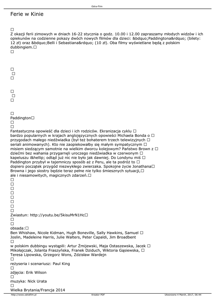 Odra-Film Ferie w Kinie Z okazji ferii zimowych w dniach 16-22 stycznia o godz. 10.00 i 12.00 zapraszamy młodych widzów i ich opiekunów na codzienne pokazy dwóch nowych filmów dla dzieci: „Paddingtona” (bilety: 12 zł) oraz „Belli i Sebastiana” (10 zł). Oba filmy wyświetlane będą z polskim dubbingiem. Paddington Fantastyczna opowieść dla dzieci i ich rodziców. Ekranizacja cyklu bardzo popularnych w krajach anglojęzycznych opowieści Michaela Bonda o przygodach małego niedźwiadka (był też bohaterem trzech telewizyjnych seriali animowanych). Kto nie zaopiekowałby się małym sympatycznym misiem siedzącym samotnie na wielkim dworcu kolejowym? Państwo Brown z dziećmi bez wahania przygarnęli uroczego niedźwiadka w czerwonym kapeluszu i… odtąd już nic nie było jak dawniej. Do Londynu miś Paddington przybył w tajemniczy sposób aż z Peru, ale ta podróż to dopiero początek przygód niezwykłego zwierzaka. Spokojne życie Jonathana Browna i jego siostry będzie teraz pełne nie tylko śmiesznych sytuacji, ale i niesamowitych, magicznych zdarzeń. Zwiastun: http://youtu.be/5kisuMrN1Hc obsada: Ben Whishaw, Nicole Kidman, Hugh Boneville, Sally Hawkins, Samuel Joslin, Madeleine Harris, Julie Walters, Peter Capaldi, Jim Broadbent w polskim dubbingu wystąpili: Artur Żmijewski, Maja Ostaszewska, Jacek Mikołajczak, Jolanta Fraszyńska, Franek Dziduch, Wiktoria Gąsiewska, Teresa Lipowska, Grzegorz Wons, Zdzisław Wardejn reżyseria i scenariusz: Paul King zdjęcia: Erik Wilson muzyka: Nick Urata Wielka Brytania/Francja 2014 http://www.odrafilm.pl Kreator PDF Utworzono 4 March, 2017, 06:44 Odra-Film czas: 95' Bella i Sebastian Wzruszająca opowieść o przyjaźni między człowiekiem a psem. Ekranizacja popularnej powieści Cécile Aubry dla najmłodszych, która weszła już do literackiego kanonu (na jej podstawie powstał również znany polskim widzom francuski serial z lat 60). 8-letni Sebastian mieszka podczas II wojny światowej z dziadkiem w małej wiosce w Alpach, na pograniczu szwajcarsko-francuskim. Spokój mieszkańców burzy wieść o grasującym w okolicy tajemniczym dzikim zwierzu. Sebastian spotyka w górach bezpańskiego owczarka. Udaje mu się zdobyć zaufanie i przyjaźń zwierzęcia. Wkrótce jednak okaże się, że w psie, któremu chłopiec dał na imię Bella, dorośli widzą niebezpieczne zwierzę, dziesiątkujące stada owiec. Czy chłopcu uda się ich przekonać, że to nie sprawka sympatycznej Belli i wraz z nią wytropić prawdziwych winowajców? Nieważne czy biegasz po świecie na dwóch nogach czy czterech łapach. Liczy się, że masz serce po właściwej stronie. Zwiastun: http://youtu.be/c6e4kTAz0aE obsada: Félix Bousset, Tchéky Kayro, Margaux Chatelier w polskim dubbingu wystąpili: Mateusz Ceran, Marta Dobecka, Przemysław Bluszcz reżyseria: Nicolas Vanier scenariusz: Juliette Sales, Fabien Suarez, Nicolas Vanier zdjęcia: Éric Travers muzyka: Armand Amar Francja, Niemcy 2014 Czas: 104' http://www.odrafilm.pl Kreator PDF Utworzono 4 March, 2017, 06:44