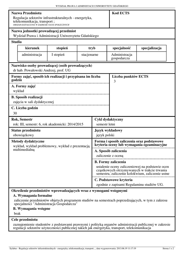 WYDZIAŁ PRAWA I ADMINISTACJI UNIWERSYTETU GDAŃSKIEGO Nazwa Przedmiotu Regulacja sektorów infrastrukturalnych -- energetyka, telekomunikacja, transport ; Regulacja sektorów infrastrukturalnych energetyka, telekomunikacja, transport ; Kod ECTS OBSZAR KSZTAŁCENIA W ZAKRESIE NAUK SPOŁECZNYCH Nazwa jednostki prowadzącej przedmiot Wydział Prawa i Administracji Uniwersytetu Gdańskiego Studia kierunek administracja administracja stopień II stopień stopień tryb stacjonarne stacjonarne Nazwisko osoby prowadzącej (osób prowadzących) dr hab. Powałowski Andrzej, prof. UG Formy godzin Formy zajęć, zajęć, sposób sposób ich ich realizacji realizacji ii przypisana przypisana im im liczba liczba godzin A. Formy zajęć wykład wykład specjalność Administracja gospodarcza Administracja gospodarcza specjalizacja Liczba punktów ECTS 3 B. Sposób realizacji zajęcia zajęcia w w sali sali dydaktycznej dydaktycznej C. Liczba godzin 30 30 Rok, Semestr rok: III, semestr: 6, rok akademicki: 2014/2015 Cykl dydaktyczny semestr letni Status przedmiotu obowiązkowy Język wykładowy język polski Metody dydaktyczne wykład, wykład problemowy, wykład z prezentacją multimedialną Forma i sposób zaliczenia oraz podstawowe kryteria oceny lub wymagania egzaminacyjne A. Sposób zaliczenia zaliczenie z oceną B. Formy zaliczenia ustalenie oceny zaliczeniowej na podstawie ocen cząstkowych otrzymywanych w trakcie trwania semestru, zaliczenie kolokwium, zaliczenie ustne C. Podstawowe kryteria zgodnie z zapisami Regulaminu studiów UG. Określenie przedmiotów wprowadzających wraz z wymogami wstępnymi A. Wymagania formalne zaliczenie przedmiotów objetych programem studiów na semestrach poprzedzających, w tym z zakresu specjalności "Administracja Gospodarcza" B. Wymagania wstępne brak Cele przedmiotu zaznajomienie studentów z podstawami prawnymi i polityką organów administracji publicznej w zakresie regulacji sektorów użyteczności publicznej takich jak energetyka, transport, telekomunikacja Sylabus - Regulacja sektorów infrastrukturalnych - energetyka, telekomunikacja, transport..., data wygenerowania: 2013.06.19 11:17:19 Strona 1 z 2 WYDZIAŁ PRAWA I ADMINISTACJI UNIWERSYTETU GDAŃSKIEGO Treści programowe I.prawo energetyczne 1.Podstawy i zasady regulacji niektórych sektorów gospodarki 2. Rynek energii i jego uczestnicy, zadania Prezesa URE 3. polityka energetyczna, planowanie energetyczne i bezpieczeństwo energetyczne 4. KOncesje i taryfy 5. Obowiązki przedsiebiorców energetycznych 6. Zasada TPA 7.Odnawialne źródła energii II. Prawo telekomunikacyjne 1.Źródła prawa telekomunikacyjnego 2. Regulacja telekomunikacji 3. Pojęcie usługi powszechnej 4.wspieranie rozwoju usług i sieci telekomunikacyjnych 5. Organy regulacyjne w sektorze telekomunikacyjnym III. Prawo transportowe 1.pojecie i rodzaje usług transportowych 2. umowa przewozu 3. regulacja transporu: dorgowego, kolejowego. morskiego i lotniczego w krajowych i międzynarodowych aktach prawnych Wykaz literatury A. Literatura wymagana do ostatecznego zaliczenia zajęć (zdania egzaminu): A.1. wykorzystywana podczas zajęć A. Powałowski, Prawo gospodarcze publiczne, CH Beck, Warszawa 2012 A.2. studiowana samodzielnie przez studenta podawana ewentualnie każdorazowo na wykładach B. Literatura uzupełniająca R.Stasikowski, Transport kolejowy. Analiza administracyjnoprawna, Difin, Warszawa 2013 W. Górski, E. Mendyk, Pawo transporu lądowego, Warszawa 2005 Efekty uczenia się Wiedza student zna regulacje dotyczące sektorów infrastrukturalnych, posiada znaczącą wiedzę na temat przesłanek i zasad tej regulacji. Zna podstawy ingerencji państwa w świadczenie usług w sektorach energetyki, telekomunikacji i transportu. Umiejętności student potrafi przedstawić podstawowe zasady i przesłanki regulacji usług w sektorach infrastrukturalnych. Student umie zinterpretować przepisy dotyczące regulacji. student rozumie i potrafi uzasadnić potrzebę regulacji sektorów infrastrukturalnych. Kompetencje społeczne (postawy) student potrafi określić priorytety w polityce regulacyjnej państwa w sektorach infrastrukturalnych. Rozumie potrzebę regulacji wskazanych sektorów, potrafi uwzględnić aspekty społeczne, ekonomiczne i prawne tej regulacji. Kontakt [email protected] Sylabus - Regulacja sektorów infrastrukturalnych - energetyka, telekomunikacja, transport..., data wygenerowania: 2013.06.19 11:17:19 Strona 2 z 2