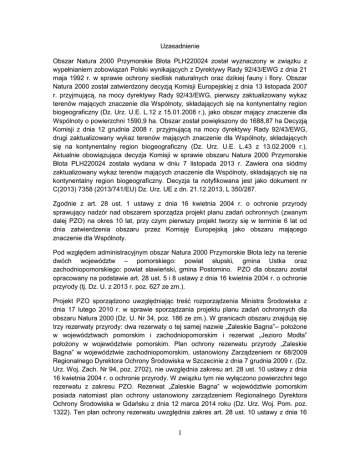 Uzasadnienie Obszar Natura 2000 Przymorskie Błota PLH220024 został wyznaczony w związku z wypełnianiem zobowiązań Polski wynikających z Dyrektywy Rady 92/43/EWG z dnia 21 maja 1992 r. w sprawie ochrony siedlisk naturalnych oraz dzikiej fauny i flory. Obszar Natura 2000 został zatwierdzony decyzją Komisji Europejskiej z dnia 13 listopada 2007 r. przyjmującą, na mocy dyrektywy Rady 92/43/EWG, pierwszy zaktualizowany wykaz terenów mających znaczenie dla Wspólnoty, składających się na kontynentalny region biogeograficzny (Dz. Urz. U.E. L.12 z 15.01.2008 r.), jako obszar mający znaczenie dla Wspólnoty o powierzchni 1590,9 ha. Obszar został powiększony do 1688,87 ha Decyzją Komisji z dnia 12 grudnia 2008 r. przyjmującą na mocy dyrektywy Rady 92/43/EWG, drugi zaktualizowany wykaz terenów mających znaczenie dla Wspólnoty, składających się na kontynentalny region biogeograficzny (Dz. Urz. U.E. L.43 z 13.02.2009 r.). Aktualnie obowiązująca decyzja Komisji w sprawie obszaru Natura 2000 Przymorskie Błota PLH220024 została wydana w dniu 7 listopada 2013 r. Zawiera ona siódmy zaktualizowany wykaz terenów mających znaczenie dla Wspólnoty, składających się na kontynentalny region biogeograficzny. Decyzja ta notyfikowana jest jako dokument nr C(2013) 7358 (2013/741/EU) Dz. Urz. UE z dn. 21.12.2013, L 350/287. Zgodnie z art. 28 ust. 1 ustawy z dnia 16 kwietnia 2004 r. o ochronie przyrody sprawujący nadzór nad obszarem sporządza projekt planu zadań ochronnych (zwanym dalej PZO) na okres 10 lat, przy czym pierwszy projekt tworzy się w terminie 6 lat od dnia zatwierdzenia obszaru przez Komisję Europejską jako obszaru mającego znaczenie dla Wspólnoty. Pod względem administracyjnym obszar Natura 2000 Przymorskie Błota leży na terenie dwóch województw – pomorskiego: powiat słupski, gmina Ustka oraz zachodniopomorskiego: powiat sławieński, gmina Postomino. PZO dla obszaru został opracowany na podstawie art. 28 ust. 5 i 8 ustawy z dnia 16 kwietnia 2004 r. o ochronie przyrody (tj. Dz. U. z 2013 r. poz. 627 ze zm.). Projekt PZO sporządzono uwzględniając treść rozporządzenia Ministra Środowiska z dnia 17 lutego 2010 r. w sprawie sporządzania projektu planu zadań ochronnych dla obszaru Natura 2000 (Dz. U. Nr 34, poz. 186 ze zm.). W granicach obszaru znajdują się trzy rezerwaty przyrody: dwa rezerwaty o tej samej nazwie „Zaleskie Bagna”– położone w województwach pomorskim i zachodniopomorskim i rezerwat „Jezioro Modła” położony w województwie pomorskim. Plan ochrony rezerwatu przyrody „Zaleskie Bagna” w województwie zachodniopomorskim, ustanowiony Zarządzeniem nr 68/2009 Regionalnego Dyrektora Ochrony Środowiska w Szczecinie z dnia 7 grudnia 2009 r. (Dz. Urz. Woj. Zach. Nr 94, poz. 2702), nie uwzględnia zakresu art. 28 ust. 10 ustawy z dnia 16 kwietnia 2004 r. o ochronie przyrody. W związku tym nie wyłączono powierzchni tego rezerwatu z zakresu PZO. Rezerwat „Zaleskie Bagna” w województwie pomorskim posiada natomiast plan ochrony ustanowiony zarządzeniem Regionalnego Dyrektora Ochrony Środowiska w Gdańsku z dnia 12 marca 2014 roku (Dz. Urz. Woj. Pom. poz. 1322). Ten plan ochrony rezerwatu uwzględnia zakres art. 28 ust. 10 ustawy z dnia 16 1 kwietnia 2004 r. o ochronie przyrody, w związku z czym wyłączono powierzchnię tego rezerwatu z zakresu PZO. Rezerwat „Jezioro Modła” posiada dokumentację planu ochrony, lecz nie posiada ustanowionego planu ochrony. Poza wymienionymi wyżej rezerwatami, obszar Natura 2000 Przymorskie Błota obejmuje fragment Obszaru Chronionego Krajobrazu „Pas Pobrzeża na zachód od Ustki”. Obszar Natura 2000 Przymorskie Błota zaprojektowano z uwagi na występowanie siedlisk przyrodniczych z Załącznika I Dyrektywy Rady 92/43 EWG z dnia 21 maja 1992 r. w sprawie ochrony siedlisk przyrodniczych oraz dzikiej fauny i flory: - 3150 Starorzecza i naturalne eutroficzne zbiorniki wodne ze zbiorowiskami z Nympheion, Potamion - 6410 Zmiennowilgotne łąki trzęślicowe (Molinion) - 6510 Niżowe i górskie świeże łąki użytkowane ekstensywnie (Arrhenatherion elatioris) - 7110 Torfowiska wysokie z roślinnością torfotwórczą (żywe) - 7120 Torfowiska wysokie stymulowanej regeneracji - 7140 Torfowiska przejściowe i trzęsawiska (przeważnie z roślinnością z Scheuchzerio-Caricetea) - 7150 Obniżenia na podłożu torfowym z roślinnością ze związku Rhynchosporion - 9190 Kwaśne dąbrowy (Quercion robori-petraeae) - 91D0 Bory i lasy bagienne (Vaccinio uliginosi Betuletum pubescentis, Vaccinio uliginosi Pinetum, Pino mugo-Sphagnetum, Sphagno girgensohnii-Piceetum) i brzozowo-sosnowe bagienne lasy borealne - 91F0 Łęgowe lasy wiązowo – dębowo – jesionowe (Ficario-Ulmetum) zdegradowane, lecz zdolne do naturalnej i W trakcie prac terenowych nie stwierdzono występowania na terenie objętym PZO siedlisk: 6410 Zmiennowilgotne łąki trzęślicowe (Molinion), 6510 Niżowe i górskie świeże łąki użytkowane ekstensywnie (Arrhenatherion elatioris), 7120 Torfowiska wysokie zdegradowane, lecz zdolne do naturalnej i stymulowanej regeneracji i 9190 Kwaśne dąbrowy (Quercion robori-petraeae). W przypadku siedlisk 6410 i 6510 istnieje prawdopodobieństwo, że występują one jednak na terenie obszaru, zatem w PZO wskazano na konieczność wykonania dodatkowych badań określających rozmieszczenie i stan siedlisk w obszarze. W opinii ekspertów sporządzających dokumentacje na potrzeby PZO nie ma natomiast powodu, żeby przypuszczać, że siedliska 7120 i 9190 kiedykolwiek występowały na terenie obszaru Przymorskie Błota. 2 W trakcie inwentaryzacji stwierdzono liczne stanowiska roślinności na glebach torfowych zmurszałych, jednak brakowało gatunków diagnostycznych dla siedliska 7120, a wyraźne ślady zaawansowanego procesu murszenia i nieustające zasilanie wodami mineralotroficznymi nie dają podstaw do stwierdzenia, że były to torfowiska wysokie i że możliwa jest 