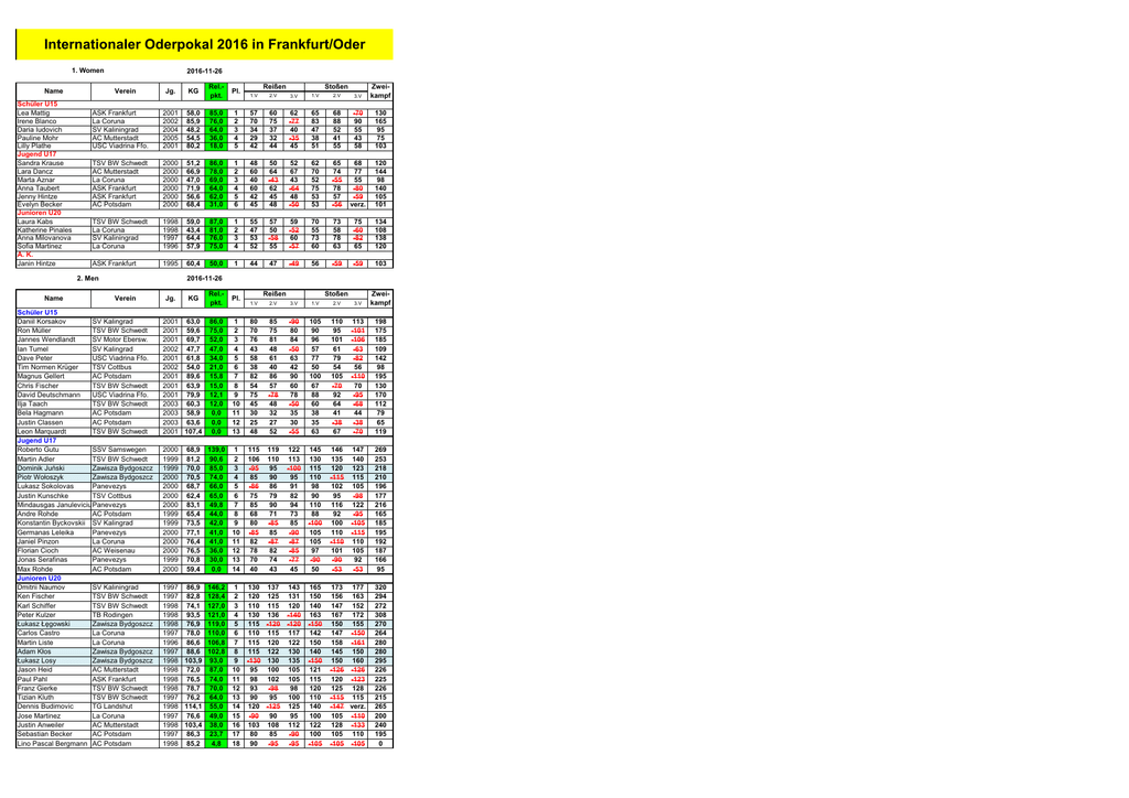 Internationaler Oderpokal 2016 in Frankfurt/Oder 1. Women Jg. KG Rel.pkt. Pl. ASK Frankfurt La Coruna SV Kaliningrad AC Mutterstadt USC Viadrina Ffo. 2001 2002 2004 2005 2001 58,0 85,9 48,2 54,5 80,2 85,0 76,0 64,0 36,0 18,0 TSV BW Schwedt AC Mutterstadt La Coruna ASK Frankfurt ASK Frankfurt AC Potsdam 2000 2000 2000 2000 2000 2000 51,2 66,9 47,0 71,9 56,6 68,4 TSV BW Schwedt La Coruna SV Kaliningrad La Coruna 1998 1998 1997 1996 ASK Frankfurt 1995 Name Schüler U15 Lea Mattig Irene Blanco Daria Iudovich Pauline Mohr Lilly Plathe Jugend U17 Sandra Krause Lara Dancz Marta Aznar Anna Taubert Jenny Hintze Evelyn Becker Junioren U20 Laura Kabs Katherine Pinales Anna Milovanova Sofia Martinez A. K. Janin Hintze 2016-11-26 Verein 2. Men Name Reißen Stoßen 1.V 2.V 3.V 1.V 2.V 3.V Zweikampf 1 2 3 4 5 57 70 34 29 42 60 75 37 32 44 62 -77 40 -35 45 65 83 47 38 51 68 88 52 41 55 -70 90 55 43 58 130 165 95 75 103 86,0 78,0 69,0 64,0 62,0 31,0 1 2 3 4 5 6 48 60 40 60 42 45 50 64 -43 62 45 48 52 67 43 -64 48 -50 62 70 52 75 53 53 65 74 -55 78 57 -56 68 77 55 -80 -59 verz. 120 144 98 140 105 101 59,0 43,4 64,4 57,9 87,0 81,0 76,0 75,0 1 2 3 4 55 47 53 52 57 50 -58 55 59 -52 60 -57 70 55 73 60 73 58 78 63 75 -60 -82 65 134 108 138 120 60,4 50,0 1 44 47 -49 56 -59 -59 103 2016-11-26 Verein Schüler U15 Daniil Korsakov SV Kalingrad Ron Müller TSV BW Schwedt Jannes Wendlandt SV Motor Ebersw. Ian Tumel SV Kalingrad Dave Peter USC Viadrina Ffo. Tim Normen Krüger TSV Cottbus Magnus Gellert AC Potsdam Chris Fischer TSV BW Schwedt David Deutschmann USC Viadrina Ffo. Ilja Taach TSV BW Schwedt Bela Hagmann AC Potsdam Justin Classen AC Potsdam Leon Marquardt TSV BW Schwedt Jugend U17 Roberto Gutu SSV Samswegen Martin Adler TSV BW Schwedt Dominik Juński Zawisza Bydgoszcz Piotr Wołoszyk Zawisza Bydgoszcz Lukasz Sokolovas Panevezys Justin Kunschke TSV Cottbus Mindausgas JanuleviciusPanevezys Andre Rohde AC Potsdam Konstantin Byckovskii SV Kalingrad Germanas Leleika Panevezys Janiel Pinzon La Coruna Florian Cioch AC Weisenau Jonas Serafinas Panevezys Max Rohde AC Potsdam Junioren U20 Dmitrii Naumov SV Kaliningrad Ken Fischer TSV BW Schwedt Karl Schiffer TSV BW Schwedt Peter Kulzer TB Rodingen Łukasz Łęgowski Zawisza Bydgoszcz Carlos Castro La Coruna Martin Liste La Coruna Adam Kłos Zawisza Bydgoszcz Łukasz Losy Zawisza Bydgoszcz Jason Heid AC Mutterstadt Paul Pahl ASK Frankfurt Franz Gierke TSV BW Schwedt Tizian Kluth TSV BW Schwedt Dennis Budimovic TG Landshut Jose Martinez La Coruna Justin Anweiler AC Mutterstadt Sebastian Becker AC Potsdam Lino Pascal Bergmann AC Potsdam Rel.pkt. Pl. 2001 63,0 2001 59,6 2001 69,7 2002 47,7 2001 61,8 2002 54,0 2001 89,6 2001 63,9 2001 79,9 2003 60,3 2003 58,9 2003 63,6 2001 107,4 86,0 75,0 52,0 47,0 34,0 21,0 15,8 15,0 12,1 12,0 0,0 0,0 0,0 2000 1999 1999 2000 2000 2000 2000 1999 1999 2000 2000 2000 1999 2000 68,9 81,2 70,0 70,5 68,7 62,4 83,1 65,4 73,5 77,1 76,4 76,5 70,8 59,4 1997 86,9 1997 82,8 1998 74,1 1998 93,5 1998 76,9 1997 78,0 1996 86,6 1997 88,6 1998 103,9 1998 72,0 1998 76,5 1998 78,7 1997 76,2 1998 114,1 1997 76,6 1998 103,4 1997 86,3 1998 85,2 Jg. KG 1.V Reißen 2.V 3.V 1.V Stoßen 2.V 3.V Zweikampf 1 2 3 4 5 6 7 8 9 10 11 12 13 80 70 76 43 58 38 82 54 75 45 30 25 48 85 75 81 48 61 40 86 57 -78 48 32 27 52 -90 80 84 -50 63 42 90 60 78 -50 35 30 -55 105 90 96 57 77 50 100 67 88 60 38 35 63 110 95 101 61 79 54 105 -70 92 64 41 -38 67 113 -101 -106 -63 -82 56 -110 70 -95 -68 44 -38 -70 198 175 185 109 142 98 195 130 170 112 79 65 119 139,0 90,6 85,0 74,0 66,0 65,0 49,8 44,0 42,0 41,0 41,0 36,0 30,0 0,0 1 2 3 4 5 6 7 8 9 10 11 12 13 14 115 106 -95 85 -86 75 85 68 80 -85 82 78 70 40 119 110 95 90 86 79 90 71 -85 85 -87 82 74 43 122 113 -100 95 91 82 94 73 85 -90 -87 -85 -77 45 145 130 115 110 98 90 110 88 -100 105 105 97 -90 50 146 135 120 -115 102 95 116 92 100 110 -110 101 -90 -53 147 140 123 115 105 -98 122 -95 -105 -115 110 105 92 -53 269 253 218 210 196 177 216 165 185 195 192 187 166 95 146,2 128,4 127,0 121,0 119,0 110,0 106,8 102,8 93,0 87,0 74,0 70,0 64,0 55,0 49,0 38,0 23,7 4,8 1 2 3 4 5 6 7 8 9 10 11 12 13 14 15 16 17 18 130 120 110 130 115 110 115 115 -130 95 98 93 90 120 -90 103 80 90 137 125 115 136 -120 115 120 122 130 100 102 -98 95 -125 90 108 85 -95 143 131 120 -140 -120 117 122 130 135 105 105 98 100 125 95 112 -90 -95 165 150 140 163 -150 142 150 140 -150 121 115 120 110 140 100 122 100 -105 173 177 156 163 147 152 167 172 150 155 147 -150 158 -161 145 150 150 160 -126 -126 120 -123 125 128 -115 115 -147 verz. 105 -110 128 -133 105 110 -105 -105 320 294 272 308 270 264 280 280 295 226 225 226 215 265 200 240 195 0