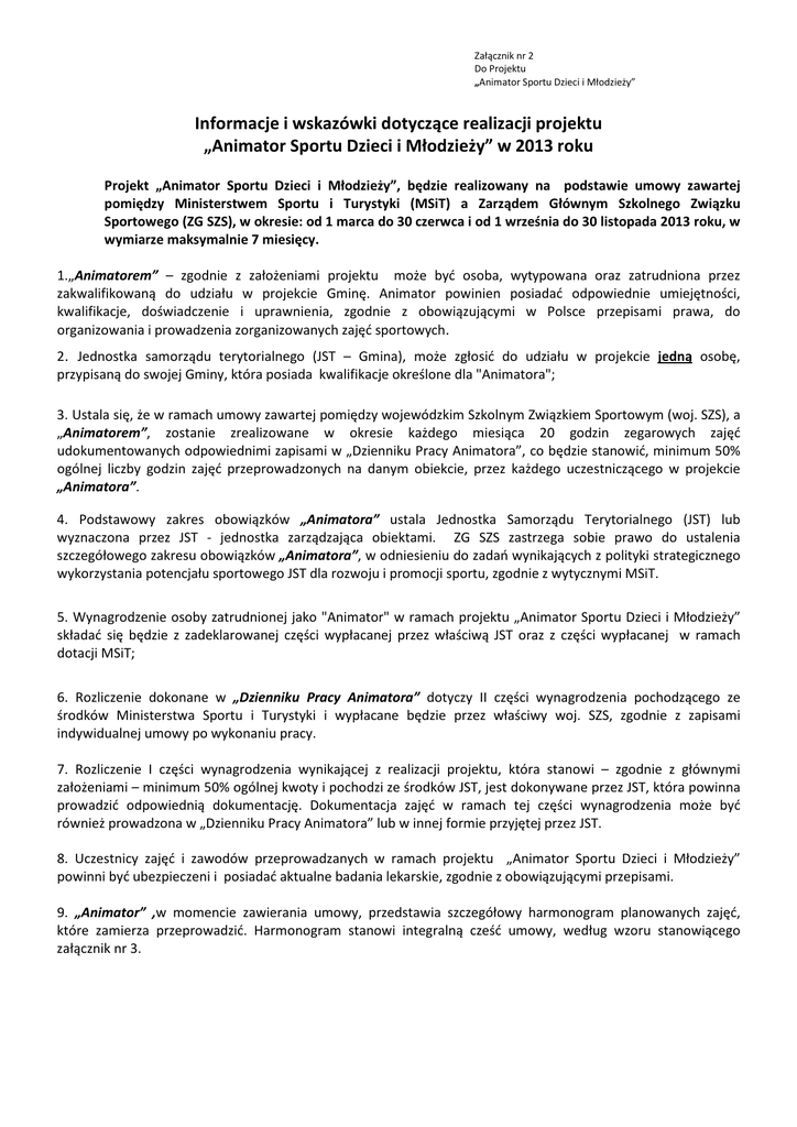 Załącznik nr 2 Do Projektu „Animator Sportu Dzieci i Młodzieży” Informacje i wskazówki dotyczące realizacji projektu „Animator Sportu Dzieci i Młodzieży” w 2013 roku Projekt „Animator Sportu Dzieci i Młodzieży”, będzie realizowany na podstawie umowy zawartej pomiędzy Ministerstwem Sportu i Turystyki (MSiT) a Zarządem Głównym Szkolnego Związku Sportowego (ZG SZS), w okresie: od 1 marca do 30 czerwca i od 1 września do 30 listopada 2013 roku, w wymiarze maksymalnie 7 miesięcy. 1.„Animatorem” – zgodnie z założeniami projektu może być osoba, wytypowana oraz zatrudniona przez zakwalifikowaną do udziału w projekcie Gminę. Animator powinien posiadać odpowiednie umiejętności, kwalifikacje, doświadczenie i uprawnienia, zgodnie z obowiązującymi w Polsce przepisami prawa, do organizowania i prowadzenia zorganizowanych zajęć sportowych. 2. Jednostka samorządu terytorialnego (JST – Gmina), może zgłosić do udziału w projekcie jedną osobę, przypisaną do swojej Gminy, która posiada kwalifikacje określone dla "Animatora"; 3. Ustala się, że w ramach umowy zawartej pomiędzy wojewódzkim Szkolnym Związkiem Sportowym (woj. SZS), a „Animatorem”, zostanie zrealizowane w okresie każdego miesiąca 20 godzin zegarowych zajęć udokumentowanych odpowiednimi zapisami w „Dzienniku Pracy Animatora”, co będzie stanowić, minimum 50% ogólnej liczby godzin zajęć przeprowadzonych na danym obiekcie, przez każdego uczestniczącego w projekcie „Animatora”. 4. Podstawowy zakres obowiązków „Animatora” ustala Jednostka Samorządu Terytorialnego (JST) lub wyznaczona przez JST - jednostka zarządzająca obiektami. ZG SZS zastrzega sobie prawo do ustalenia szczegółowego zakresu obowiązków „Animatora”, w odniesieniu do zadań wynikających z polityki strategicznego wykorzystania potencjału sportowego JST dla rozwoju i promocji sportu, zgodnie z wytycznymi MSiT. 5. Wynagrodzenie osoby zatrudnionej jako "Animator" w ramach projektu „Animator Sportu Dzieci i Młodzieży” składać się będzie z zadeklarowanej części wypłacanej przez właściwą JST oraz z części wypłacanej w ramach dotacji MSiT; 6. Rozliczenie dokonane w „Dzienniku Pracy Animatora” dotyczy II części wynagrodzenia pochodzącego ze środków Ministerstwa Sportu i Turystyki i wypłacane będzie przez właściwy woj. SZS, zgodnie z zapisami indywidualnej umowy po wykonaniu pracy. 7. Rozliczenie I części wynagrodzenia wynikającej z realizacji projektu, która stanowi – zgodnie z głównymi założeniami – minimum 50% ogólnej kwoty i pochodzi ze środków JST, jest dokonywane przez JST, która powinna prowadzić odpowiednią dokumentację. Dokumentacja zajęć w ramach tej części wynagrodzenia może być również prowadzona w „Dzienniku Pracy Animatora” lub w innej formie przyjętej przez JST. 8. Uczestnicy zajęć i zawodów przeprowadzanych w ramach projektu „Animator Sportu Dzieci i Młodzieży” powinni być ubezpieczeni i posiadać aktualne badania lekarskie, zgodnie z obowiązującymi przepisami. 9. „Animator” ,w momencie zawierania umowy, przedstawia szczegółowy harmonogram planowanych zajęć, które zamierza przeprowadzić. Harmonogram stanowi integralną cześć umowy, według wzoru stanowiącego załącznik nr 3.