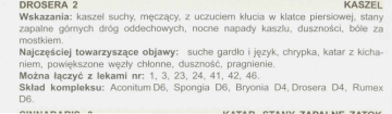 DROSERA 2 KASZEL Wskazania: kaszel suchy, męczący, z uczuciem kłucia w klatce piersiowej, stany zapalne górnych dróg oddechowych, nocne napady kaszlu, duszności, bóle za mostkiem. Najczęściej towarzyszące objawy: suche gardło i język, chrypka, katar z kichaniem, powiększone węzły chłonne, duszność, pragnienie. Można łączyć z lekami nr: 1, 3, 23, 24, 41, 42, 46. Skład kompleksu: Aconitum 06, Spongia 06, Bryonia 04, Orosera 04, Rumex 06.