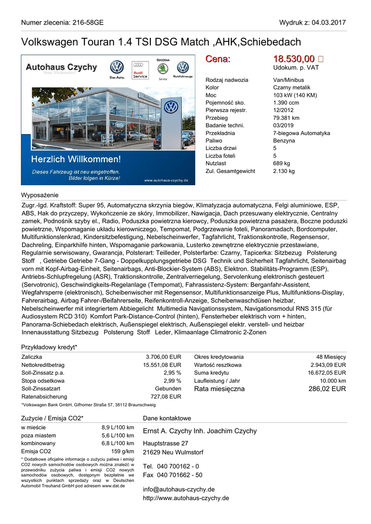 Numer zlecenia: 216-58GE Wydruk z: 04.03.2017 Volkswagen Touran 1.4 TSI DSG Match ,AHK,Schiebedach Cena: 18.530,00 Rodzaj nadwozia Kolor Moc Pojemność sko. Pierwsza rejestr. Przebieg Badanie techni. Przekładnia Paliwo Liczba drzwi Liczba foteli Nutzlast Zul. Gesamtgewicht Van/Minibus Czarny metalik 103 kW (140 KM) 1.390 ccm 12/2012 79.381 km 03/2019 7-biegowa Automatyka Benzyna 5 5 689 kg 2.130 kg Udokum. p. VAT Wyposażenie Zugr.-lgd. Kraftstoff: Super 95, Automatyczna skrzynia biegów, Klimatyzacja automatyczna, Felgi aluminiowe, ESP, ABS, Hak do przyczepy, Wykończenie ze skóry, Immobilizer, Nawigacja, Dach przesuwany elektrycznie, Centralny zamek, Podnośnik szyby el., Radio, Poduszka powietrzna kierowcy, Poduszka powietrzna pasażera, Boczne poduszki powietrzne, Wspomaganie układu kierowniczego, Tempomat, Podgrzewanie foteli, Panoramadach, Bordcomputer, Multifunktionslenkrad, Kindersitzbefestigung, Nebelscheinwerfer, Tagfahrlicht, Traktionskontrolle, Regensensor, Dachreling, Einparkhilfe hinten, Wspomaganie parkowania, Lusterko zewnętrzne elektrycznie przestawiane, Regularnie serwisowany, Gwarancja, Polsterart: Teilleder, Polsterfarbe: Czarny, Tapicerka: Sitzbezug Polsterung Stoff , Getriebe Getriebe 7-Gang - Doppelkupplungsgetriebe DSG Technik und Sicherheit Tagfahrlicht, Seitenairbag vorn mit Kopf-Airbag-Einheit, Seitenairbags, Anti-Blockier-System (ABS), Elektron. Stabilitäts-Programm (ESP), Antriebs-Schlupfregelung (ASR), Traktionskontrolle, Zentralverriegelung, Servolenkung elektronisch gesteuert (Servotronic), Geschwindigkeits-Regelanlage (Tempomat), Fahrassistenz-System: Berganfahr-Assistent, Wegfahrsperre (elektronisch), Scheibenwischer mit Regensensor, Multifunktionsanzeige Plus, Multifunktions-Display, Fahrerairbag, Airbag Fahrer-/Beifahrerseite, Reifenkontroll-Anzeige, Scheibenwaschdüsen heizbar, Nebelscheinwerfer mit integriertem Abbiegelicht Multimedia Navigationssystem, Navigationsmodul RNS 315 (für Audiosystem RCD 310) Komfort Park-Distance-Control (hinten), Fensterheber elektrisch vorn + hinten, Panorama-Schiebedach elektrisch, Außenspiegel elektrisch, Außenspiegel elektr. verstell- und heizbar Innenausstattung Sitzbezug Polsterung Stoff Leder, Klimaanlage Climatronic 2-Zonen Przykładowy kredyt* Zaliczka Nettokreditbetrag Soll-Zinssatz p.a. Stopa odsetkowa Soll-Zinssatzart Ratenabsicherung 3.706,00 EUR 15.551,08 EUR 2,95 % 2,99 % Gebunden 727,08 EUR Okres kredytowania Wartość resztkowa Suma kredytu Laufleistung / Jahr 48 Miesięcy 2.943,09 EUR 16.672,05 EUR 10.000 km Rata miesięczna 286,02 EUR *Volkswagen Bank GmbH, Gifhorner Straße 57, 38112 Braunschweig Zużycie / Emisja CO2* w mieście poza miastem kombinowany Emisja CO2 Dane kontaktowe 8,9 L/100 km 5,6 L/100 km 6,8 L/100 km 159 g/km * Dodatkowe oficjalne informacje o zużyciu paliwa i emisji CO2 nowych samochodów osobowych można znaleźć w przewodniku zużycia paliwa i emisji CO2 nowych samochodów osobowych, dostępnym bezpłatnie we wszystkich punktach sprzedaży oraz w Deutschen Automobil Treuhand GmbH pod adresem www.dat.de Ernst A. Czychy Inh. Joachim Czychy Hauptstrasse 27 21629 Neu Wulmstorf Tel. 040 700162 - 0 Fax 040 701662 - 50 [email protected] http://www.autohaus-czychy.de Numer zlecenia: 216-58GE Wydruk z: 04.03.2017 Volkswagen Touran 1.4 TSI DSG Match ,AHK,Schiebedach