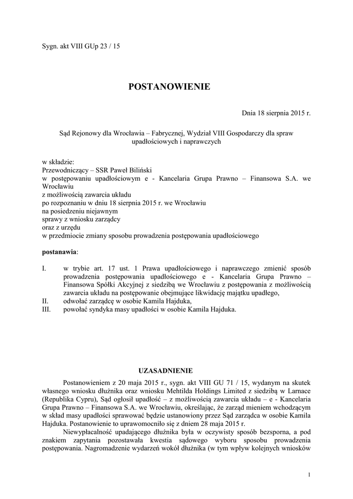 Sygn. akt VIII GUp 23 / 15 POSTANOWIENIE Dnia 18 sierpnia 2015 r. Sąd Rejonowy dla Wrocławia – Fabrycznej, Wydział VIII Gospodarczy dla spraw upadłościowych i naprawczych w składzie: Przewodniczący – SSR Paweł Biliński w postępowaniu upadłościowym e - Kancelaria Grupa Prawno – Finansowa S.A. we Wrocławiu z możliwością zawarcia układu po rozpoznaniu w dniu 18 sierpnia 2015 r. we Wrocławiu na posiedzeniu niejawnym sprawy z wniosku zarządcy oraz z urzędu w przedmiocie zmiany sposobu prowadzenia postępowania upadłościowego postanawia: I. II. III. w trybie art. 17 ust. 1 Prawa upadłościowego i naprawczego zmienić sposób prowadzenia postępowania upadłościowego e - Kancelaria Grupa Prawno – Finansowa Spółki Akcyjnej z siedzibą we Wrocławiu z postępowania z możliwością zawarcia układu na postępowanie obejmujące likwidację majątku upadłego, odwołać zarządcę w osobie Kamila Hajduka, powołać syndyka masy upadłości w osobie Kamila Hajduka. UZASADNIENIE Postanowieniem z 20 maja 2015 r., sygn. akt VIII GU 71 / 15, wydanym na skutek własnego wniosku dłużnika oraz wniosku Mehtilda Holdings Limited z siedzibą w Larnace (Republika Cypru), Sąd ogłosił upadłość – z możliwością zawarcia układu – e - Kancelaria Grupa Prawno – Finansowa S.A. we Wrocławiu, określając, że zarząd mieniem wchodzącym w skład masy upadłości sprawować będzie ustanowiony przez Sąd zarządca w osobie Kamila Hajduka. Postanowienie to uprawomocniło się z dniem 28 maja 2015 r. Niewypłacalność upadającego dłużnika była w oczywisty sposób bezsporna, a pod znakiem zapytania pozostawała kwestia sądowego wyboru sposobu prowadzenia postępowania. Nagromadzenie wydarzeń wokół dłużnika (w tym wpływ kolejnych wniosków 1 o ogłoszenie upadłości, obejmującej likwidację majątku) oraz wysokie, stałe koszty funkcjonowania jego przedsiębiorstwa wymagały szybkiego ustabilizowania sytuacji postanowieniem prawomocnie ogłaszającym upadłość, i to upadłość układową, by zapobiec nieodwracalnym w obrocie skutkom upadłości likwidacyjnej. Wobec tak określonej potrzeby priorytetowej, procedowanie zorganizowano w kierunku możliwie najszybszego orzeczenia upadłości (jako takiej), w miejsce drobiazgowego roztrząsania racji stron spierających się o optymalny sposób prowadzenia postępowania po jej ogłoszeniu. Właściwe rozstrzygnięcie sporu o opcję postępowania przeniesiono w nieodległą przyszłość, by ustanowiony dla dłużnika zarządca mógł pod nadzorem sędziego – komisarza zbadać kluczowy dla perspektyw przedsiębiorstwa dłużnika czynnik, a mianowicie oszacować wiarygodną wartość pakietu eksplorowanych przez niego należności. Niemożliwe było to do wykonania z pozycji tymczasowego nadzorcy sądowego, ze względu na właściwe jej ograniczenia funkcjonalno – kompetencyjne. W uzupełniającym wniosek o ogłoszenie upadłości piśmie datowanym na 20 kwietnia 2015 r. (k. 213 – 214 w aktach VIII GU 71 / 15) dłużnik przedstawił zmodyfikowane propozycje układowe. Dłużnik zaproponował nowy sposób restrukturyzacji zobowiązań, zakładając „podział wierzycieli na 1 grupę”. Wskazano, że na moment złożenia propozycji wszystkie zobowiązania pracownicze dłużnika były zaspokojone. 1) Grupa pierwsza – wierzyciele będący obligatariuszami spółki z tytułu nabycia obligacji wyemitowanych przez dłużnika, Grupa pierwsza 1) Brak redukcji zobowiązań poprzez umorzenie wierzytelności, 2) Konwersja 50 % (z zastrzeżeniem punktu 3.1 wierzytelności, (kapitał wraz z odsetkami), ustalonych na dzień zawarcia układu, na akcje spółki e - Kancelaria Grupa Prawno – Finansowa S.A. – Zarząd zaproponował konwersję na akcje spółki e - Kancelaria Grupa Prawno – Finansowa S.A., o wartości nominalnej jednej akcji 0,10 zł (dziesięć groszy), po cenie emisyjnej 0,10 zł (dziesięć groszy) za jedną akcję. Akcje powstałe w wyniku konwersji miałyby być przedmiotem ubiegania się o dopuszczenie i wprowadzenie do obrotu na rynku regulowanym Giełdy Papierów Wartościowych w Warszawie. Warunki konwersji obligacji na akcje: Zarząd spółki zaproponował Wierzycielom – obligatariuszom konwersję 50 % (z zastrzeżeniem punktu 3.1) posiadanych przez nich wierzytelności na akcje, poprzez podwyższenie kapitału zakładowego spółki w drodze emisji akcji na okaziciela serii G na następujących warunkach: 1. Podwyższenie kapitału zakładowego Spółki nastąpi o kwotę będącą sumą kwot: a) do 50 % łącznej wartości posiadanych przez Wierzycieli wierzytelności (kapitał wraz z odsetkami, zaokrąglone w dół do równowartości 0,10 zł), ustalonej na dzień zawarcia układu, b) kwoty powstałej z przeliczenia opisanego w punkcie 3.1. poprzez emisję akcji zwykłych na okaziciela serii G, w liczbie nie większej niż iloczyn kwoty, o której mowa w powyższym punkcie 1 oraz wartości nominalnej jednej akcji 0,10 zł (dziesięć groszy). 2. Akcje serii G wyemitowane zostaną w drodze subskrypcji prywatnej z wyłączeniem prawa poboru w całości w stosunku do dotychczasowych akcjonariuszy, skierowanej do wierzycieli spółki. 3. Akcje serii G zostaną objęte w zamian za obligacje wierzycieli. 2 4. Akcje serii G uczestniczyć będą w dywidendzie począwszy od wypłat z zysku, jaki zostanie przeznaczony do podziału za rok obrotowy 2015, tj. od dnia 1 stycznia 2015 r. 5. Cena emisyjna akcji serii G równa będzie wartości nominalnej jednej akcji i wynosić będzie 0,10 zł (dziesięć groszy) za 1 akcję. 6. Upoważnia się Zarząd spółki do dokonania czynności rejestracyjnych, podpisania i złożenia dokumentów w Krajowym Rejestrze Sądowym po zatwierdzeniu układu i wydaniu postanowienia o zatwierdzeniu układu. 7. Akcje nowej emisji serii G nie będą miały formy dokumentu i będą podlegały dematerializacji zgodnie z ustawą z dnia 29. lipca o obrocie instrumentami finanso