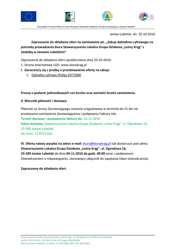 "Europejski Fundusz Rolny na rzecz Rozwoju Obszarów Wiejskich: Europa inwestująca w obszary wiejskie" Janów Lubelski, dn. 25-10-2016 Zaproszenie do składania ofert na zamówienie pn. „Zakup dyktafonu cyfrowego na potrzeby prowadzenia biura Stowarzyszenia Lokalna Grupa Działania „Leśny Krąg” z siedzibą w Janowie Lubelskim” Zaproszenie do składania ofert upubliczniono dnia 25-10-2016: 1. Strona internetowa LGD: www.lesnykrag.pl I. Zwracam/y się z prośbą o przedstawienie oferty na zakup: 1. Dyktafon cyfrowy Philips DVT2000 Proszę o podanie jednostkowych cen brutto oraz wartości brutto zamówienia. II. Warunki płatności i dostawy: Płatność ze strony Zamawiającego zostanie uregulowana w terminie do 21 dni od przekazania zamówienia Zamawiającemu i podpisaniu Faktury Vat. Termin dostawy i wystawienia faktury do: 14-11-2016 Adres dostawy: Stowarzyszenie Lokalna Grupa Działania „Leśny Krąg”, ul. Ogrodowa 16, 23-300 Janów Lubelski, tel. kont. 15 8722 652 III. Oferty należy wysyłać na adres e-mail: [email protected] lub dostarczyć pod adres: Stowarzyszenie Lokalna Grupa Działania „Leśny Krąg”, ul. Ogrodowa 16, 23-300 Janów Lubelski do dnia 04-11-2016 do godz. 00:00 wraz z podpisanym Oświadczeniem o niepowiązaniu, stanowiący załącznik do zapytania (skan oświadczenia). Zapraszamy do składania ofert. Stowarzyszenie Lokalna Grupa Działania „Leśny Krąg”, ul. Ogrodowa 16, 23-300 Janów Lubelski, tel/fax: 15 8722 652, NIP: 862-159-67-43, Regon: 060139286 PBS w Janowie Lubelskim, nr konta: 12 9410 0000 2001 1017 9054 0001