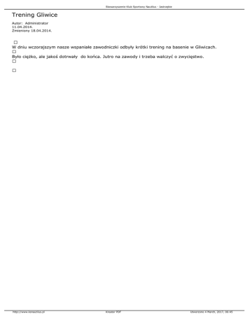 Stowarzyszenie Klub Sportowy Nautilus - Jastrzębie Trening Gliwice Autor: Administrator 11.04.2014. Zmieniony 18.04.2014. W dniu wczorajszym nasze wspaniałe zawodniczki odbyły krótki trening na basenie w Gliwicach. Było ciężko, ale jakoś dotrwały do końca. Jutro na zawody i trzeba walczyć o zwycięstwo. http://www.ksnautilus.pl Kreator PDF Utworzono 4 March, 2017, 06:45