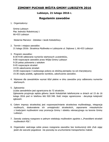 ZIMOWY PUCHAR WÓJTA GMINY LUBISZYN 2016 Lubiszyn, 21 lutego 2016 r. Regulamin zawodów 1. Organizatorzy: Gmina Lubiszyn Plac Jedności Robotniczej 1 66-433 Lubiszyn Stolarnia Marwice - Zdzisław i Jacek Kołodzińscy. 2. Termin i miejsce zawodów: 21 lutego 2016r. Strzelnica Myśliwska w Lubiszynie ul. Dębowa 1, 66-433 Lubiszyn 3. Program zawodów: 8:30-9:00 odbieranie numerów startowych uczestników, 9:00 rozpoczęcie zawodów przez Wójta Gminy Lubiszyn 9:20 pokaz polowania z sokołem 9:45 rozpoczęcie strzelań 14:55 zakończenie strzelań 15:00 rozpoczęcie 3 osobowego pokera ze zbiórką pieniędzy na cel charytatywny 15:30 ciepły posiłek, ogłoszenie wyników, zakończenie zawodów. 4. Wpisowe dla zawodników wynosi 60zł płatne w dniu zawodów przy odbieraniu numerów startowych. 5. Zgłoszenia: Liczba zawodników jest ograniczona do 72 strzelców. Zgłoszenia przyjmuje sędzia główny Jacek Kołodziński telefonicznie w dniach od 15 do 16 lutego 2016 pod nr telefonu 661 920 348. Ilość miejsc ograniczona - decyduje kolejność zgłoszeń. 6. Celem imprezy strzeleckiej jest rozpowszechnianie strzelectwa myśliwskiego, integracja myśliwych, doskonalenie ich umiejętności strzeleckich, zapoznanie mieszkańców z tradycjami myśliwskimi oraz promocja Gminy i obiektu rekreacyjnego na terenie Gminy Lubiszyn. 7. Zawody zostaną rozegrane w pełnym wieloboju myśliwskim zgodnie z „Prawidłami strzelań myśliwskich PZŁ”. 8. Organizator zastrzega sobie prawo rozegrania zawodów bez konkurencji dzik i/lub zając jeżeli złe warunki pogodowe nie pozwolą na uruchomienie transporterów makiet. 9. Zawody mają charakter otwarty. 10. Klasyfikacja: - Drużynowa trzyosobowe zespoły kół łowieckich i nadleśnictw (ilość osób w drużynie bez ograniczeń - do klasyfikacji drużynowej brane będą 3 najlepsze wyniki) - Indywidualna w klasie open - Zasady klasyfikacji jak w „Prawidłach strzelań PZŁ” 11. Nagrody i wyróżnienia - Puchary Wójta i dyplomy dla 3 najlepszych zespołów - Puchary Wójta i dyplomy dla 3 najlepszych zawodników indywidualnie open - Nagrody rzeczowe i dyplomy dla 6 najlepszych zawodników w klasyfikacji indywidualnej open - Nagroda rzeczowa losowana wśród zawodników i sędziów. Fundatorem w/w nagród jest Wójt Gminy Lubiszyn. 12. W trakcie zawodów zostanie rozegrany „ Charytatywny Poker na osi (trap)” wg zasad: startują 3 osobowe, dowolnie dobrane drużyny, zawodnicy zajmują stanowiska 1, 3 i 6 po komendzie pierwszego zawodnika sędzia podaje serię 15 rzutków jeden po drugim w odstępach najkrótszych jak to możliwe. Zawodnicy mogą strzelać w dowolnej kolejności i mogą oddać nieograniczoną ilość strzałów, dopuszcza się też strzelanie ze składu – do klasyfikacji liczona jest suma trafień drużyny. Jednorazowo broń można załadować maksymalnie 2 nabojami. W przypadku równych wyników decyduje baraż w utrudnionej wersji serii 15 rzutków. Wpisowe do pokera wynosi 20zł/osobę z czego połowa zebranej puli przekazana będzie na charytatywny cel, a druga połowa zwycięskiej drużynie. Podsumowanie pokera nastąpi podczas zakończenia zawodów. Sponsorzy rzutków oraz obsługi pokera: PPHU Zbigniew Izdebski oraz Stolarnia Marwice Zdzisław i Jacek Kołodzińscy. 13. Postanowienia końcowe - Każdy zawodnik ma obowiązek zapoznania się z regulaminem strzelnicy oraz regulaminem zawodów - Każdy zawodnik ma zapewniony ciepły posiłek po zawodach i ciepłe napoje w trakcie strzelań. - Dla chętnych istnieje możliwość zakwaterowania w Ośrodku przy Strzelnicy. Rezerwacje noclegów na strzelnicy: www.izdebski.pl lub tel 504-245-225