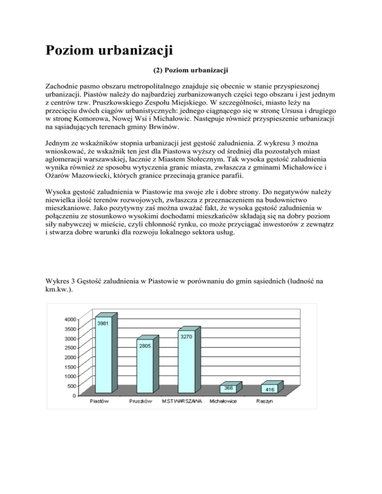 Poziom urbanizacji (2) Poziom urbanizacji Zachodnie pasmo obszaru metropolitalnego znajduje się obecnie w stanie przyspieszonej urbanizacji. Piastów należy do najbardziej zurbanizowanych części tego obszaru i jest jednym z centrów tzw. Pruszkowskiego Zespołu Miejskiego. W szczególności, miasto leży na przecięciu dwóch ciągów urbanistycznych: jednego ciągnącego się w stronę Ursusa i drugiego w stronę Komorowa, Nowej Wsi i Michałowic. Następuje również przyspieszenie urbanizacji na sąsiadujących terenach gminy Brwinów. Jednym ze wskaźników stopnia urbanizacji jest gęstość zaludnienia. Z wykresu 3 można wnioskować, że wskaźnik ten jest dla Piastowa wyższy od średniej dla pozostałych miast aglomeracji warszawskiej, łacznie z Miastem Stołecznym. Tak wysoka gęstość zaludnienia wynika również ze sposobu wytyczenia granic miasta, zwłaszcza z gminami Michałowice i Ożarów Mazowiecki, których granice przecinają granice parafii. Wysoka gęstość zaludnienia w Piastowie ma swoje złe i dobre strony. Do negatywów należy niewielka ilość terenów rozwojowych, zwłaszcza z przeznaczeniem na budownictwo mieszkaniowe. Jako pozytywny zaś można uważać fakt, że wysoka gęstość zaludnienia w połączeniu ze stosunkowo wysokimi dochodami mieszkańców składają się na dobry poziom siły nabywczej w mieście, czyli chłonność rynku, co może przyciągać inwestorów z zewnątrz i stwarza dobre warunki dla rozwoju lokalnego sektora usług. Wykres 3 Gęstość zaludnienia w Piastowie w porównaniu do gmin sąsiednich (ludność na km.kw.).