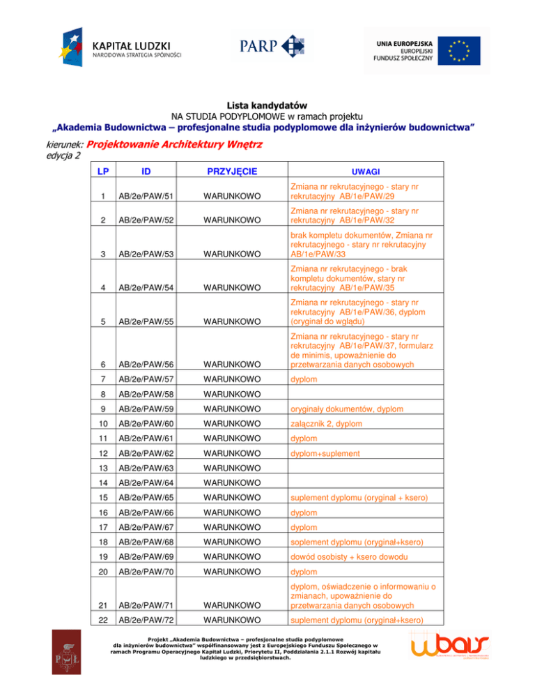 Lista kandydatów NA STUDIA PODYPLOMOWE w ramach projektu „Akademia Budownictwa – profesjonalne studia podyplomowe dla inŜynierów budownictwa” kierunek: Projektowanie Architektury Wnętrz edycja 2 LP ID PRZYJĘCIE 1 AB/2e/PAW/51 WARUNKOWO Zmiana nr rekrutacyjnego - stary nr rekrutacyjny AB/1e/PAW/29 2 AB/2e/PAW/52 WARUNKOWO Zmiana nr rekrutacyjnego - stary nr rekrutacyjny AB/1e/PAW/32 WARUNKOWO brak kompletu dokumentów, Zmiana nr rekrutacyjnego - stary nr rekrutacyjny AB/1e/PAW/33 WARUNKOWO Zmiana nr rekrutacyjnego - brak kompletu dokumentów, stary nr rekrutacyjny AB/1e/PAW/35 WARUNKOWO Zmiana nr rekrutacyjnego - stary nr rekrutacyjny AB/1e/PAW/36, dyplom (oryginał do wglądu) 3 4 5 AB/2e/PAW/53 AB/2e/PAW/54 AB/2e/PAW/55 UWAGI 6 AB/2e/PAW/56 WARUNKOWO Zmiana nr rekrutacyjnego - stary nr rekrutacyjny AB/1e/PAW/37, formularz de minimis, upowaŜnienie do przetwarzania danych osobowych 7 AB/2e/PAW/57 WARUNKOWO dyplom 8 AB/2e/PAW/58 WARUNKOWO 9 AB/2e/PAW/59 WARUNKOWO oryginały dokumentów, dyplom 10 AB/2e/PAW/60 WARUNKOWO zalącznik 2, dyplom 11 AB/2e/PAW/61 WARUNKOWO dyplom 12 AB/2e/PAW/62 WARUNKOWO dyplom+suplement 13 AB/2e/PAW/63 WARUNKOWO 14 AB/2e/PAW/64 WARUNKOWO 15 AB/2e/PAW/65 WARUNKOWO suplement dyplomu (oryginal + ksero) 16 AB/2e/PAW/66 WARUNKOWO dyplom 17 AB/2e/PAW/67 WARUNKOWO dyplom 18 AB/2e/PAW/68 WARUNKOWO soplement dyplomu (oryginał+ksero) 19 AB/2e/PAW/69 WARUNKOWO dowód osobisty + ksero dowodu 20 AB/2e/PAW/70 WARUNKOWO dyplom 21 AB/2e/PAW/71 WARUNKOWO dyplom, oświadczenie o informowaniu o zmianach, upowaŜnienie do przetwarzania danych osobowych 22 AB/2e/PAW/72 WARUNKOWO suplement dyplomu (oryginał+ksero) Projekt „Akademia Budownictwa – profesjonalne studia podyplomowe dla inŜynierów budownictwa” współfinansowany jest z Europejskiego Funduszu Społecznego w ramach Programu Operacyjnego Kapitał Ludzki, Priorytetu II, Poddziałania 2.1.1 Rozwój kapitału ludzkiego w przedsiębiorstwach. 23 AB/2e/PAW/73 WARUNKOWO dyplom, suplement dyplomu (oryginał+ksero) dowód osobisty (oryginał+ksero) 24 AB/2e/PAW/74 WARUNKOWO dyplom 25 AB/2e/PAW/75 WARUNKOWO dyplom, suplement dyplomu (oryginał+ksero) 26 AB/2e/PAW/76 WARUNKOWO dyplom 27 AB/2e/PAW/77 WARUNKOWO 28 AB/2e/PAW/78 WARUNKOWO dyplom LISTA REZERWOWA 29 AB/2e/PAW/79 WARUNKOWO suplement dyplomu (oryginał+ksero) 30 AB/2e/PAW/80 WARUNKOWO 31 AB/2e/PAW/81 WARUNKOWO dowód osobisty + ksero dowodu 32 AB/2e/PAW/82 WARUNKOWO dowód osobisty + ksero dowodu 33 AB/2e/PAW/83 WARUNKOWO 34 AB/2e/PAW/84 WARUNKOWO dyplom, suplement dyplomu (oryginał+ksero) 35 AB/2e/PAW/85 WARUNKOWO brak dokumentów 36 AB/2e/PAW/86 WARUNKOWO 37 AB/2e/PAW/87 WARUNKOWO 38 AB/2e/PAW/88 WARUNKOWO 39 AB/2e/PAW/89 WARUNKOWO dowód osobisty + ksero dowodu 40 AB/2e/PAW/90 WARUNKOWO suplement dyplomu (oryginał+ksero) WSZYSTKIE OSOBY ZATRUDNIONE W PRZEDSIĘBIORSTWIE ZOBOWIĄZANE SA DOSTARCZYĆ DO DNIA 20 LUTEGO 2011 ROKU AKTUALNE, ORYGINALNE ZAŚWIADCZENIE O ZATRUDNIENIU (do pobrania ze strony http://www.bais.p.lodz.pl/podypl w zakładce REKRUTACJA) WSZYSTKIE OSOBY FIZYCZNE PROWADZĄCE DZIAŁALNOŚĆ DOSPODARCZĄ ZOBOWIĄZANE SĄ DOSTARCZYĆ DO DNIA 20 LUTEGO 2011 ROKU ORYGINALNY, AKTUALNY WPIS DO EWIDENCJI DZIAŁALNOŚCI GOSPODARCZEJ. Zaświadczenie nie moŜe być starsze niŜ 3 miesiące w dniu podpisania umowy. Pozostałe, brakujące dokumenty wymienione w uwagach naleŜy uzupełnić do dnia 20.02.2011r. Oryginały dyplomu naleŜy zabrać ze sobą na pierwsze zajęcia – podpisanie umowy szkoleniowej. Planowany termin rozpoczęcia studiów – marzec 2011r. Projekt „Akademia Budownictwa – profesjonalne studia podyplomowe dla inŜynierów budownictwa” współfinansowany jest z Europejskiego Funduszu Społecznego w ramach Programu Operacyjnego Kapitał Ludzki, Priorytetu II, Poddziałania 2.1.1 Rozwój kapitału ludzkiego w przedsiębiorstwach.