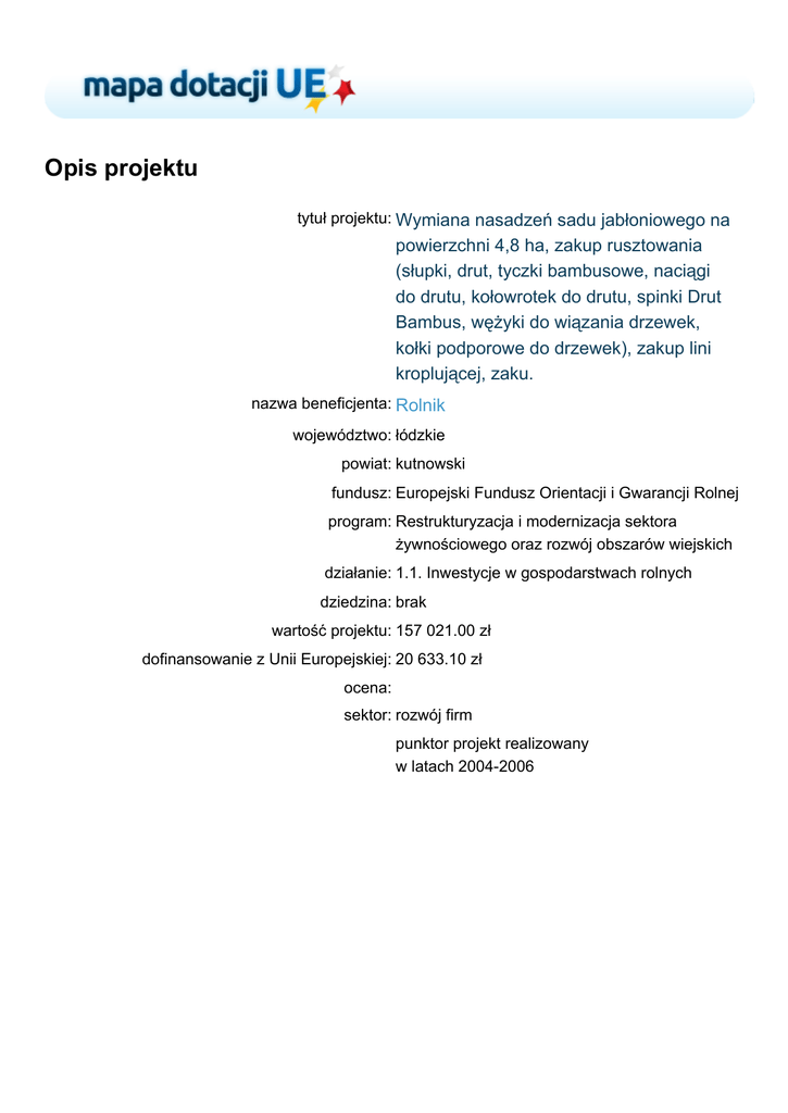 Opis projektu tytuł projektu: Wymiana nasadzeń sadu jabłoniowego na powierzchni 4,8 ha, zakup rusztowania (słupki, drut, tyczki bambusowe, naciągi do drutu, kołowrotek do drutu, spinki Drut Bambus, wężyki do wiązania drzewek, kołki podporowe do drzewek), zakup lini kroplującej, zaku. nazwa beneficjenta: Rolnik województwo: łódzkie powiat: kutnowski fundusz: Europejski Fundusz Orientacji i Gwarancji Rolnej program: Restrukturyzacja i modernizacja sektora żywnościowego oraz rozwój obszarów wiejskich działanie: 1.1. Inwestycje w gospodarstwach rolnych dziedzina: brak wartość projektu: 157 021.00 zł dofinansowanie z Unii Europejskiej: 20 633.10 zł ocena: sektor: rozwój firm punktor projekt realizowany w latach 2004-2006