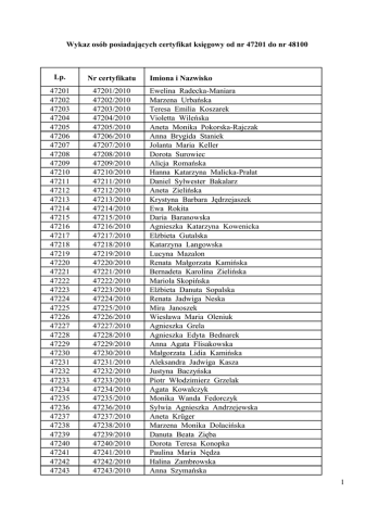 Wykaz osób posiadających certyfikat księgowy od nr 47201 do nr 48100 Lp. Nr certyfikatu 47201 47202 47203 47204 47205 47206 47207 47208 47209 47210 47211 47212 47213 47214 47215 47216 47217 47218 47219 47220 47221 47222 47223 47224 47225 47226 47227 47228 47229 47230 47231 47232 47233 47234 47235 47236 47237 47238 47239 47240 47241 47242 47243 47201/2010 47202/2010 47203/2010 47204/2010 47205/2010 47206/2010 47207/2010 47208/2010 47209/2010 47210/2010 47211/2010 47212/2010 47213/2010 47214/2010 47215/2010 47216/2010 47217/2010 47218/2010 47219/2010 47220/2010 47221/2010 47222/2010 47223/2010 47224/2010 47225/2010 47226/2010 47227/2010 47228/2010 47229/2010 47230/2010 47231/2010 47232/2010 47233/2010 47234/2010 47235/2010 47236/2010 47237/2010 47238/2010 47239/2010 47240/2010 47241/2010 47242/2010 47243/2010 Imiona i Nazwisko Ewelina Radecka-Maniara Marzena Urbańska Teresa Emilia Koszarek Violetta Wileńska Aneta Monika Pokorska-Rajczak Anna Brygida Staniek Jolanta Maria Keller Dorota Surowiec Alicja Romańska Hanna Katarzyna Malicka-Prałat Daniel Sylwester Bakalarz Aneta Zielińska Krystyna Barbara Jędrzejaszek Ewa Rokita Daria Baranowska Agnieszka Katarzyna Kowenicka Elżbieta Gutalska Katarzyna Langowska Lucyna Mazalon Renata Małgorzata Kamińska Bernadeta Karolina Zielińska Mariola Skopińska Elżbieta Danuta Sopalska Renata Jadwiga Neska Mira Janoszek Wiesława Maria Oleniuk Agnieszka Grela Agnieszka Edyta Bednarek Anna Agata Flisakowska Małgorzata Lidia Kamińska Aleksandra Jadwiga Kasza Justyna Baczyńska Piotr Włodzimierz Grzelak Agata Kowalczyk Monika Wanda Fedorczyk Sylwia Agnieszka Andrzejewska Aneta Krüger Marzena Monika Dolacińska Danuta Beata Zięba Dorota Teresa Konopka Paulina Maria Nędza Halina Zambrowska Anna Szymańska 1 47244 47245 47246 47247 47248 47249 47250 47251 47252 47253 47254 47255 47256 47257 47258 47259 47260 47261 47262 47263 47264 47265 47266 47267 47268 47269 47270 47271 47272 47273 47274 47275 47276 47277 47278 47279 47280 47281 47282 47283 47284 47285 47286 47287 47288 47289 47290 47291 47244/2010 47245/2010 47246/2010 47247/2010 47248/2010 47249/2010 47250/2010 47251/2010 47252/2010 47253/2010 47254/2010 47255/2010 47256/2010 47257/2010 47258/2010 47259/2010 47260/2010 47261/2010 47262/2010 47263/2010 47264/2010 47265/2010 47266/2010 47267/2010 47268/2010 47269/2010 47270/2010 47271/2010 47272/2010 47273/2010 47274/2010 47275/2010 47276/2010 47277/2010 47278/2010 47279/2010 47280/2010 47281/2010 47282/2010 47283/2010 47284/2010 47285/2010 47286/2010 47287/2010 47288/2010 47289/2010 47290/2010 47291/2010 Matylda Maria Glanowska Urszula Małgorzata Czapla Katarzyna Górska Kamila Małgorzata Witek Beata Niedziółka Ewa Grześkowiak Ewa Anna Hałatienko Katarzyna Kuskowska Anna Zuzanna Horbacz Bartłomiej Karol Klimas Agnieszka Teresa Gębka Jolanta Małgorzata Witkowska Magdalena Rutkowska Barbara Władysława Buchwak Aleksandra Wlaźlak Małgorzata Danuta Mospan Paweł Krzysztof Jopp Barbara Marcjanna Magdziorz Ryszard Paweł Kozioł Marta Anna Jałoszyńska Łukasz Łuczak Krzysztof Łukasz Łasiński Monika Misztal Małgorzata Klimek Piotr Tomasiak Katarzyna Anna Puć Alicja Elżbieta Heidenblut Magdalena Szostak Anna Maria Czyż Teresa Danuta Sikorska Justyna Grzelec Marzena Dorota Kucal Ewa Dopierała Radosław Mariusz Łajc Kamila Maria Młynarczyk-Mela Eliza Żaczek Marzena Mróz Agnieszka Anna Caban Iwona Bożena Pyszno Marcin Wierzbicki Agnieszka Anna Rychlak Anna Patrycja Zienkiewicz Maria Weronika Zadarnowska-Satar Robert Biderman Agnieszka Teresa Gać Monika Kopeć Remigiusz Jan Schmidt Małgorzata Krystyna Kozłowska 2 47292 47293 47294 47295 47296 47297 47298 47299 47300 47301 47302 47303 47304 47305 47306 47307 47308 47309 47310 47311 47312 47313 47314 47315 47316 47317 47318 47319 47320 47321 47322 47323 47324 47325 47326 47327 47328 47329 47330 47331 47332 47333 47334 47335 47336 47337 47338 47339 47292/2010 47293/2010 47294/2010 47295/2010 47296/2010 47297/2010 47298/2010 47299/2010 47300/2010 47301/2010 47302/2010 47303/2010 47304/2010 47305/2010 47306/2010 47307/2010 47308/2010 47309/2010 47310/2010 47311/2010 47312/2010 47313/2010 47314/2010 47315/2010 47316/2010 47317/2010 47318/2010 47319/2010 47320/2010 47321/2010 47322/2010 47323/2010 47324/2010 47325/2010 47326/2010 47327/2010 47328/2010 47329/2010 47330/2010 47331/2010 47332/2010 47333/2010 47334/2010 47335/2010 47336/2010 47337/2010 47338/2010 47339/2010 Beata Bilonowicz Krzysztof Antoni Kosek Wioleta Małgorzata Kij Katarzyna Grzybowska Piotr Marek Kozak Ilona Teresa Dorada Agata Radaszewska Ewa Barbara Kozioł Marzena Renata Janulewicz-Wiaderny Monika Śpiewla Katarzyna Kuriata Elżbieta Piwowarska Marta Elżbieta Ciszewska Grzegorz Łukasz Tłustowski Robert Jan Kołakowski Agnieszka Małgorzata Rożeńska Edyta Bożena Szyszło Katarzyna Kiraga Diana Beata Grzyb Katarzyna Mańka Katarzyna Orlińska Elżbieta Miazga Urszula Bożena Jakubas Monika Justyna Fujarska Magdalena Maria Woskowska Justyna Rafalska Katarzyna Izabela Wiechowicz Agnieszka Elżbieta Kopańska Beata Krystyna Kopacz Beata Maria Zawadzka Iwona Sierocka Izabela Katarzyna Szczepańska Dorota Maria Śliwa Malwina Gontarek Elżbieta Pokucińska Marzena Elżbieta Drawer-Mosakowska Witold Marcin Zadka Marta Rzepka Aleksandra Lewicka Agnieszka Janiak Sylwia Katarzyna Różycka Ewa Maria Błaszczyńska Karolina Maria Nowakowska Anna Bogumiła Bartos Aneta Renata Tyszkiewicz Aleksandra Lemańska Wanda Anna Plichta Wioletta Sobczyk 3 47340 47341 47342 47343 47344 47345 47346 47347 47348 47349 47350 47351 47352 47353 47354 47355 47356 47357 47358 47359 47360 47361 47362 47363 47364 47365 47366 47367 47368 47369 47370 47371 47372 47373 47374 47375 47376 47377 47378 47379 47380 47381 47382 47383 47384 47385 47386 47387 47340/2010 47341/2010 47342/2010 47343/2010 47344/2010 47345/2010 47346/2010 47347/2010 47348/2010 47349/2010 47350/2010 47351/2010 47352/2010 47353/2010 47354/2010 47355/2010 47356/2010 47