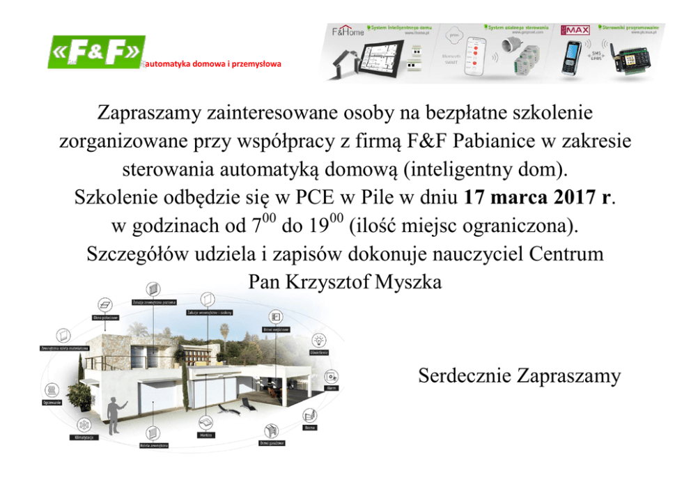 automatyka domowa i przemysłowa Zapraszamy zainteresowane osoby na bezpłatne szkolenie zorganizowane przy współpracy z firmą F&F Pabianice w zakresie sterowania automatyką domową (inteligentny dom). Szkolenie odbędzie się w PCE w Pile w dniu 17 marca 2017 r. w godzinach od 700 do 1900 (ilość miejsc ograniczona). Szczegółów udziela i zapisów dokonuje nauczyciel Centrum Pan Krzysztof Myszka Serdecznie Zapraszamy