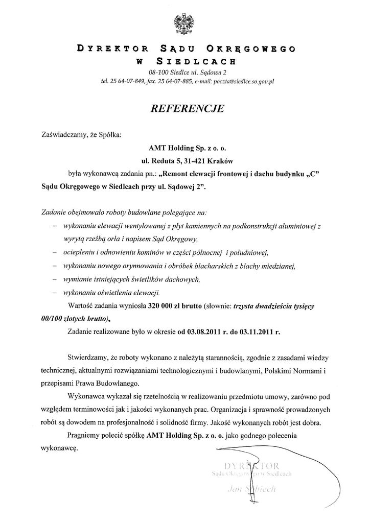 DTREKToR SADU OrnqcorrEeo w SrnDr.cAcE 08-100Siedlceul. S4doua2 -849,fax.25 64-07 -885,e-mail:[email protected] tel.2564-07 REFERENCJE Zaiw iadczamy,2e Sp6lka: AMT HoldingSp.z o. o. ul. Reduta5, 31-421Krak6w bylawykonawc4zadaniapn.: ,,Remontelewacjifrontowej i dachu budynku ,,C" S4du Okrggowegow Siedlcachprzy ul. S4dowej2". Zadanieobejmowalo polegajqcena: robotybudowlane - wykonaniuelewacjiwentylowanej z plyt kamiennych napodktnstrukcjialuminiowejz wyytq rzeibq orla i napisemSqd Okrggowy, - ociepleniui odnowieniukomin6ww czgicip1lnocnej i poludniowej, - wykonaniunov,,ego orynnowaniai obr\bekblacharskich z blachymiedzianej, - wwianie istniejqcychSwietlikowdachowych, - wykonaniuoiwietleniaelewacji. WartoSd zadaniawyniosla320 000zl brutto (slownie:tnysta dwadzieiciatysigcy 00/l 00 alotychbrutto). Zadaniercalizowane bvlo w okresieod 03.08.2011r. do 03.11.2011r. Stwierdzamy,Zeroboty wykonanoz nale?yl4starannodci4,zgodniez zasadamiwiedzy technicznej, aktualnymirozwi4zaniami technologicznymi i budowlanymi,PolskimiNormamii przepisamiPrawaBudowlanego. Wykonawcawykazalsigrzetelnodci4 w realizowaniuprzedmiotuumowy,zar6wnopod jak ijakoSciwykonanychprac.Organizacja wzglgdemterminowoSci prowadzonych i sprawno66 rob6ts4dowodemnaprofesjonalnoSi i solidnoSifirmy. JakoSd wykonanychrob6tjestdobra. Pragniemypoleci6sp6lk9AMT Holding Sp.z o. o. jako godnegopolecenia wykonawcg.