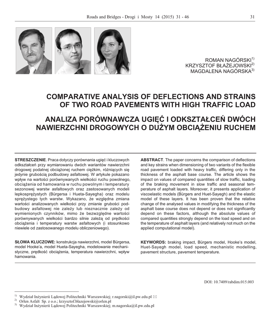 Roads and Bridges - Drogi i Mosty 14 (2015) 31 - 46 31 ROMAN NAGÓRSKI1) KRZYSZTOF B£A¯EJOWSKI2) MAGDALENA NAGÓRSKA3) COMPARATIVE ANALYSIS OF DEFLECTIONS AND STRAINS OF TWO ROAD PAVEMENTS WITH HIGH TRAFFIC LOAD ANALIZA PORÓWNAWCZA UGIÊÆ I ODKSZTA£CEÑ DWÓCH NAWIERZCHNI DROGOWYCH O DU¯YM OBCI¥¯ENIU RUCHEM STRESZCZENIE. Praca dotyczy porównania ugiêæ i kluczowych odkszta³ceñ przy wymiarowaniu dwóch wariantów nawierzchni drogowej podatnej obci¹¿onej ruchem ciê¿kim, ró¿ni¹cych siê jedynie gruboœci¹ podbudowy asfaltowej. W artykule pokazano wp³yw na wartoœci porównywanych wielkoœci ruchu powolnego, obci¹¿enia od hamowania w ruchu powolnym i temperatury sezonowej warstw asfaltowych oraz zastosowanych modeli lepkosprê¿ystych (Bürgersa i Hueta-Sayegha) oraz modelu sprê¿ystego tych warstw. Wykazano, ¿e wzglêdna zmiana wartoœci analizowanych wielkoœci przy zmianie gruboœci podbudowy asfaltowej nie zale¿y lub nieznacznie zale¿y od wymienionych czynników, mimo ¿e bezwzglêdne wartoœci porównywanych wielkoœci bardzo silnie zale¿¹ od prêdkoœci obci¹¿enia i temperatury warstw asfaltowych (i stosunkowo niewiele od zastosowanego modelu obliczeniowego). ABSTRACT. The paper concerns the comparison of deflections and key strains when dimensioning of two variants of the flexible road pavement loaded with heavy traffic, differing only in the thickness of the asphalt base course. The article shows the impact on values of compared quantities of slow traffic, loading of the braking movement in slow traffic and seasonal temperature of asphalt layers. Moreover, it presents application of viscoelastic models (Bürgers and Huet-Sayegh) and the elastic model of these layers. It has been proven that the relative change of the analysed values in modifying the thickness of the asphalt base course does not depend or does not significantly depend on these factors, although the absolute values of compared quantities strongly depend on the load speed and on the temperature of asphalt layers (and relatively not much on the applied computational model). S£OWA KLUCZOWE: konstrukcja nawierzchni, model Bürgersa, model Hooke’a, model Hueta-Sayegha, modelowanie mechanistyczne, prêdkoœæ obci¹¿enia, temperatura nawierzchni, wp³yw hamowania. KEYWORDS: braking impact, Bürgers model, Hooke’s model, Huet-Sayegh model, load speed, mechanistic modelling, pavement structure, pavement temperature. DOI: 10.7409/rabdim.015.003 1) 2) 3) Wydzia³ In¿ynierii L¹dowej Politechniki Warszawskiej; [email protected] * Orlen Asfalt Sp. z o.o.; [email protected] Wydzia³ In¿ynierii L¹dowej Politechniki Warszawskiej; [email protected] 32 Roman Nagórski, Krzysztof B³a¿ejowski, Magdalena Nagórska 1. WPROWADZENIE 1. INTRODUCTION Tematem pracy jest analiza porównawcza ugiêæ oraz odkszta³ceñ kluczowych przy wymiarowaniu nawierzchni drogowych podatnych na przyk³adzie dwóch konstrukcji poddanych du¿emu obci¹¿eniu ruchem. Do analizy wybrano dwa warianty konstrukcji nawierzchni ró¿ni¹ce siê jedynie gruboœci¹ podbudowy asfaltowej, oznaczone symbolicznie KS6 i KN5 (Rys. 1 i 2), by wartoœci innych parametrów geometryczno-materia³owych warstw nawierzchni nie wp³ywa³y na obraz tej analizy. The subject matter of the work is a comparative analysis of key strains and deflections when dimensioning of flexible road pavements as exemplified by two structures subjected to heavy traffic load. The analysis was based on two variants of the pavement structure differing only in the thickness of the asphalt base course, marked by the symbols KS6 and KN5 (Fig. 1 and 2), so that the values of other geometric and material parameters of the pavement layers do not affect the image of this analysis. Stone Mastic Asphalt / Mastyks grysowy SMA 11 Stone Mastic Asphalt / Mastyks grysowy SMA 11 Asphalt concrete / Beton asfaltowy AC 16 Asphalt concrete / Beton asfaltowy AC 16 Asphalt concrete / Beton asfaltowy AC 22 Asphalt concrete / Beton asfaltowy AC 22 Compacted unbound aggregate Kruszywo mineralne stabilizowane mechanicznie Compacted unbound aggregate Kruszywo mineralne stabilizowane mechanicznie Soil stabilized with cement Grunt stabilizowany cementem Soil stabilized with cement Grunt stabilizowany cementem Natural soil / Grunt rodzimy Natural soil / Grunt rodzimy Fig. 1. The pavement structure KS6 Rys. 1. Konstrukcja nawierzchni KS6 Fig. 2. The pavement structure KN5 Rys. 2. Konstrukcja nawierzchni KN5 Taki uk³ad warstw w nawierzchniach KS6 i KN5 wybrano dlatego, ¿e przedstawiaj¹ one konstrukcje zbli¿one odpowiednio do typowej konstrukcji dla kategorii ruchu KR6 wed³ug Rozporz¹dzenia [1] z 1999 roku i Katalogu TNPP z 1997 [2] (KS6) oraz do typowej konstrukcji dla kategorii ruchu KR5 wed³ug Katalogu TNPP z 2013 roku [3] (KN5). Obie konstrukcje maj¹ przenieœæ ruch drogowy równowa¿ny liczbie przejazdów osi obliczeniowych 100 kN w ci¹gu 20 lat w przedziale 14 600 000 - 22 000 000, wspólnym dla kategorii KR6 wed³ug [1] oraz dla kategorii KR5 wed³ug [3]. This arrangement of layers in the pavements KS6 and KN5 was chosen because they represent similar structures according to the standard structure for KR6 traffic category in accordance with the Regulation [1] of 1999, the TNPP Catalogue of 1997 [2] (KS6) and a typical structure for KR5 traffic category according to the TNPP Catalogue of 2013 [3] (KN5). Both structures are to carry the traffic equivalent to the number of passages of standard axis 100 kN within 20 years in the range of 14 600 000 - 22 000 000, common for KR6 category according to [1] and for KR5 category according to [3]. W analizach nawierzchni tego typu i podobnych, zw³aszcza przy ich wymiarowaniu, stosuje siê g³ównie model mechaniczny w postaci pó³przestrzeni warstwowej. Do modelowania materia³ów warstw nawierzchni najczêœciej przyjmuje siê modele sprê¿yste, aczkolwiek w pracach o charakterze naukowym wykorzystuje siê tak¿e inne modele, zw³aszcz
