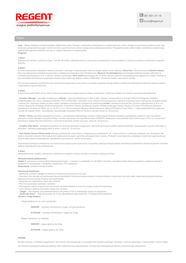 061 851-31-18 [email protected] Program Cypr , Wyspa Afrodyty oczaruje każdego! Malownicze góry Troodos, znaleziska archeologiczne, średniowieczne zamki, odcięte od cywilizacji górskie wioski, lasy cedrowe, pomarańczowe gaje, lokalne winnice i pyszne wina to obraz wymarzonej wakacyjnej podróży. Przepiękne plaże, błękit nieba i krystaliczna woda kuszą zapaleńców sportów wodnych czyniąc to miejsce idealnym na wypoczynek. Program: 1 dzień: Odprawa na lotnisku i przelot na Cypr. Transfer do hotelu, zakwaterowanie, czas wolny na plażowanie lub korzystanie z lokalnych atrakcji w zależności od godzin przylotu. 2 dzień: To czas na poznanie zabytków i atrakcji Limassol – jednego z największych miast na wyspie, gdzie warto zobaczyć Stary Port i Średniowieczny Zamek Kolossi, który początkowo był siedzibą krzyżowców a następnie przeszedł w ręce Templariuszy, Muzeum Archeologiczne prezentujące kolekcję antyków odkrytych w Limassol pochodzących m.in. z neolitu i okresu rzymskiego, Park rzeźb prezentujący aż 16 rzeźb, których autorami są cypryjscy oraz zagraniczni artyści. Rzeźby te były rezultatem dorocznych sympozjów artystycznych, które się odbyły w latach 1999-2001. Powrót do hotelu, czas wolny, nocleg. W przerwach podczas zwiedzania oraz wieczorem proponujemy czas wolny na posiłek, podczas którego będzie możliwość spróbowania lokalnych potraw (płatne indywidualnie wg zamówienia). 3 dzień: Proponujemy jako dzień wolny, który można przeznaczyć na wypoczynek na plaży, korzystanie z lokalnych atrakcji lub udział w wycieczce fakultatywnej: - Larnaka i Nikozja – początek zwiedzania w Nikozji – jedynej podzielonej na dwie części: grecką i turecką stolicy w Europie: Brama Famagusta, Katedra i arcybiskupstwo Św. Jana z wybitnymi freskami, Pomnik Wolności i weneckie mury, Muzeum Archeologiczne z bezcenną kolekcją sztuki starożytnej, przejazd wzdłuż „zielonej linii” dzielącej miasto na dwie części. Następnie przejazd do malowniczo położonej Larnaki: zwiedzanie kościół Św. Łazarza, wybudowany w IX w. na miejscu spoczynku świętego, Dzielnica bazarowa- to świetne miejsce, by poznać zasady i obiekty tutejszego handlu, Muzeum Fundacji Pieridesa ze zbiorami datowanymi na okres od 4000 r. p.n.e. do XV w. n.e., Fort w Larnace i Muzeum Średniowieczne, Meczet Ali Kebira (Cami Kebir) – najprawdopodobniej najstarszy meczet na Cyprze, Kition - pozostałości starożytnego królestwa Kition w Centrum Larnaki (cena ok. 35 euro/os.) - Kurion - Pafos, początek zwiedzania w Kurion – pozostałości starożytnego miasta z imponującym teatrem rzymskim, pozostałości stadionu, łaźni rzymskich i pięknych mozaik. Następnie wizyta w Pafos - mieście wpisanym na Listę Dziedzictwa UNESCO. Zwiedzanie- pozostałości Domu Dionizosa z III w n.e, ze słynnymi mozaikami, katakumby Ayia Solomoni, na koniec bizantyjski zamek oraz port. (cena ok. 40 euro/os.) - Troodos Jeep Safari - fantastyczna podróż na szczyt po skalistych wzgórzach i dolinach sosnowych wzdłuż zawiłych potoków, wodospadów i bujnej roślinności, z widokami i scenerią zapierającą dech w piersi. (cena ok. 75 euro/os) - Park Wodny Fasouri Watermania oferujący atrakcje dla całej rodziny. Znajdują się tu zjeżdżalnie, np. „Czarne Dziury” z wieloma zakrętami czy „Kamikaze” dla osób o mocnych nerwach. Nie brakuje też rajdów pontonowych, ogromnej wirującej miski z wodą („Probowl”) oraz basenów z atrakcjami, takimi jak wspinaczka po ścianie bądź skoki po pływających „plasterkach pomarańczy”. (około 30 euro/os.) W przerwach podczas zwiedzania oraz wieczorami proponujemy czas wolny na posiłek, podczas którego będzie możliwość spróbowania lokalnych potraw i trunków (płatne indywidualnie wg zamówienia). 4 dzień: Wykwaterowanie z hotelu, czas wolny uzależniony od godzin wylotu, transfer na lotnisko, przelot do Polski. Zakwaterowanie podstawowe: Hotele 3* położone w nadmorskiej miejscowości Cypru - Limassol, w odległości ok. 50-400 m od plaży, wszystkie hotele oferują wygodnie urządzone pokoje 2 osobowe (z możliwością 1 dostawki) z łazienkami, TV i telefonem. Wyżywienie: śniadania kontynentalne. Informacje dodatkowe: - Spotkanie z pilotem nastąpi na lotnisku w Polsce lub po przylocie na Cypr. - Transfery z/na lotnisko są realizowane busem/autokarem lub komunikacją miejską i/lub podmiejską w zależności od ilości osób, natomiast przejazdy podczas zwiedzania komunikacją miejską i/lub podmiejską. - Kolejność dni zwiedzania może ulec zmianie. - Pilot nie oprowadza wewnątrz obiektów. - W przypadku wylotu w godzinach porannych zamiast śniadania może być wydany pakiet śniadaniowy. - Linia lotnicza i godziny przelotów mogą ulec zmianie. - „Single” - bez dopłaty, przy dokwaterowaniu do pokoju 2 lub 3 osobowego (opcja na zapytanie). - „Zniżki dla dzieci” - dotyczą dziecka do 12 lat zakwaterowanego wspólnie z 2 osobami pełnopłatnymi. wymiary i waga bagażu: - Bagaż podręczny (w cenie wycieczki): - WIZZAIR – wymiary: 42x32x25cm, waga: nie jest określona - RYANAIR – wymiary: 55x40x20cm, waga: do 10 kg -Bagaż rejestrowy (za dopłatą): - WIZZAIR – bagaż główny do 23kg - RYANAIR – bagaż główny do 15kg WAŻNE: Bardzo prosimy o dokładne wypełnianie formularza rezerwacyjnego w szczególności podania pełnego nazwiska i imienia zgodnego z dokumentem, którym będą się Państwo posługiwali podczas podróży, daty urodzenia oraz obywatelstwa. Prosimy też o sprawdzenie terminu ważności tego dokumentu. Cena zawiera - przelot samolotem na wybranej trasie - opłaty i podatki lotniskowe - koszt bagażu podręcznego - 3 noclegi w hotelu 3* - zakwaterowanie w pokoju 2-osobowym - 3 śniadania - program zwiedzania Limassol z pilotem - opiekę polskojęzycznego pilota/przedstawiciela Regent - podstawowe ubezpieczenie KL, NW, bagaż - gwarancja niezmienności ceny Cena 